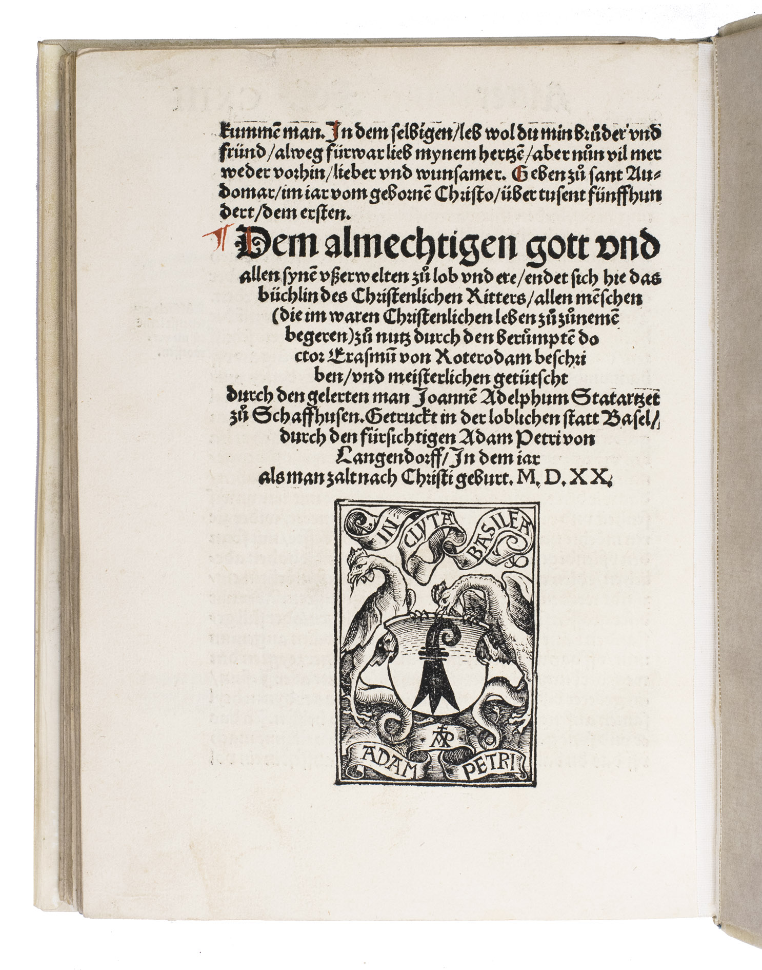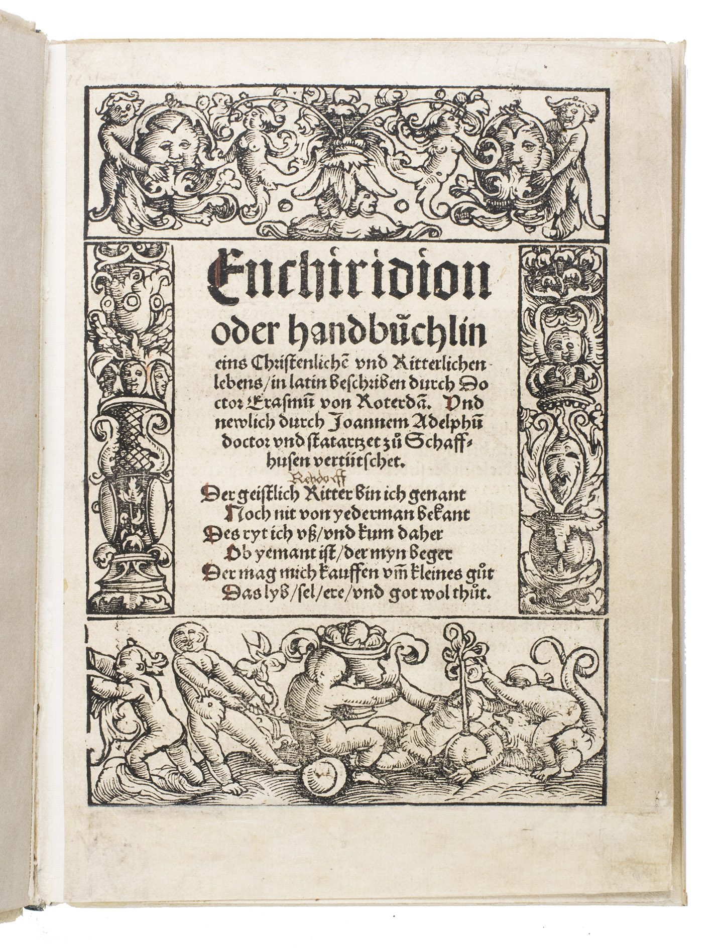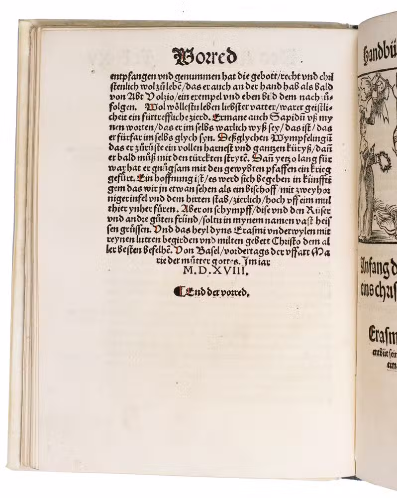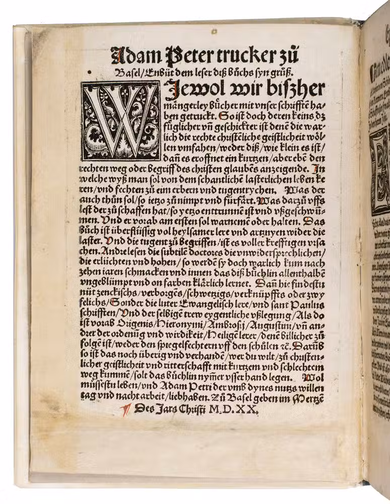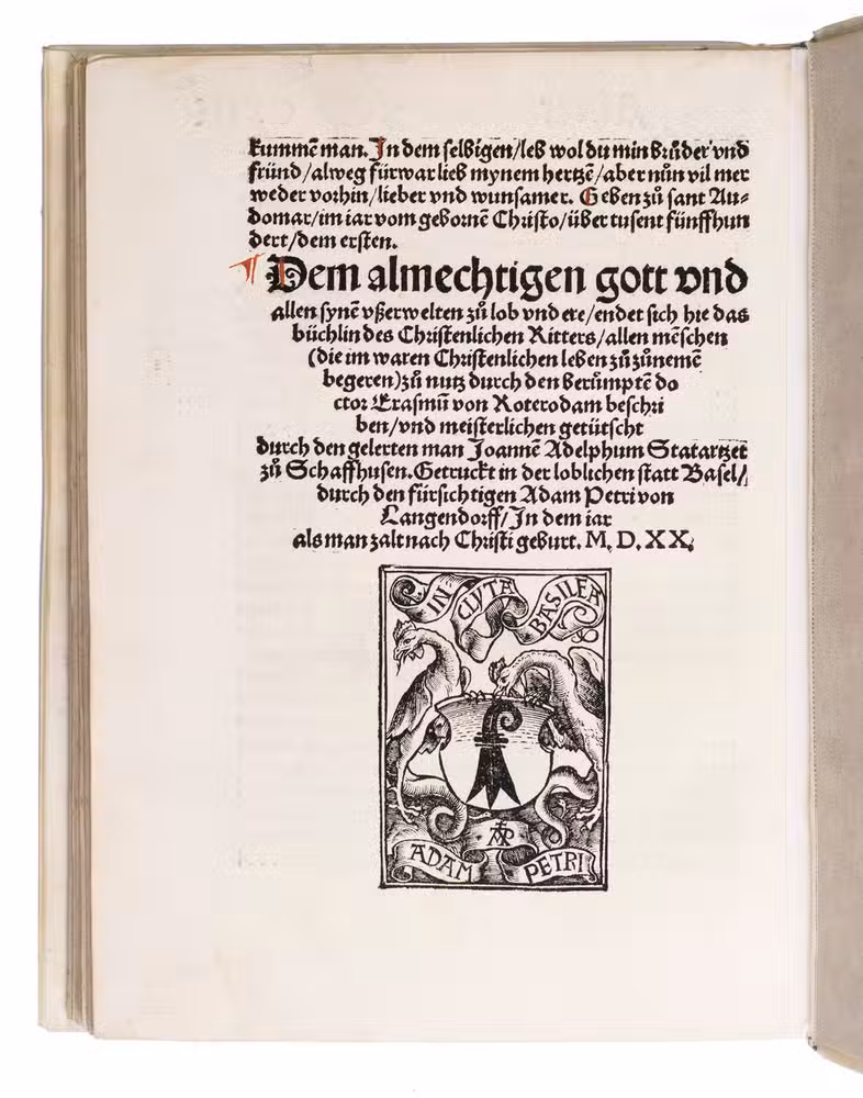 The translator, Joannes Adelphus Mülich (or Müling), was physician of the town of Schaffhausen; he made the translation at the request of Beatus Rhenanus.The present 1520 Basel edition, handsomely produced by Adam Petri with rich woodcut ornamentation, brought the Enchiridion to a broader German-speaking audience at a time of intense religious ferment.