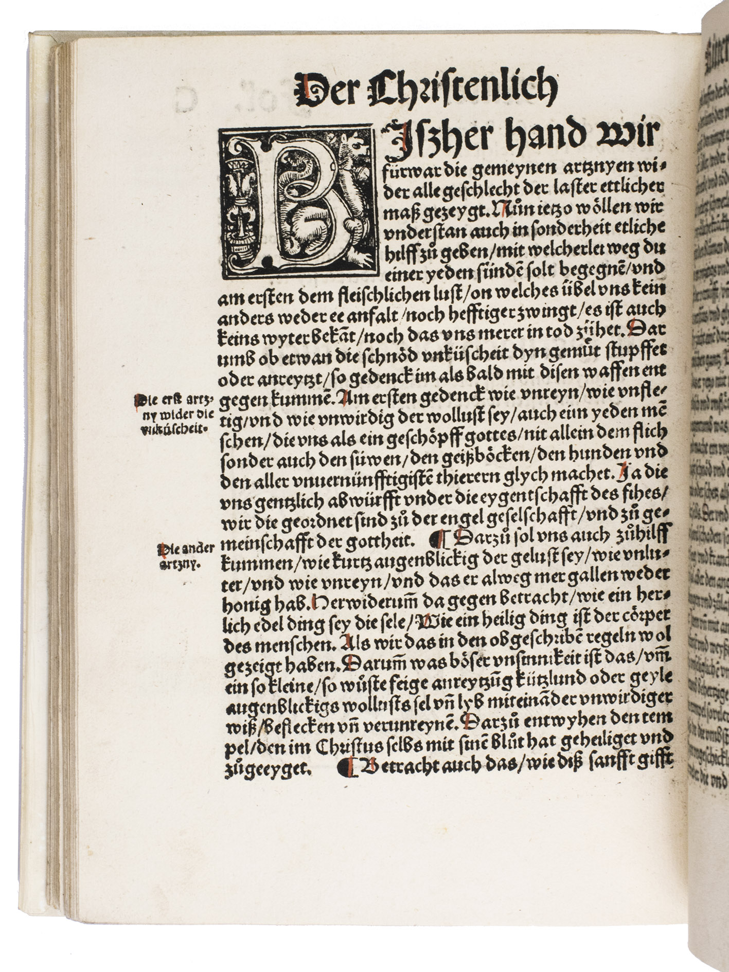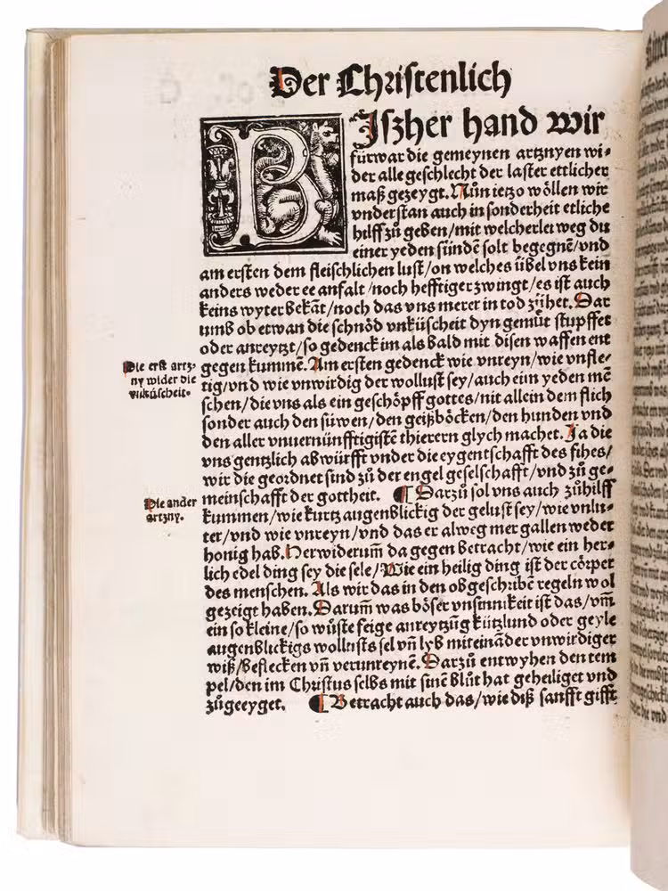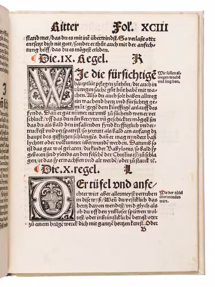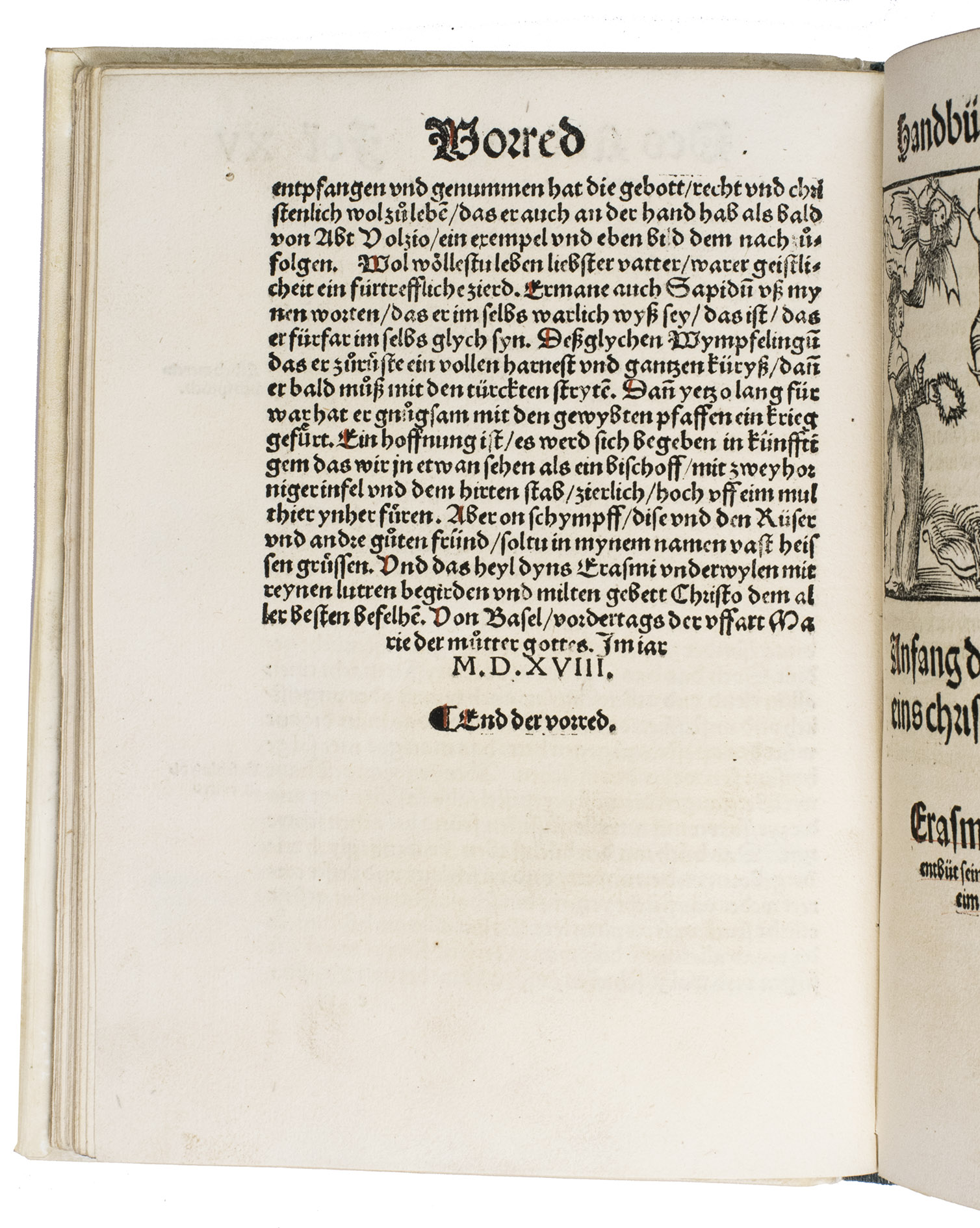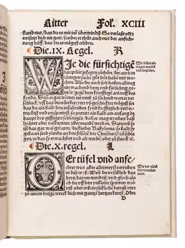 The translator, Joannes Adelphus Mülich (or Müling), was physician of the town of Schaffhausen; he made the translation at the request of Beatus Rhenanus.The present 1520 Basel edition, handsomely produced by Adam Petri with rich woodcut ornamentation, brought the Enchiridion to a broader German-speaking audience at a time of intense religious ferment.