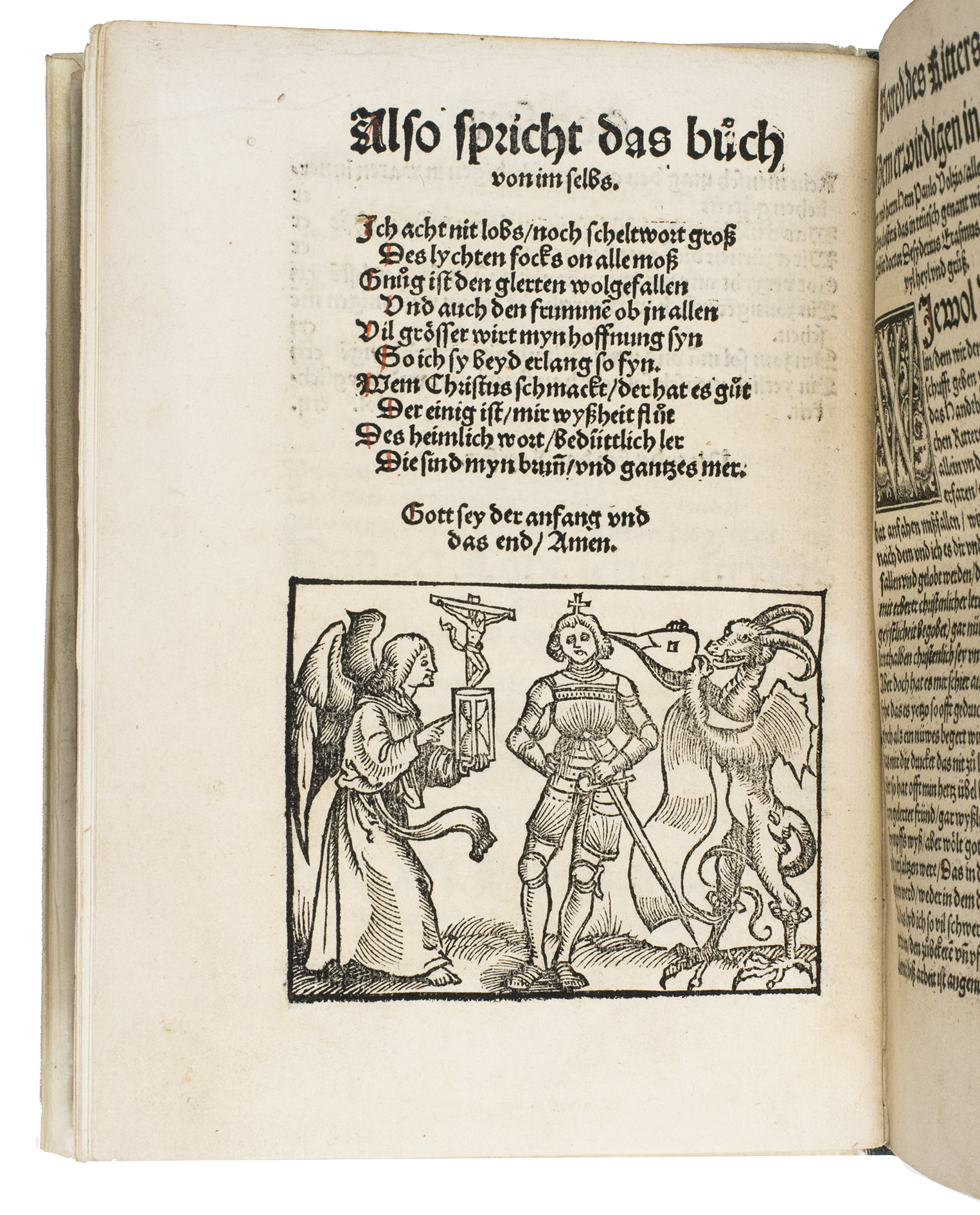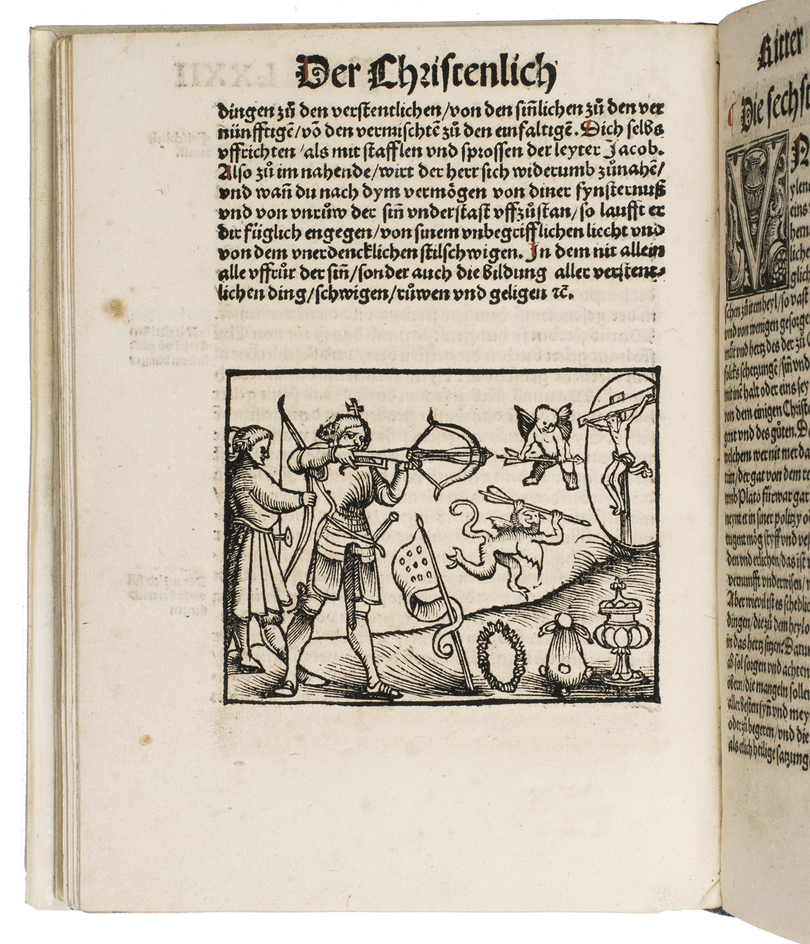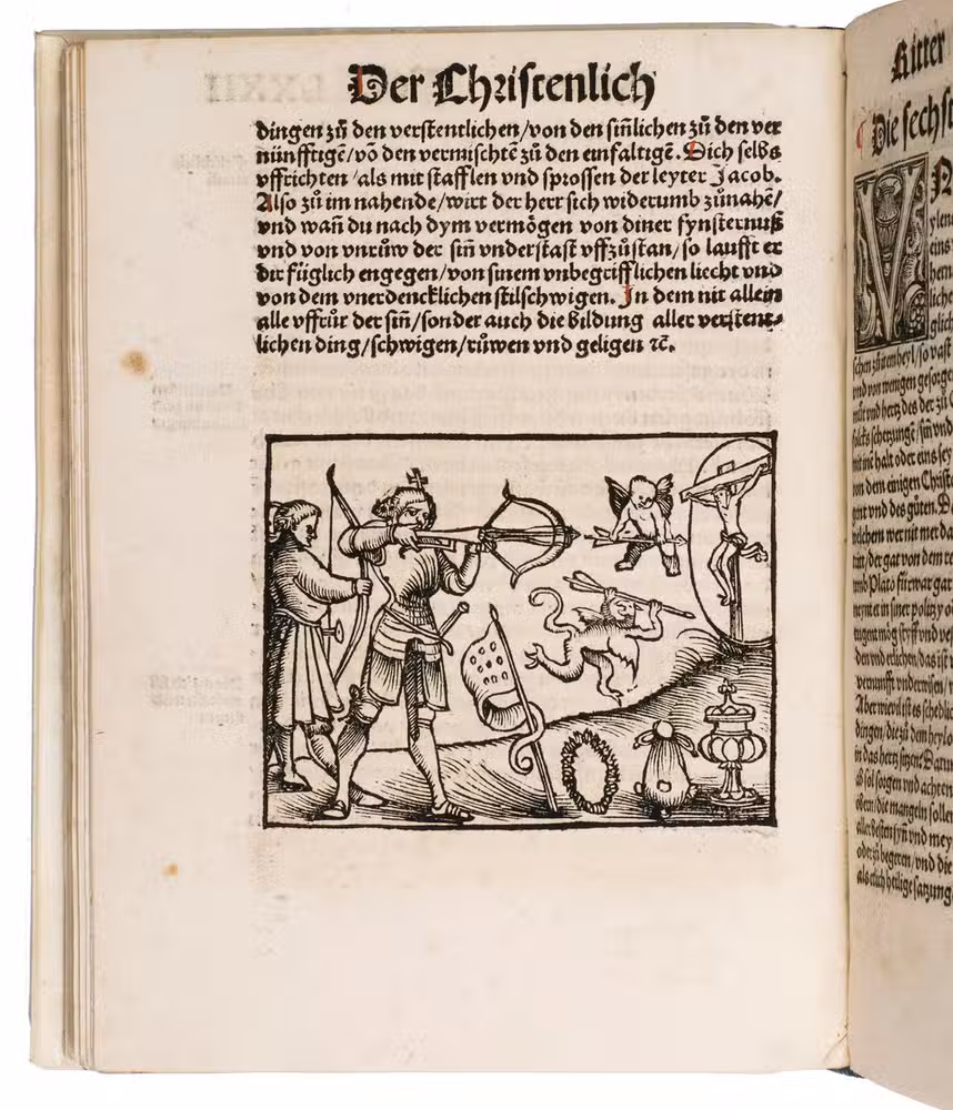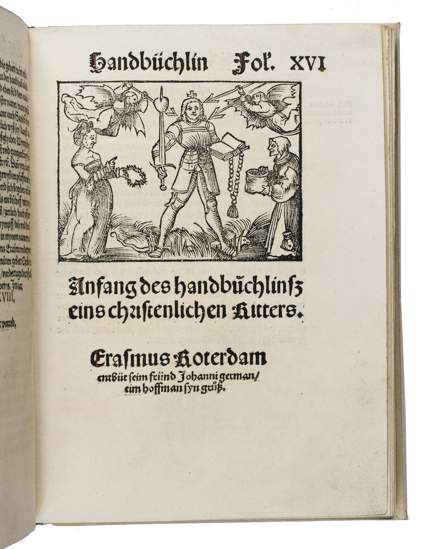 First German edition of Erasmuss Enchiridion militis christiani, one of his most celebrated and influential works, here translated by the Strasbourg humanist Johannes Adelphus (ca. 1480s-ca. 1523). Erasmus began writing the Enchiridion around 1501 in Paris while fleeing from the plague, and completed it some years later in Leuven.