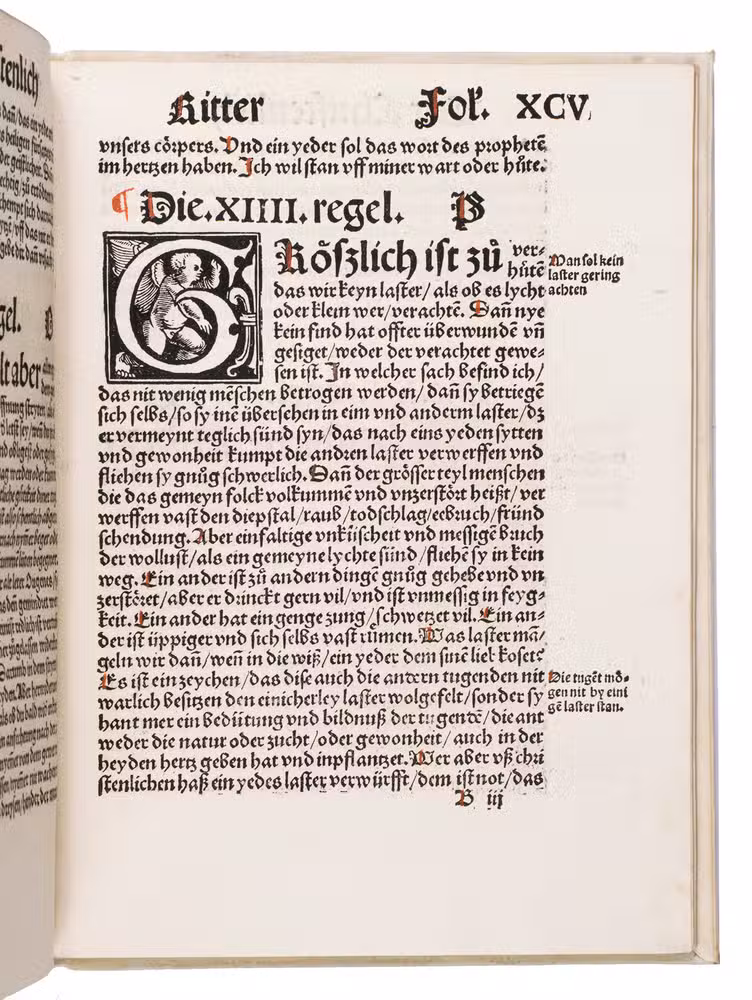 (Colophon) Basel, Adam Petri, 1520. 4to. With an elaborate woodcut border by Hans Franck on the title page, 5 half-page woodcut illustrations (including 1 repeat) in the text, Petris device by Urs Graf below the colophon, and several large decorated woodcut initials. The text is rubricated throughout. Modern overlapping vellum, grey endpapers. [10], CXIII ll.