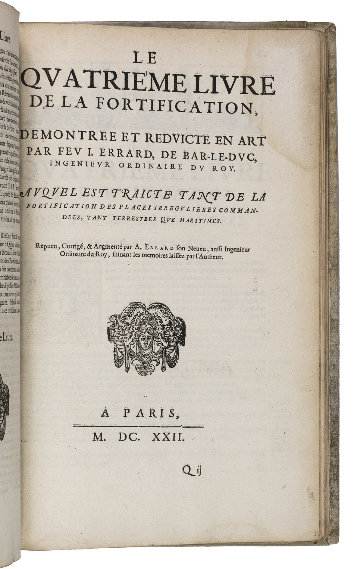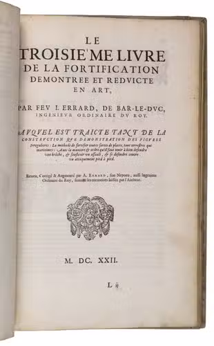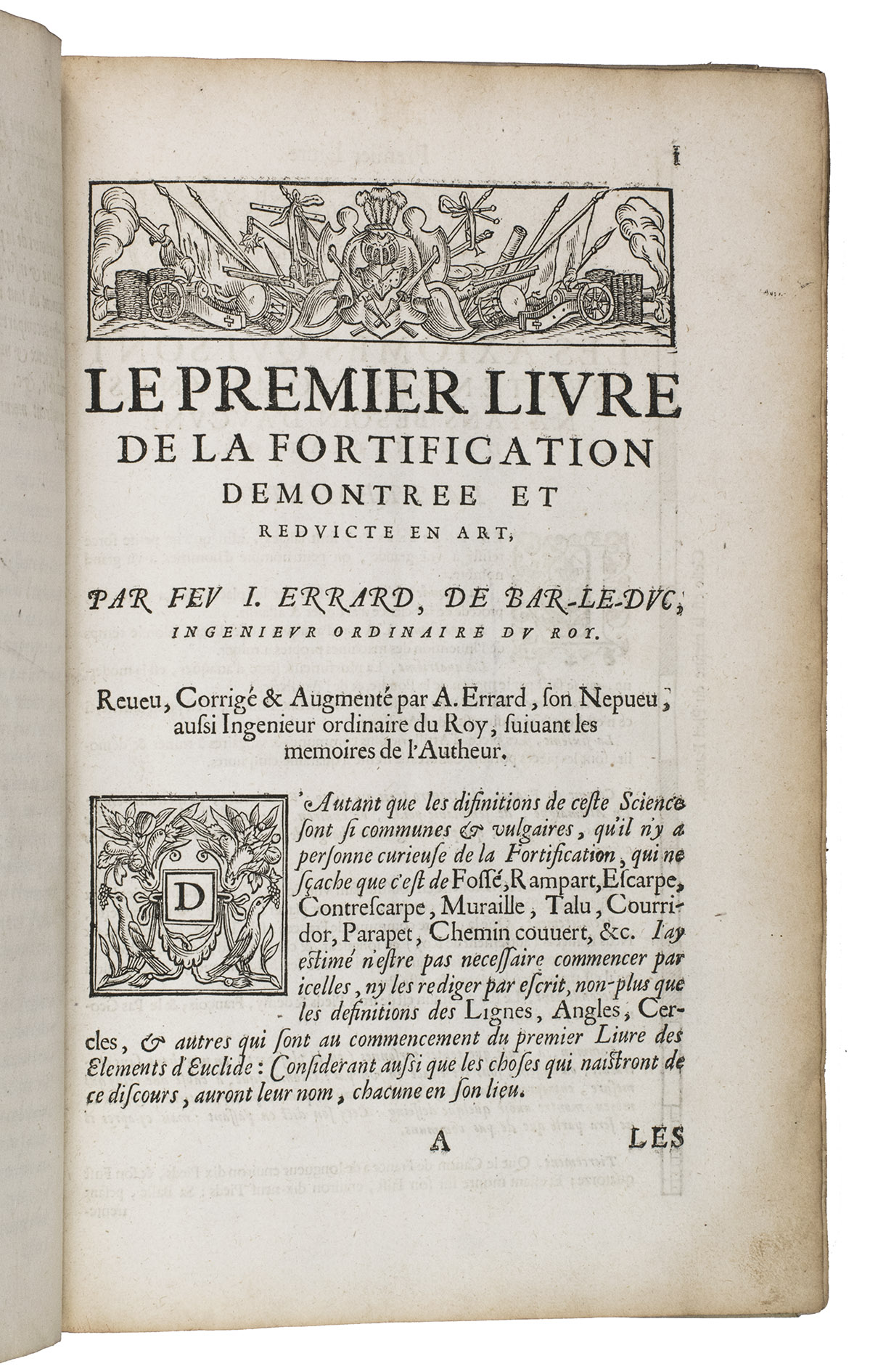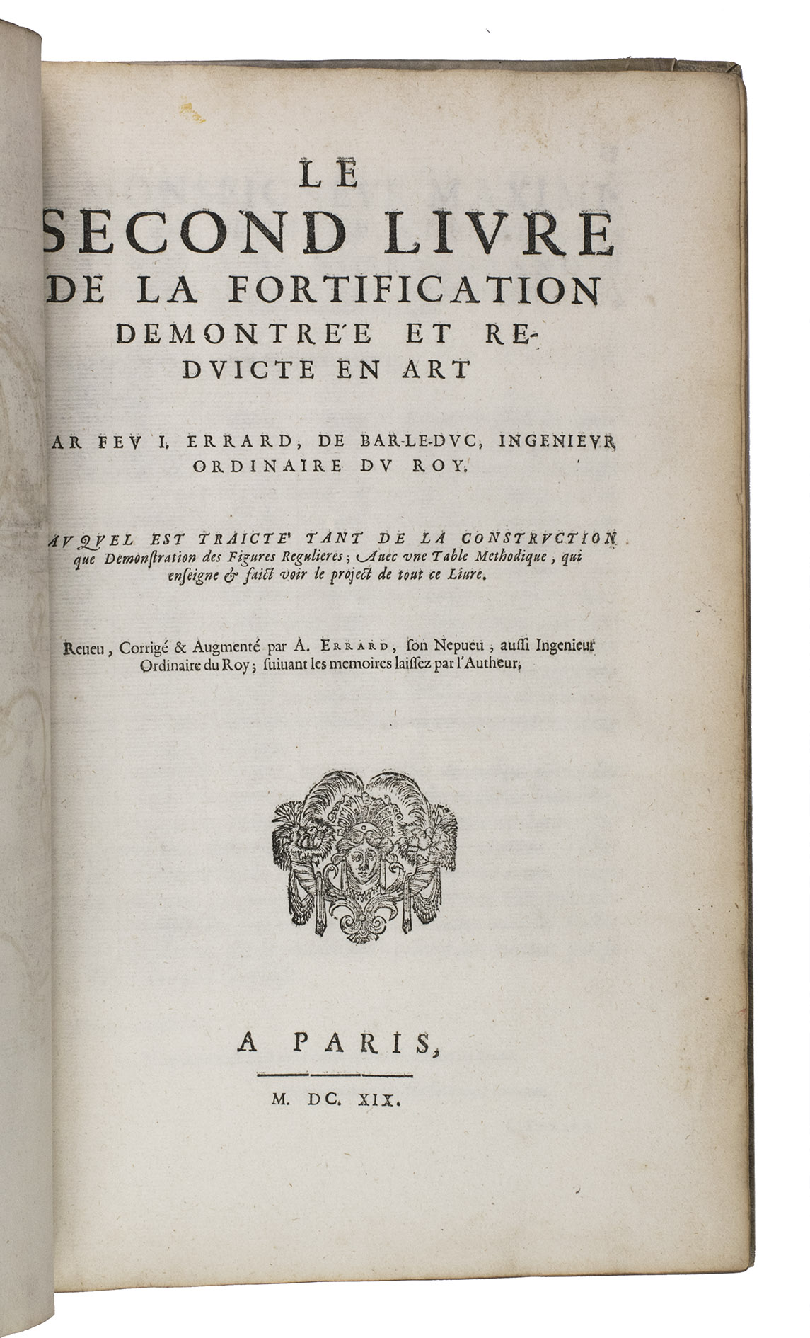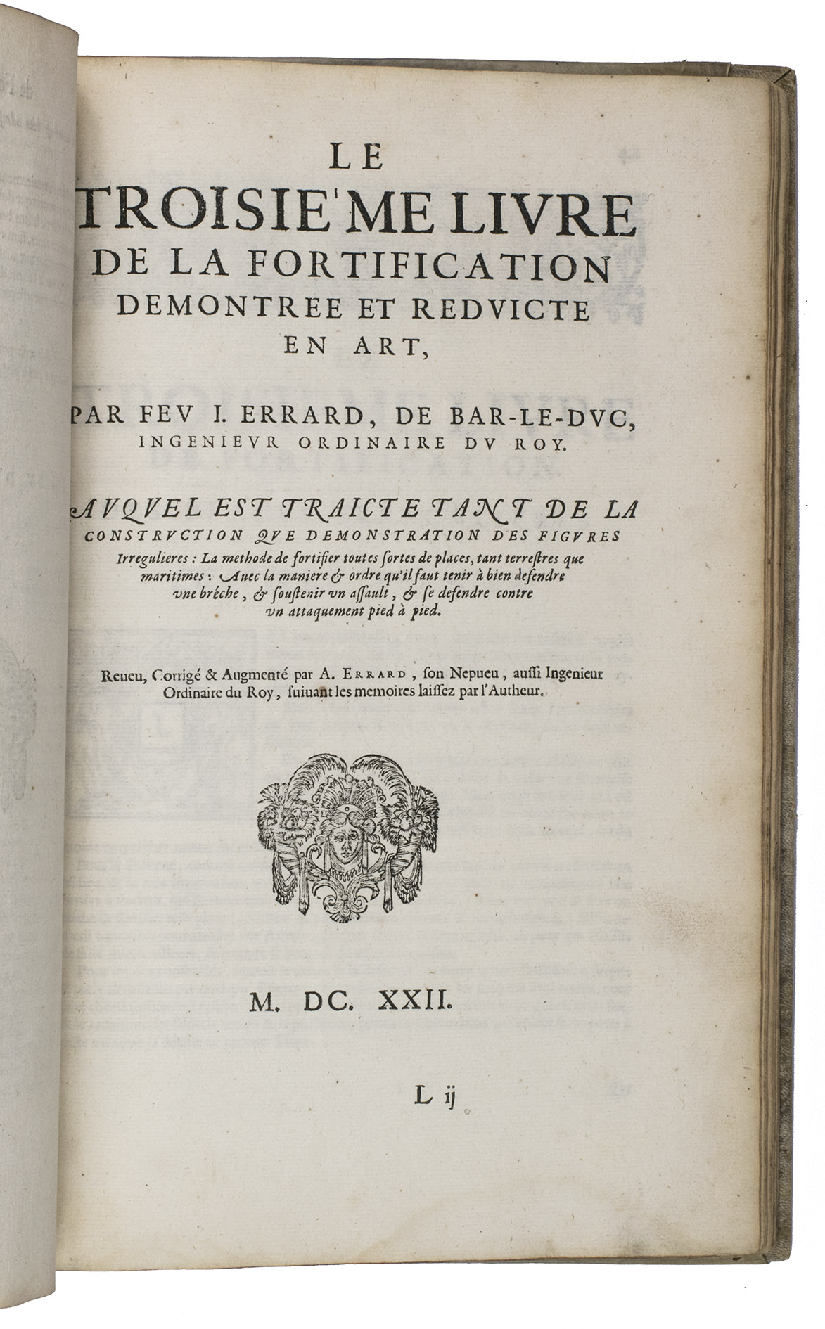 The first and only edition printed in the Netherlands, with a false Paris imprint and not previously recognized, of "the first independent French work on fortification" (Jähns), by Jean Errard, mathematician and official military engineer to King Henri IV. The four "livres" give a general introduction, an account of regular (symmetrical) fortifications, irregular fortifications and fortifications at the edge of a hill, mountain or sea. The emphasis is on design and geometric construction, rather than the mechanics of building. It remained the French standard work on the subject until superseded by Vauban's work beginning in the 1670s, but even Vauban shows Errard's influence very clearly. There appears to be no copy in any Dutch library.
