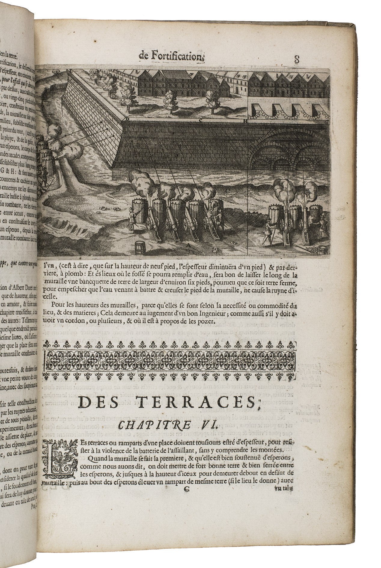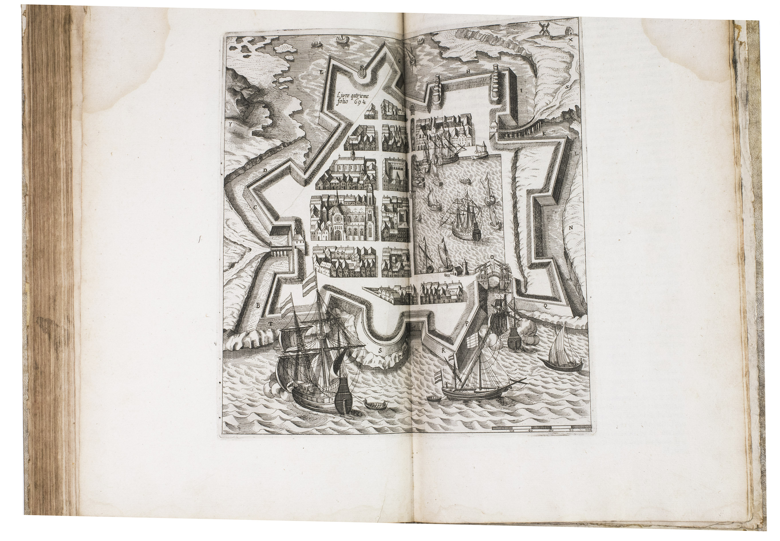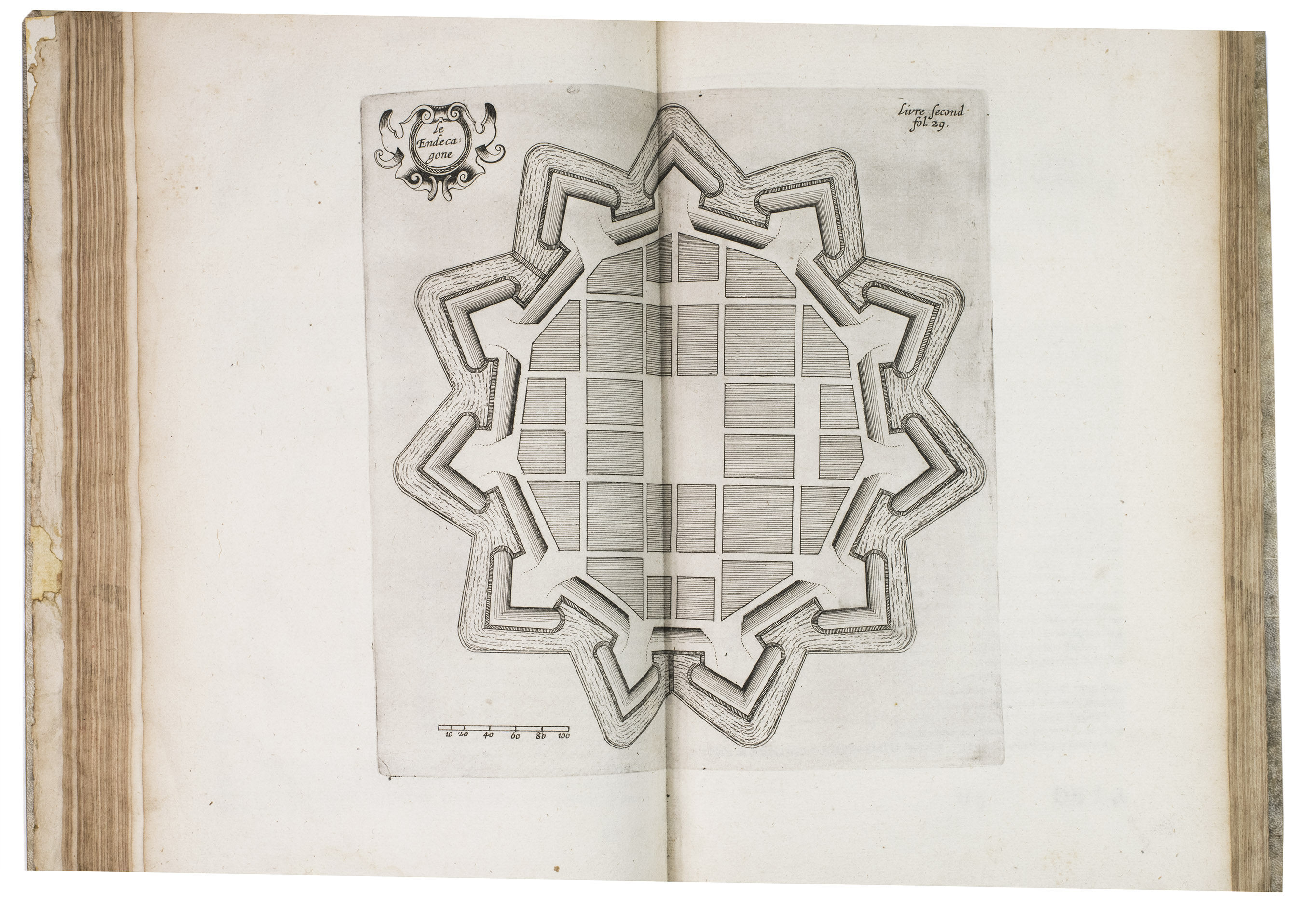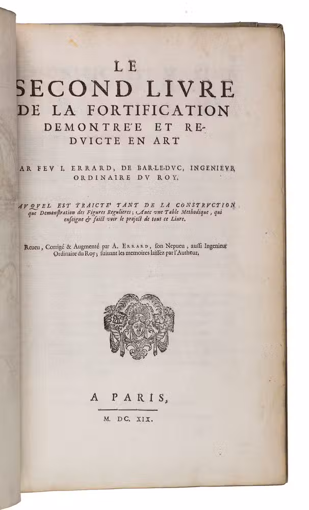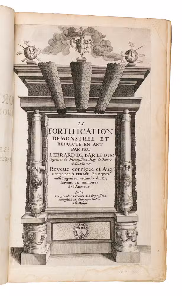 The first and only edition printed in the Netherlands, with a false Paris imprint and not previously recognized, of "the first independent French work on fortification" (Jähns), by Jean Errard, mathematician and official military engineer to King Henri IV. The four "livres" give a general introduction, an account of regular (symmetrical) fortifications, irregular fortifications and fortifications at the edge of a hill, mountain or sea. The emphasis is on design and geometric construction, rather than the mechanics of building. It remained the French standard work on the subject until superseded by Vauban's work beginning in the 1670s, but even Vauban shows Errard's influence very clearly. There appears to be no copy in any Dutch library.