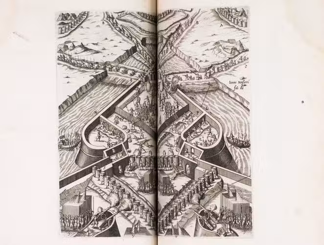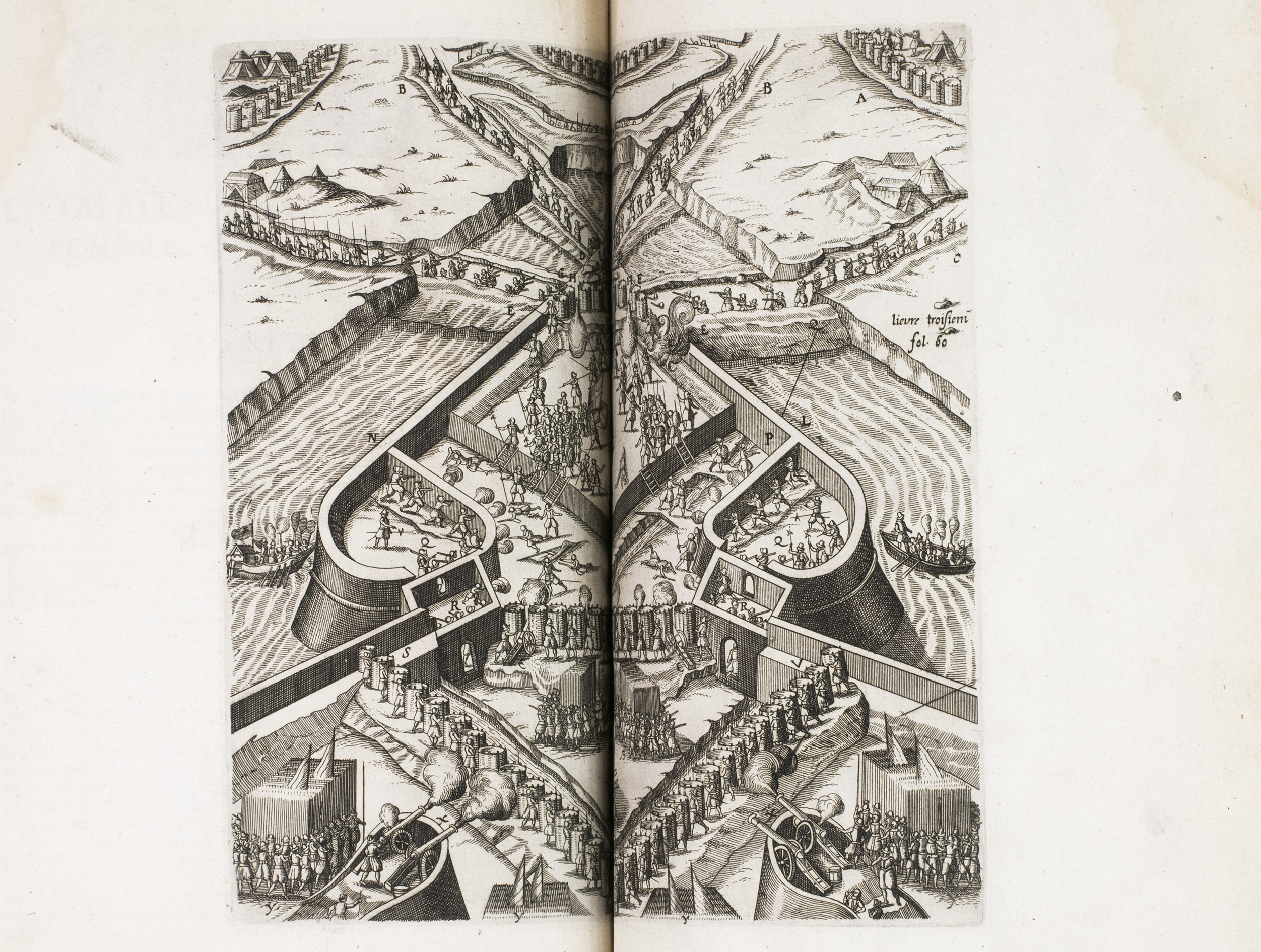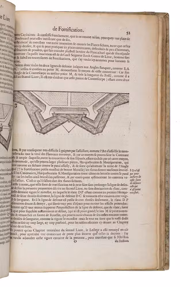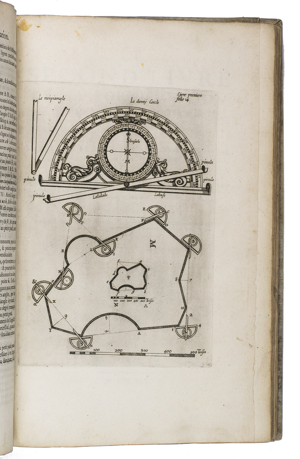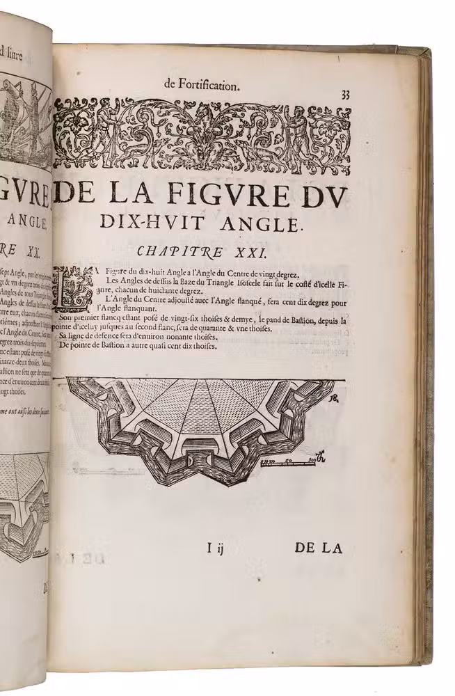 The first and only edition printed in the Netherlands, with a false Paris imprint and not previously recognized, of "the first independent French work on fortification" (Jähns), by Jean Errard, mathematician and official military engineer to King Henri IV. The four "livres" give a general introduction, an account of regular (symmetrical) fortifications, irregular fortifications and fortifications at the edge of a hill, mountain or sea. The emphasis is on design and geometric construction, rather than the mechanics of building. It remained the French standard work on the subject until superseded by Vauban's work beginning in the 1670s, but even Vauban shows Errard's influence very clearly. There appears to be no copy in any Dutch library.