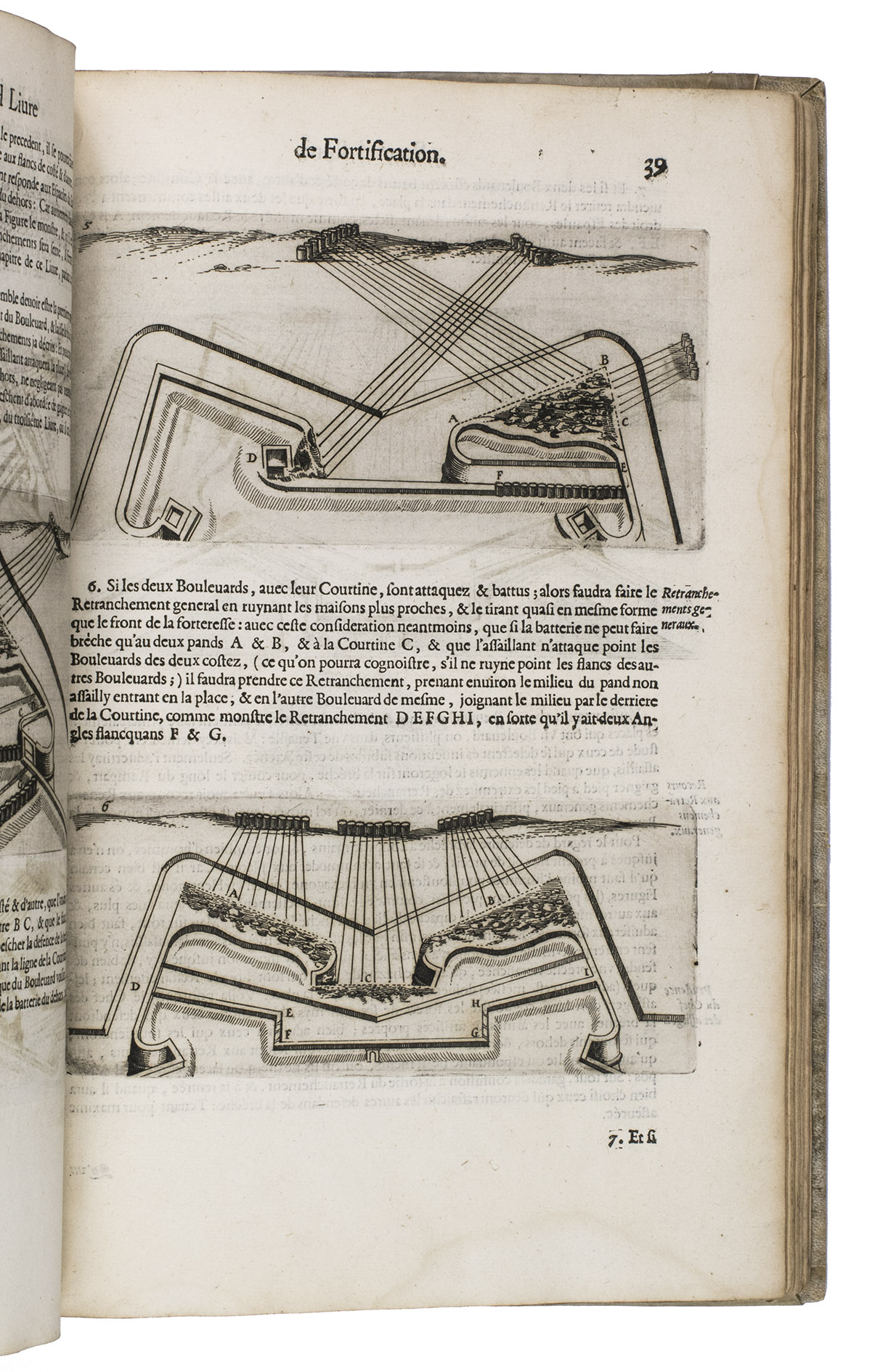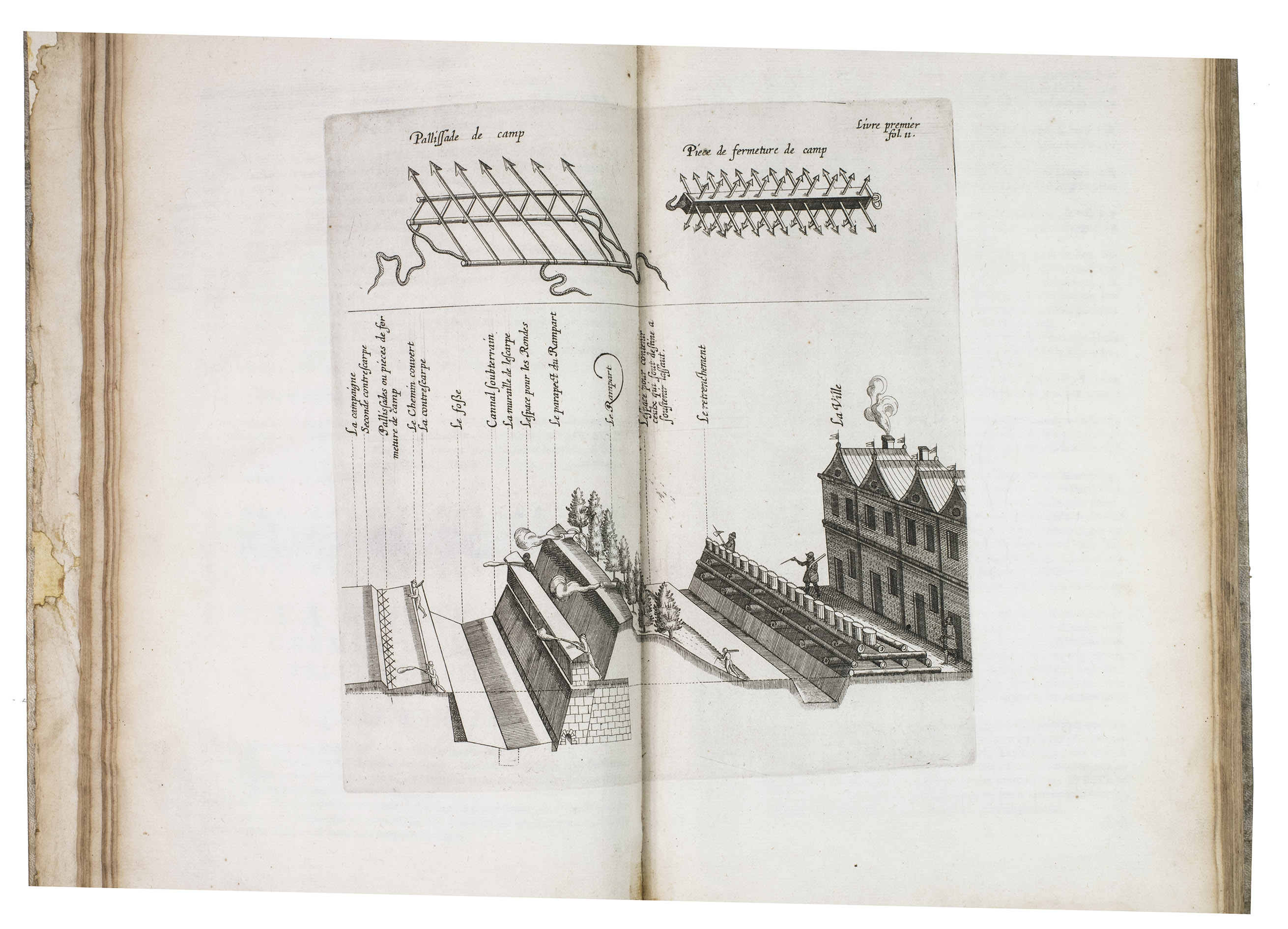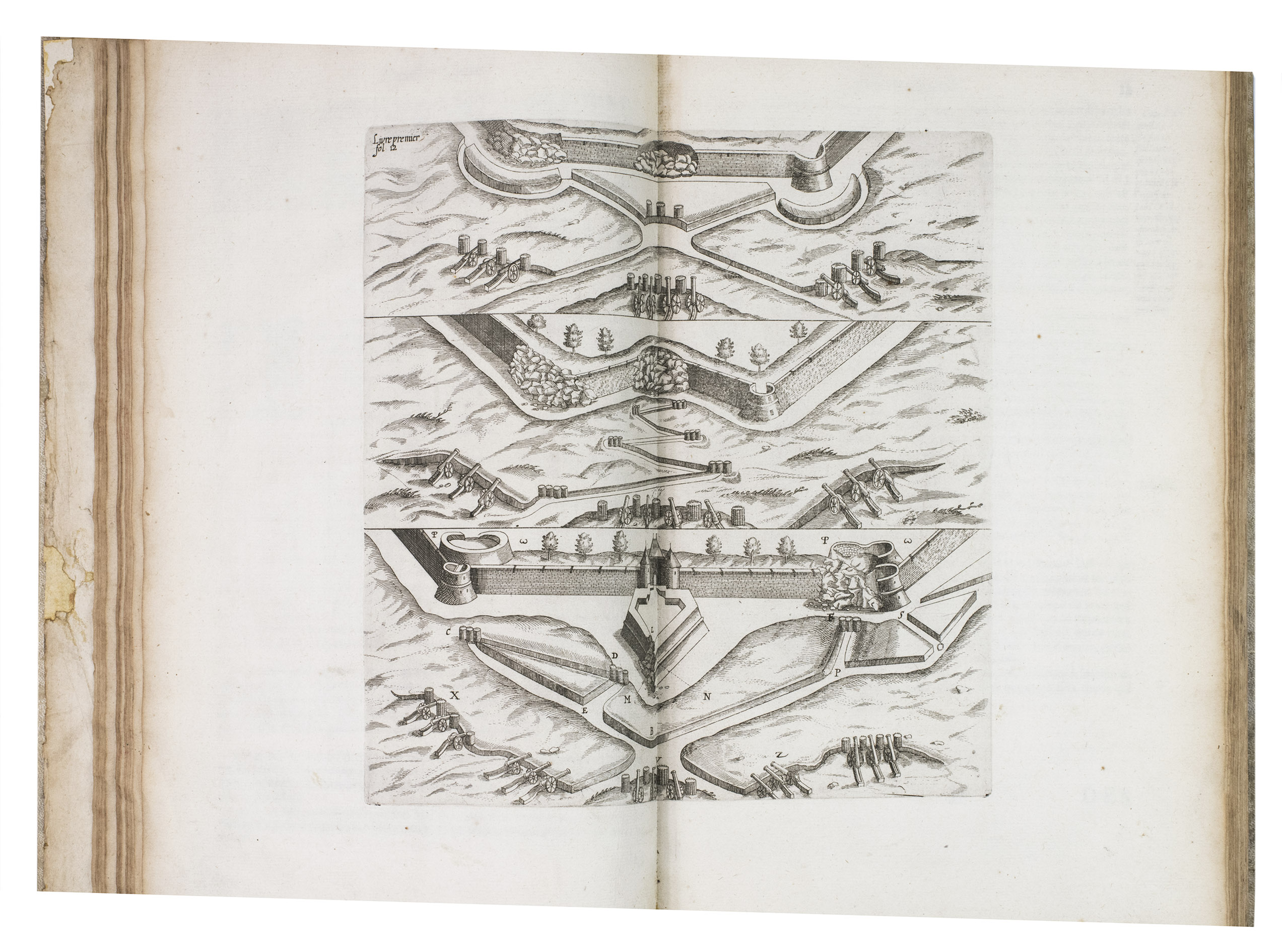 With minor and mostly marginal water stains (reaching the corner of the text in the last two quires), occasional marginal tears and an occasional crease, but still in good condition. The binding shows a few stains, and old sheepskin parchment restorations on the fore-edge, but is structurally sound as refurbished. The only Netherlands edition, in the original French, of a seminal classic of French fortification. Berlin Kat. 3518; Cockle 802 note; Jordan 1066 (7 copies); cf. Jähns, pp. 832-833; Sloos, Warfare 8008; not in STCN.