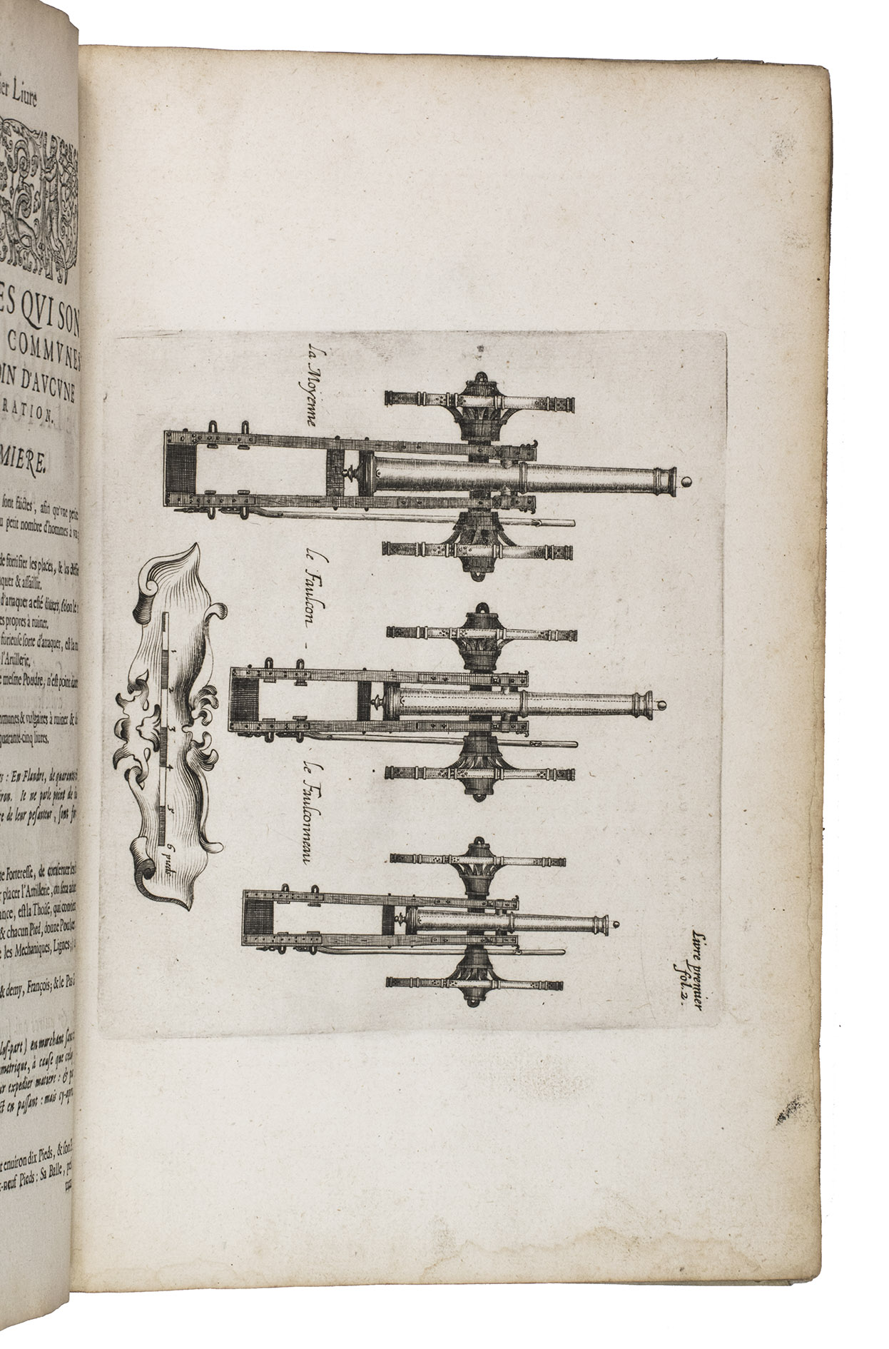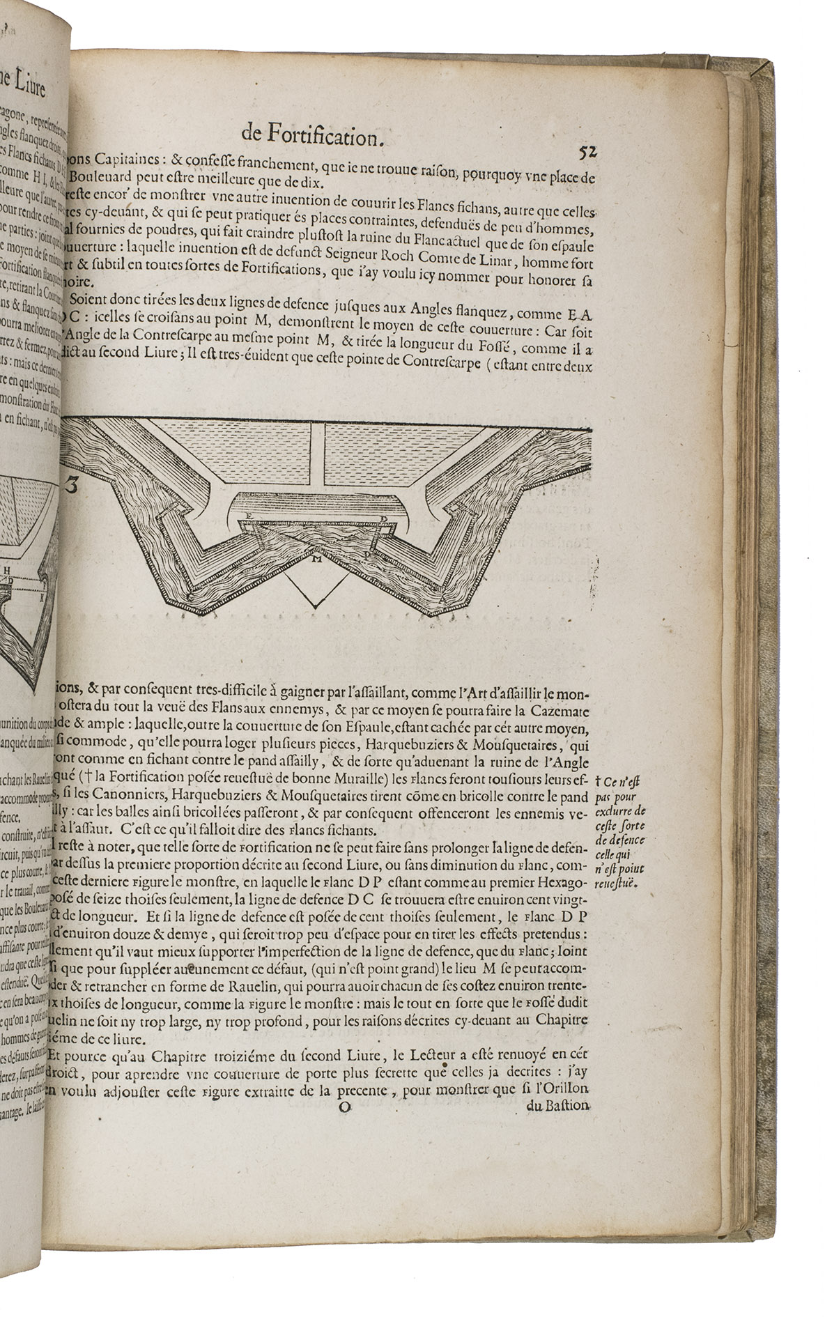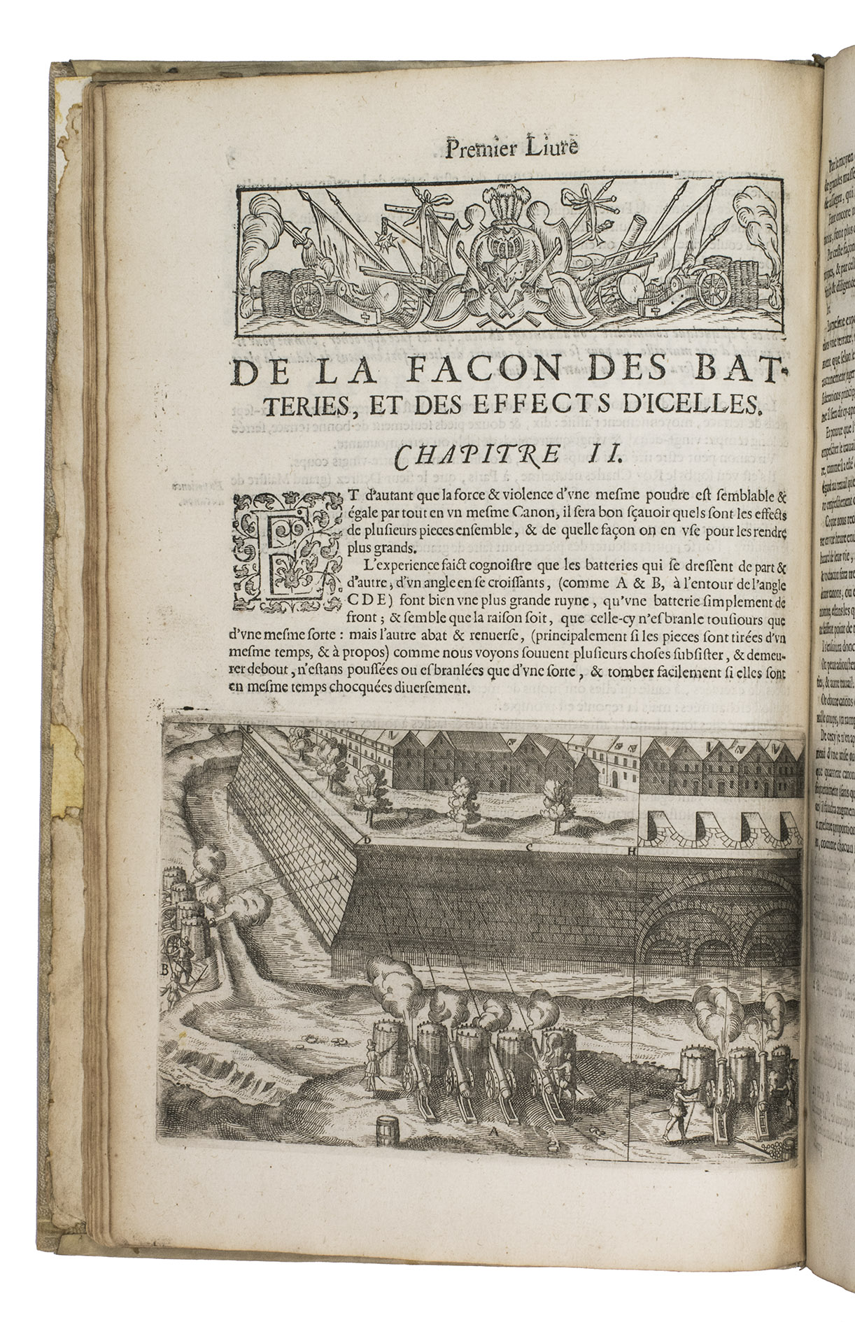 With minor and mostly marginal water stains (reaching the corner of the text in the last two quires), occasional marginal tears and an occasional crease, but still in good condition. The binding shows a few stains, and old sheepskin parchment restorations on the fore-edge, but is structurally sound as refurbished. The only Netherlands edition, in the original French, of a seminal classic of French fortification. Berlin Kat. 3518; Cockle 802 note; Jordan 1066 (7 copies); cf. Jähns, pp. 832-833; Sloos, Warfare 8008; not in STCN.