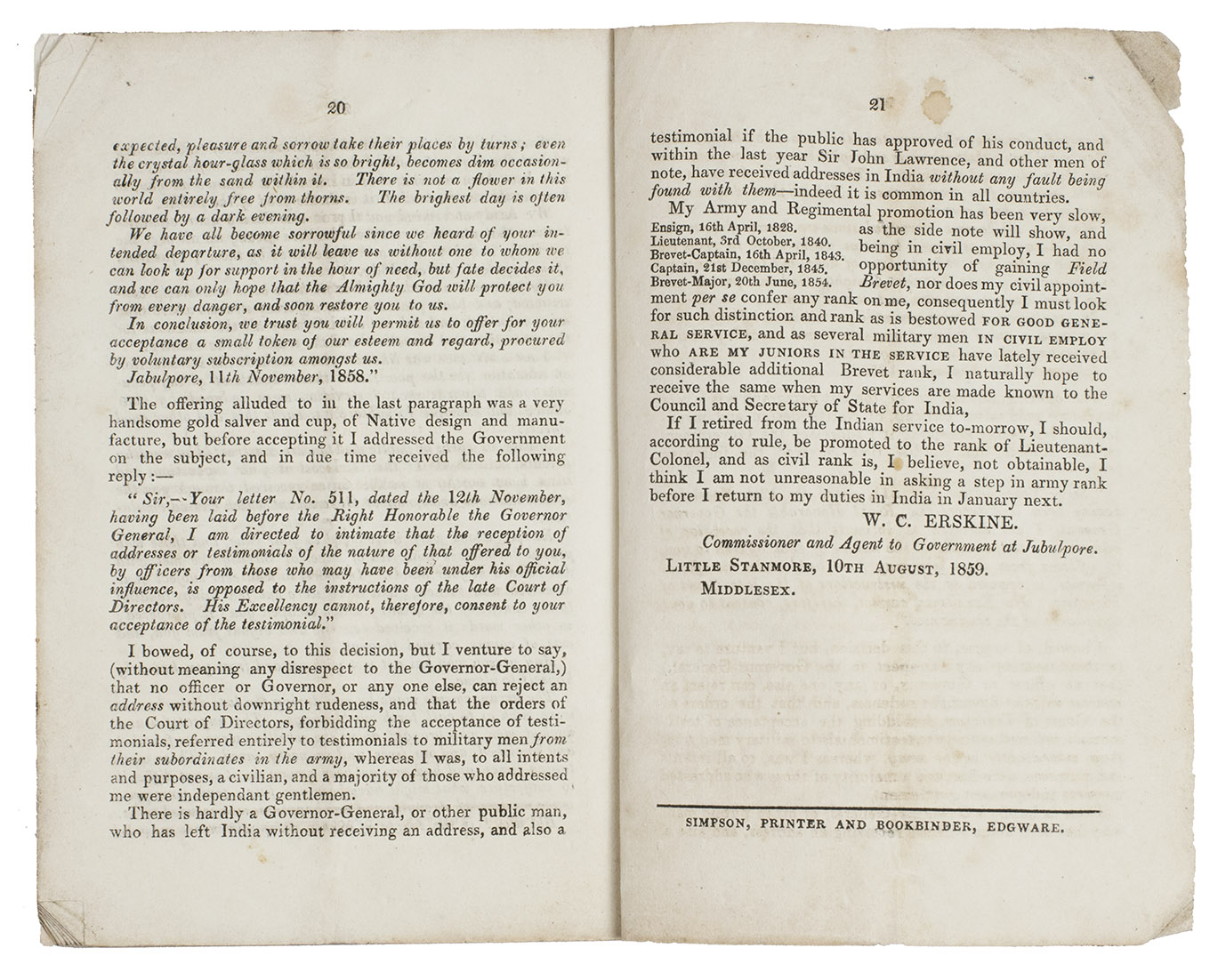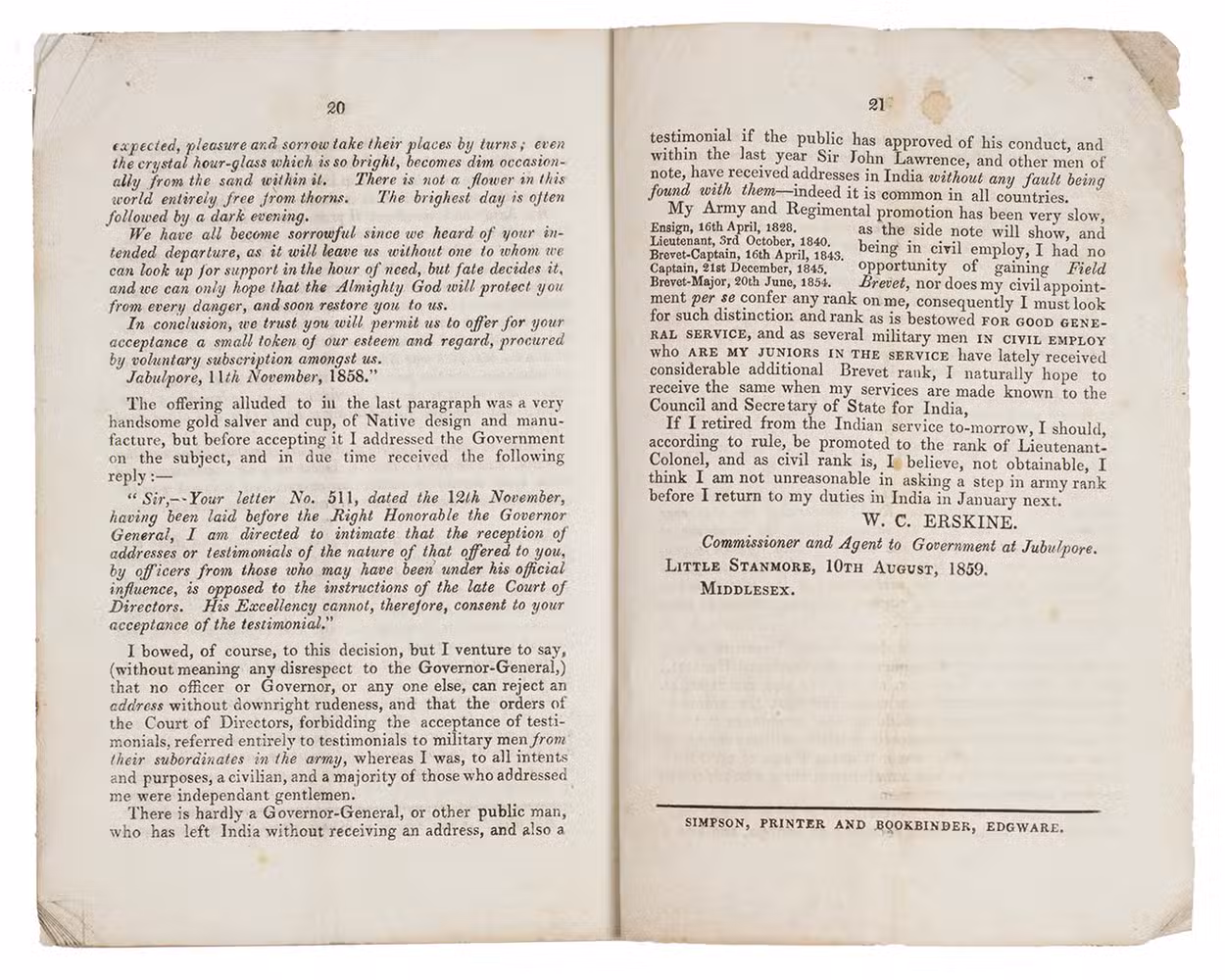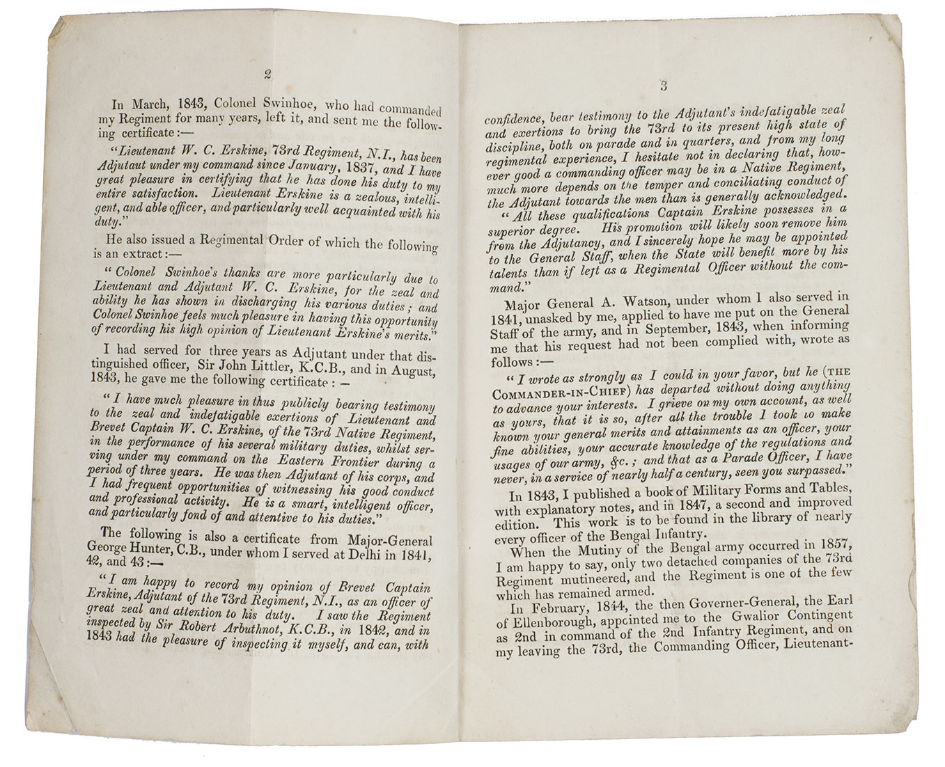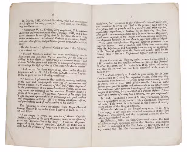What Erskine had achieved during his around 30 years in service in India was remarkable. In the beginning of his professional life, he performed simple military duties during his first years in the army and was selected by Lord Auckland Governor General to duty with a local corps in Assam and the promise of a civilian appointment thereafter, He declined the appointment, opting for life in the military instead where he eventually became Brevet Captain.