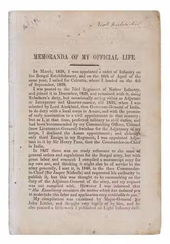 The Memoranda of my official life by Walter Coningsby Erskine, 12th Earl of Kellie (1810-1872) is a unique insight into the life of a British officer and administrator in India in the middle of the nineteenth century. Erskine wrote this account of his life in 1859 after returning to England for a brief period. He recounts his life in the army and later civilian authority in India and petition to the Council and Secretary of State for India for the promotion to Lieutenant-General. This book is an extremely rare example of an account of the life of a British official returning from service to India.