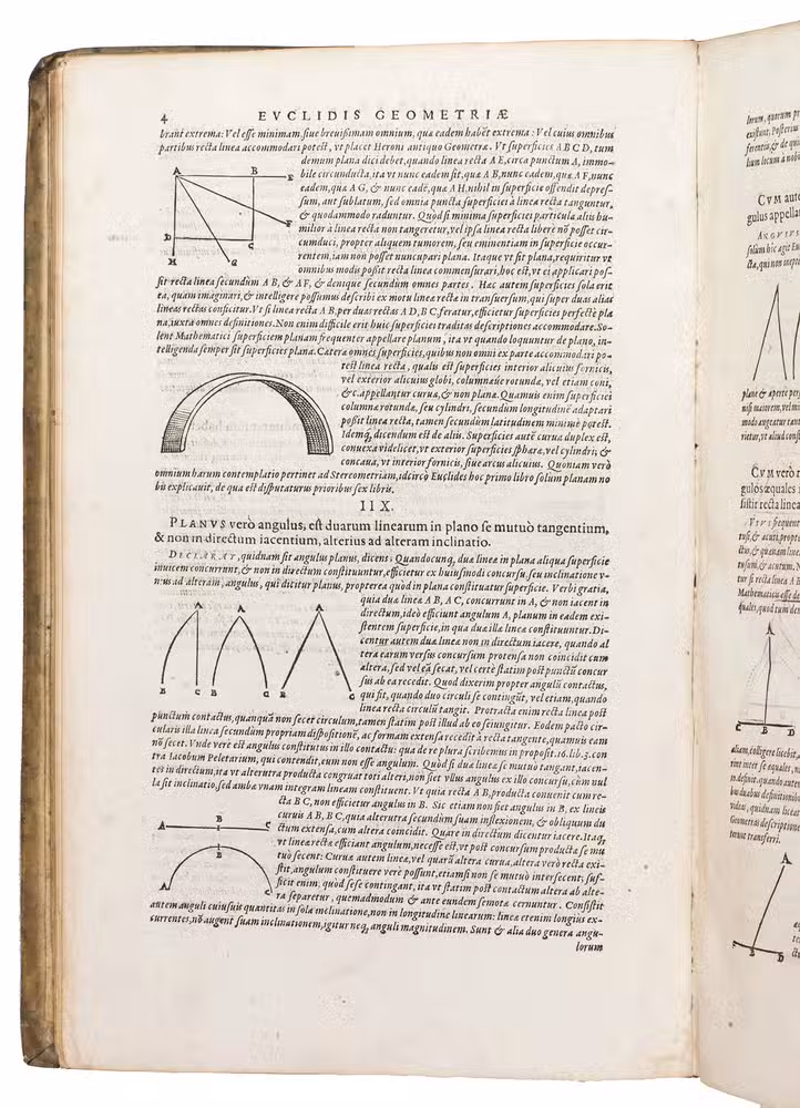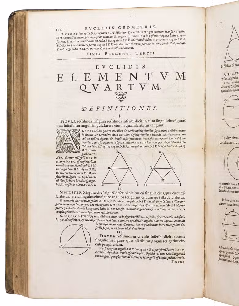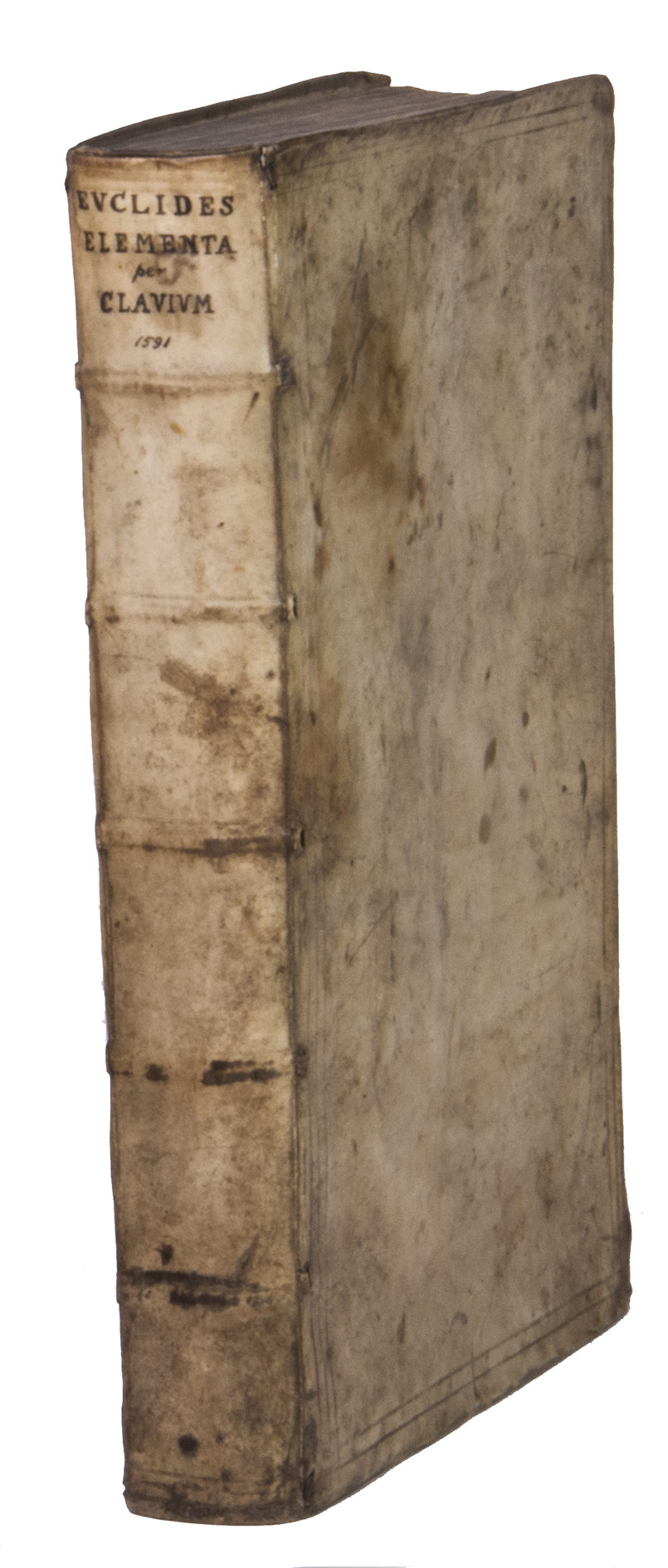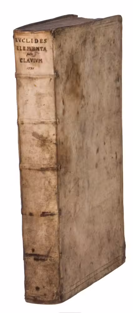 With a later manuscript owners inscription on the front pastedown ("Carl Hollweide, Halle 1802"), the same inscription underneath which has been removed, and an owner's inscription from mathematician Moritz Wilhelm Drobisch (1802-1896) on the recto of the first flyleaf ("M. W. Drobisch. 1824"), all in brown ink. The vellum is somewhat scratched, scuffed, and stained, the corners of the boards are bumped. The vignette has been cut out of the title page, but the hole has been repaired with paper and bears a manuscript note in pencil, the title page and the first blank flyleaf have been reinforced with paper in the lower outer corner, the title page is slightly dust soiled, some occasional stains, a large tear in the bottom margin of leaves G6 in part 1, and Kk4-Kk6 in part 2. Otherwise in good condition. Adams E 988; De Backer-Sommervogel II, col. 1213-1214; Thomas-Stanford 23; USTC 654843; VD 16 E 4161 (part 1) and VD 16 ZV 5466 (part 2); cf. DSB 3, pp. 311-312 (Clavius); DSB 4, pp. 414-459 (Euclid); Poggendorff I, p. 455 (Clavius).