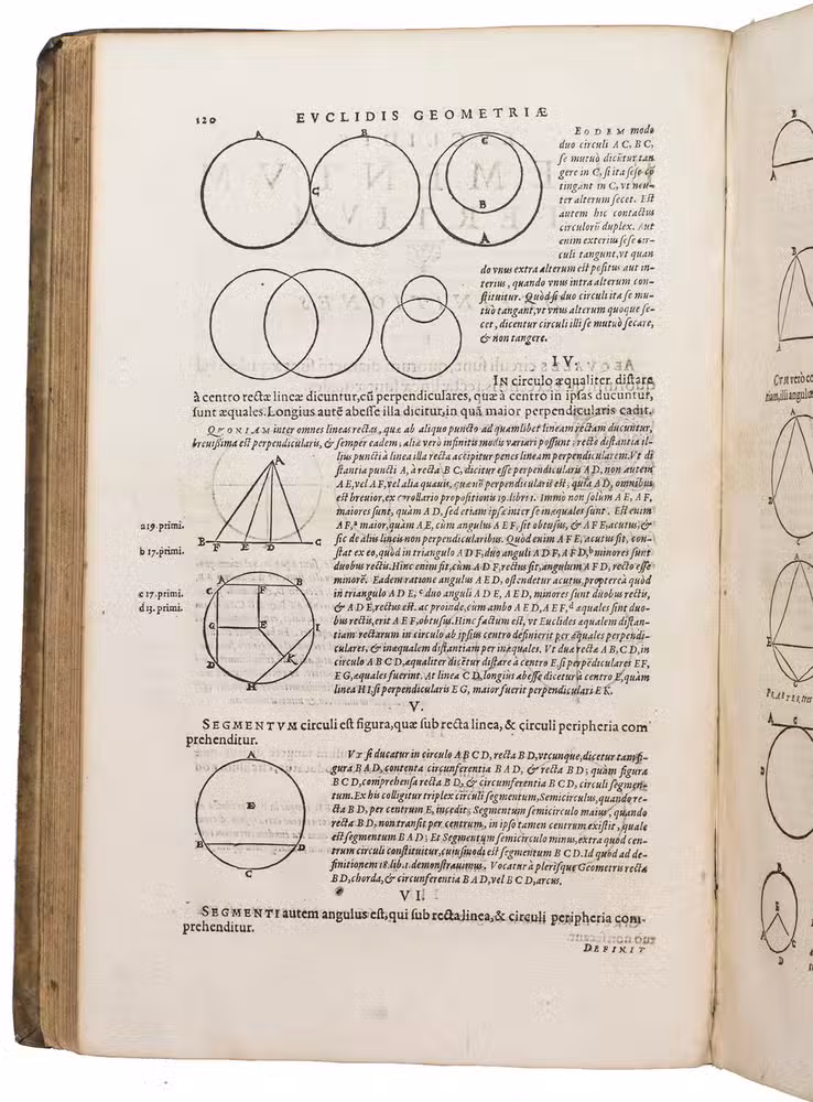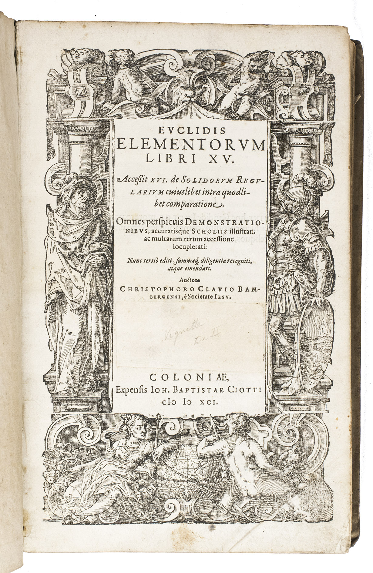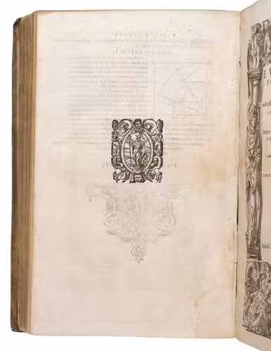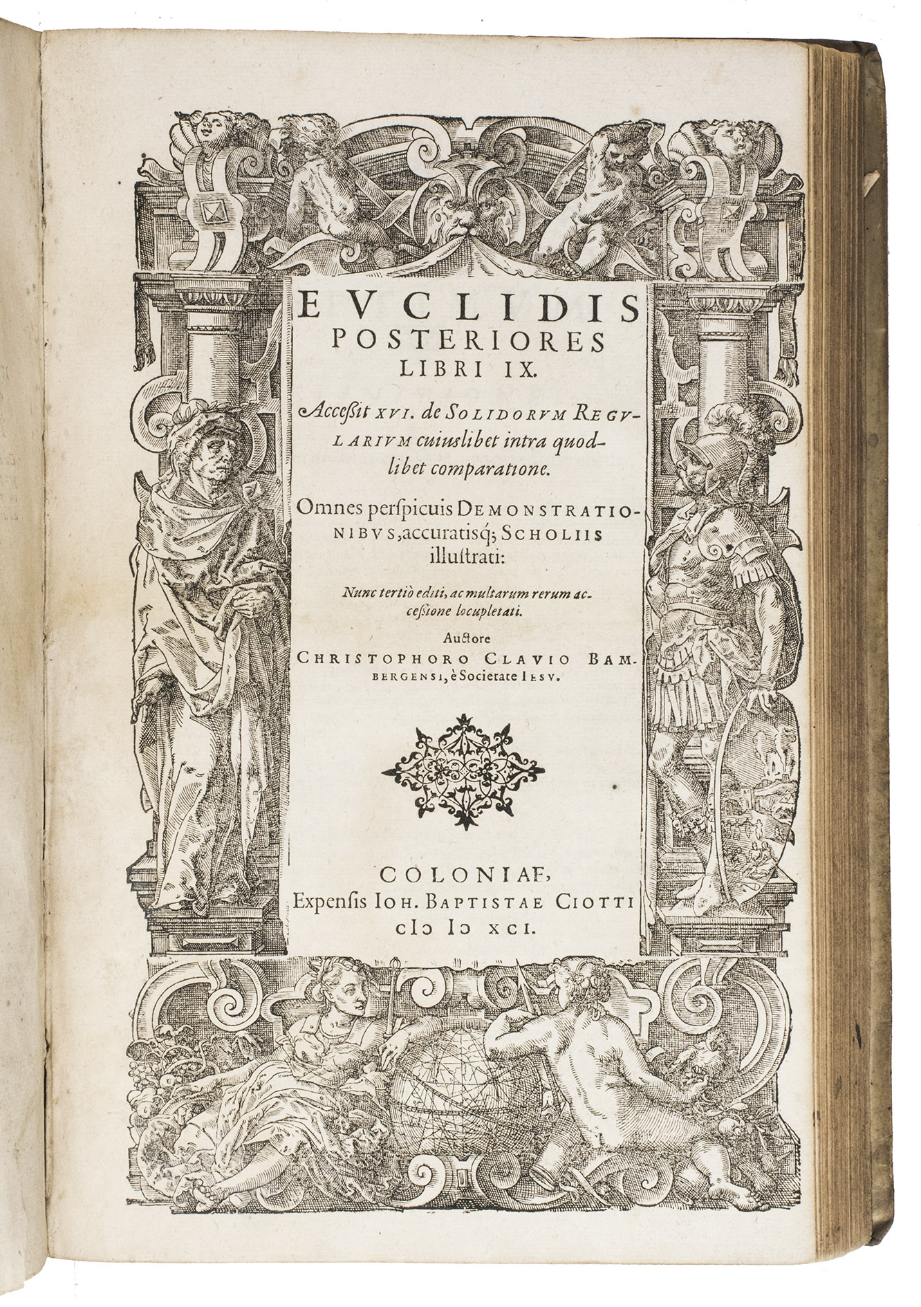 "Cologne" [= Venice], Giovanni Battista Ciotti, 1591. 2 parts in 1 volume. Folio. The title page of each part is set within an elaborate woodcut border, with woodcut decorated initials (at least 3 series), headpieces built up from typographical ornaments, numerous woodcut mathematical figures in the text, large woodcut ornamental tailpieces, and a woodcut printer's device on the otherwise blank verso of the last leaf of both parts. Including: Posteriores libri IX.