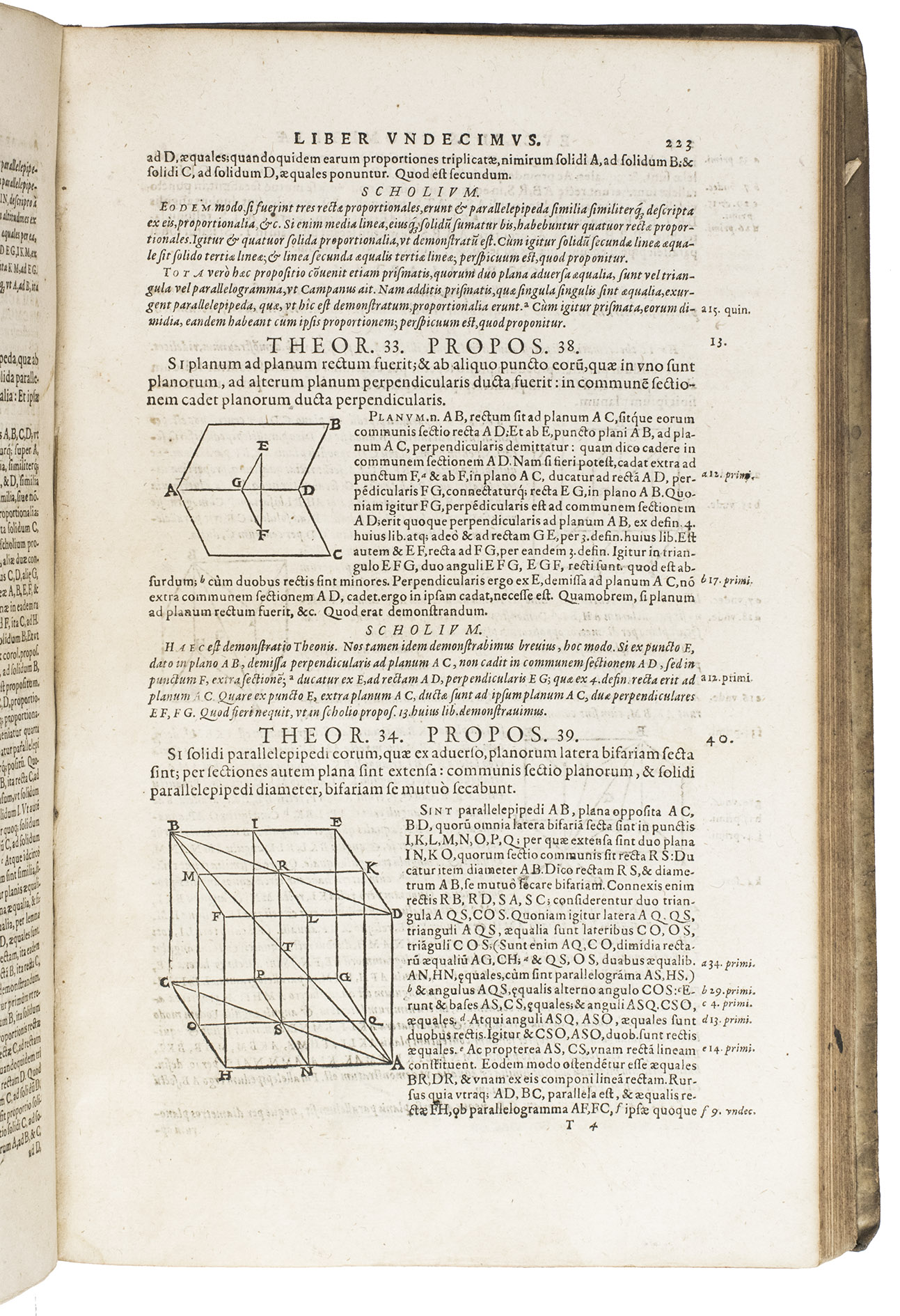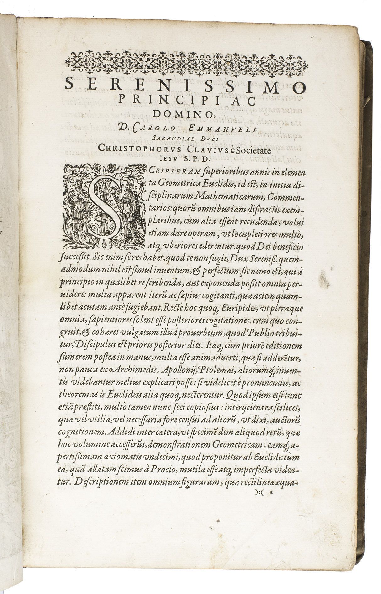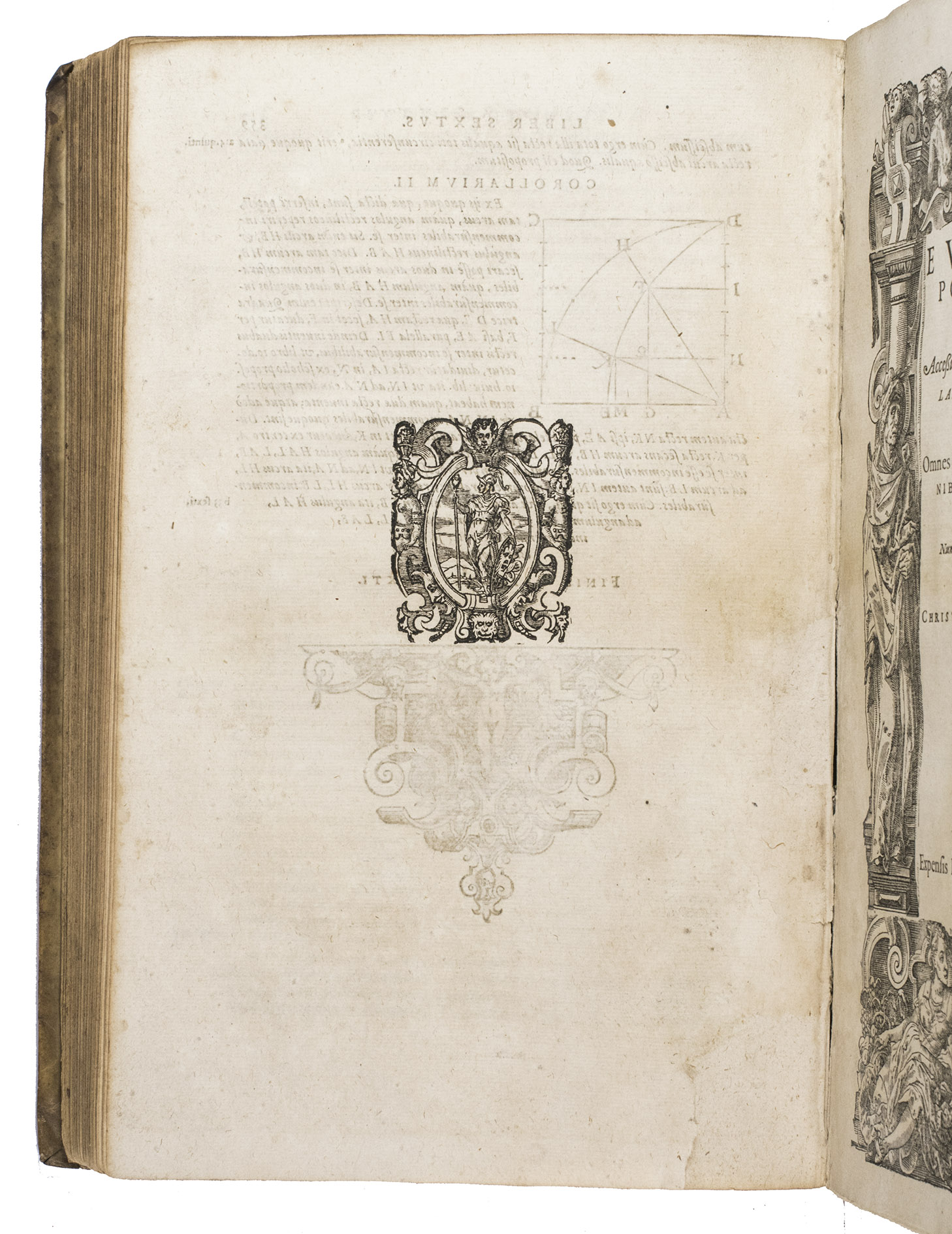 "Cologne" [= Venice], Giovanni Battista Ciotti, 1591. 2 parts in 1 volume. Folio. The title page of each part is set within an elaborate woodcut border, with woodcut decorated initials (at least 3 series), headpieces built up from typographical ornaments, numerous woodcut mathematical figures in the text, large woodcut ornamental tailpieces, and a woodcut printer's device on the otherwise blank verso of the last leaf of both parts. Including: Posteriores libri IX.