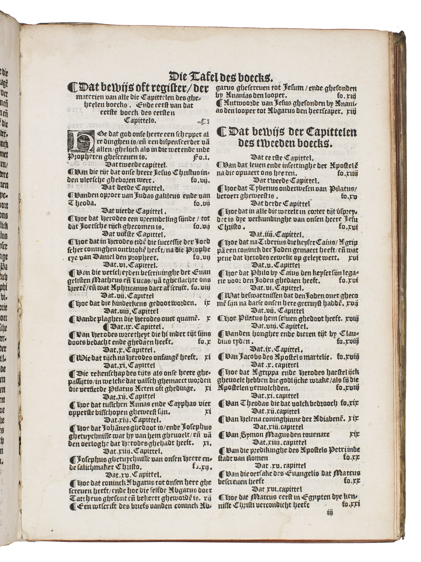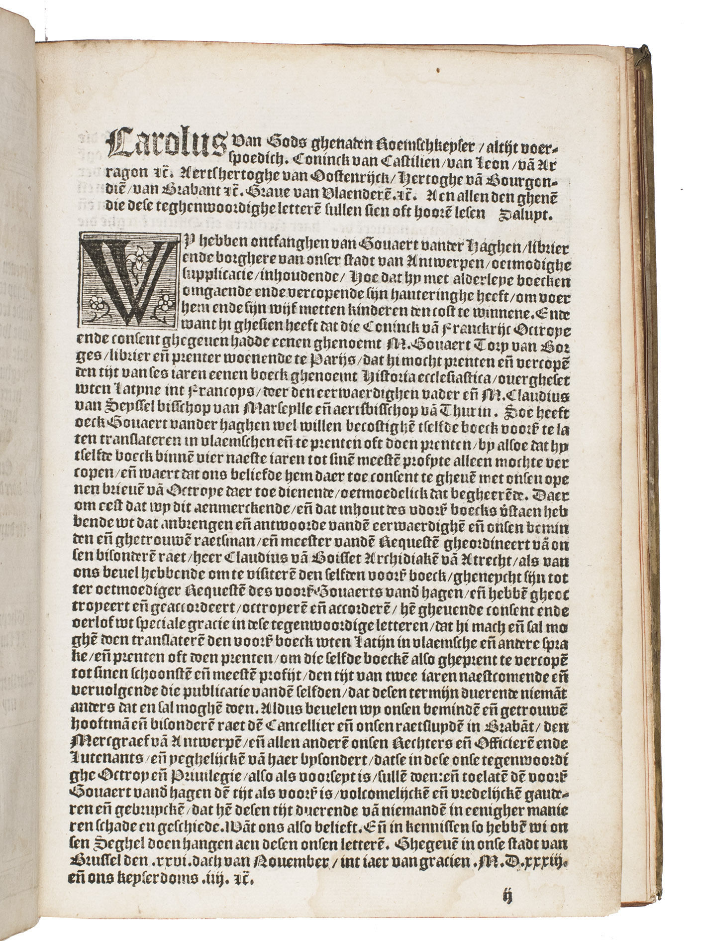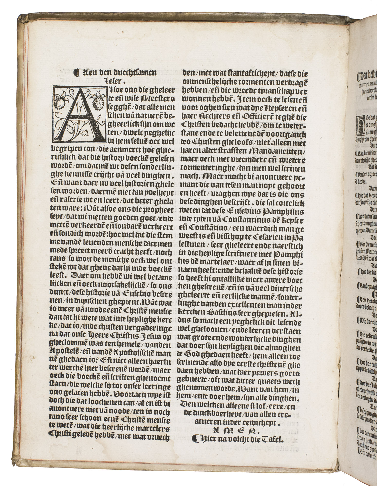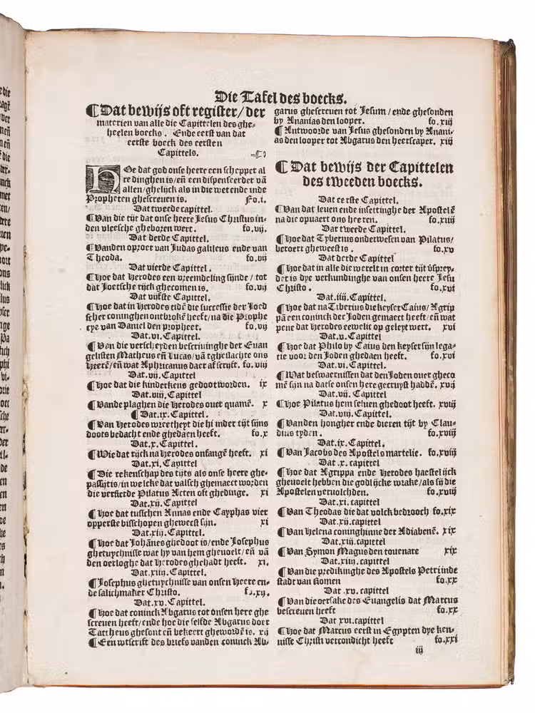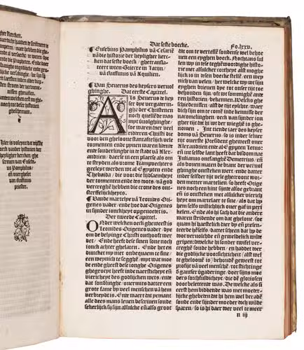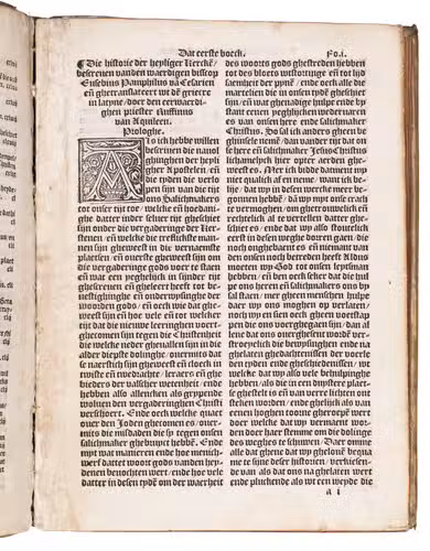 Very rare first Dutch translation of the famous history of the church by the great historian Eusebius (270-338), from the Arenberg collection. The Historia ecclesiastica is the earliest history of the Christian church. Divided in ten books, it gives a clear survey of the first three centuries. This turbulent period, in which the Church changed from an unorthodox, marginal society with a loose structure to a firmly established institution with fixed dogmas and a hierarchic structure, was not easy to describe as the annals were sparse. Eusebius succeeded in transforming the scattered information into a coherent historical account, rejecting anything doubtful or fabulous.