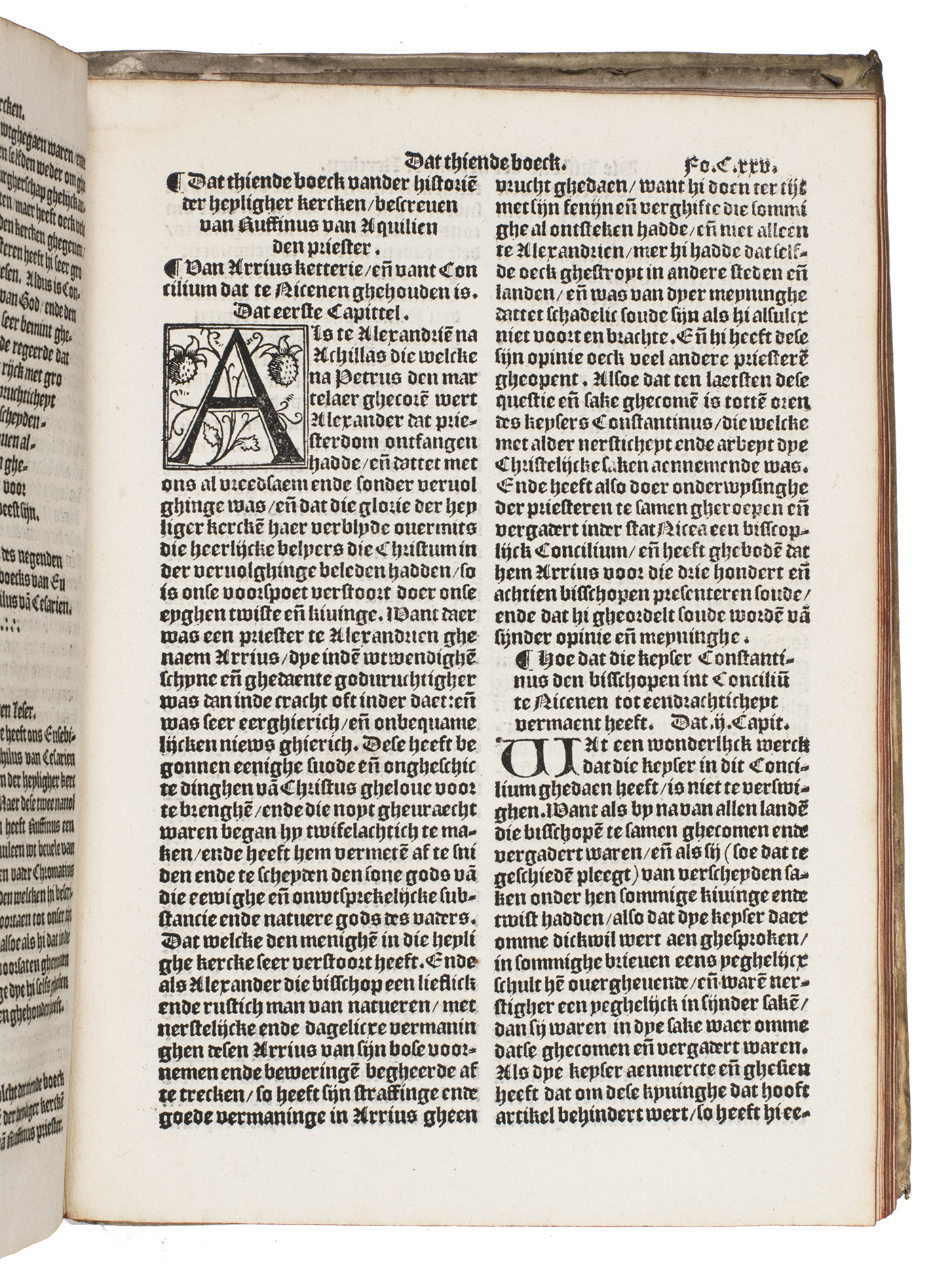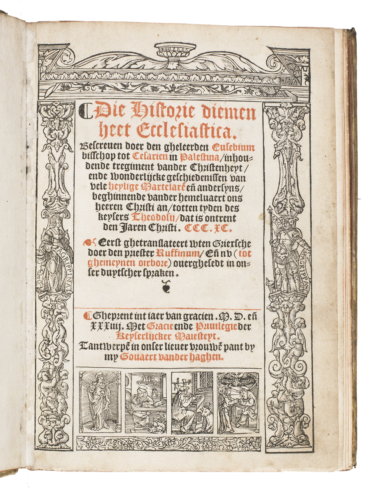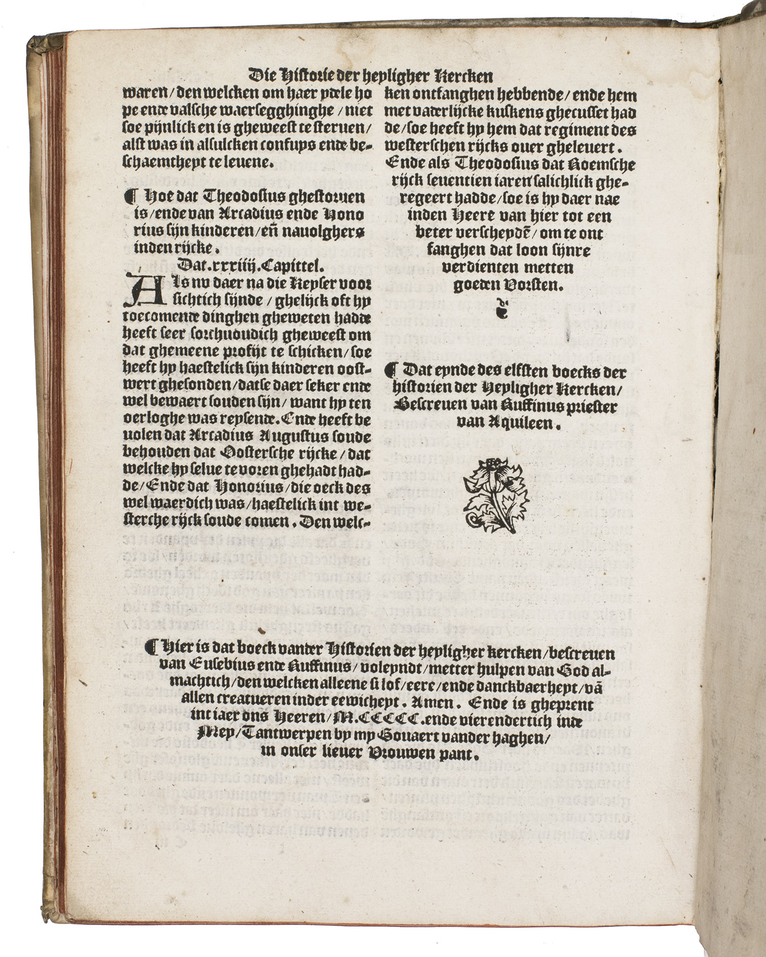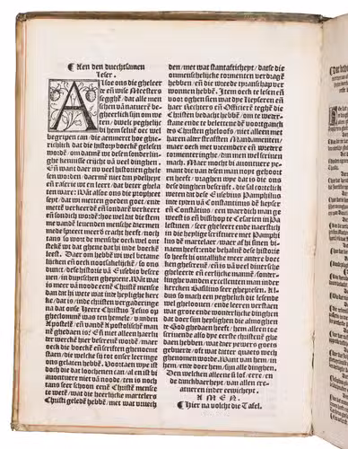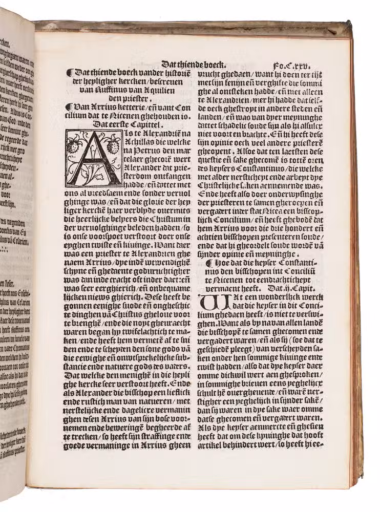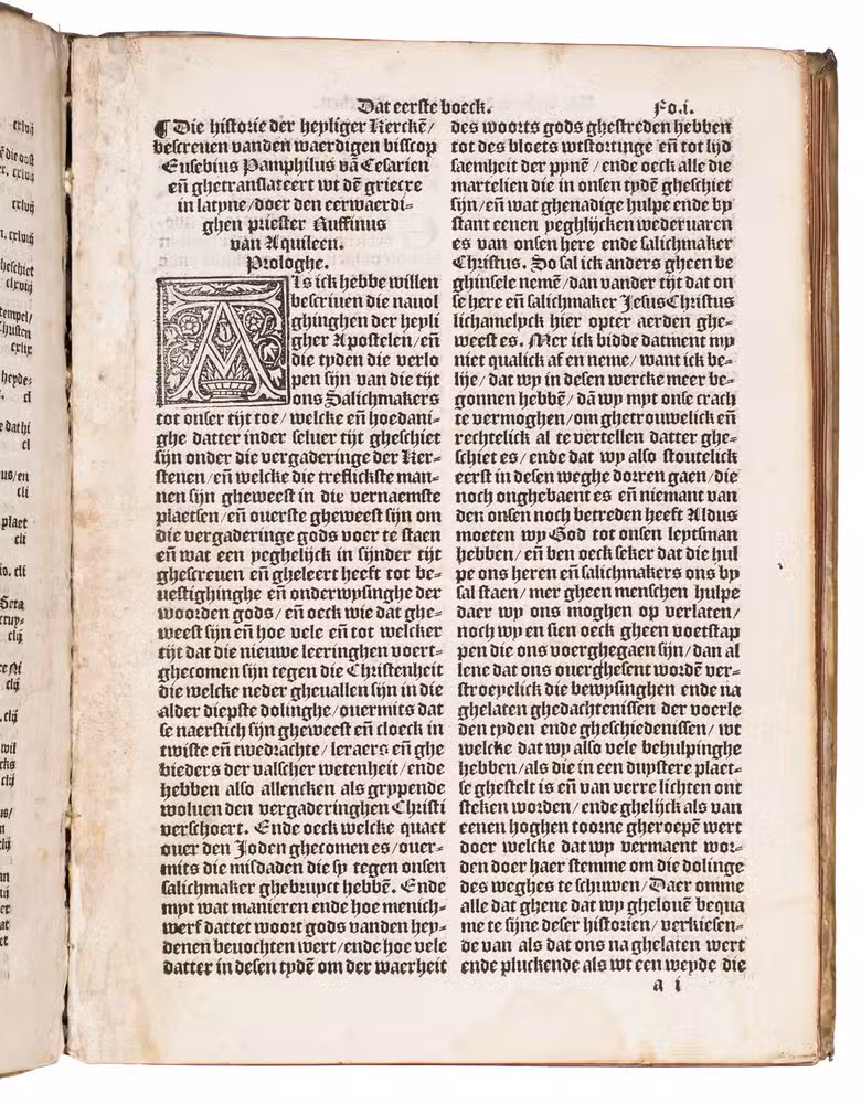 Eusebius wrote his text in Greek, before 326. The present Dutch edition, however, was translated after the Latin translation by Tyrannius Rufinus (ca. 340-410), which was first published in Rome, 1474. Rufinus made a rather free translation, and added two books carrying the narrative down to the death of Theodosius the Great in 395. The popular work was translated into multiple languages in the 16th century. The present first Dutch translation is very scarce, as we have not been able to trace any other copies in sales records of the past hundred years.