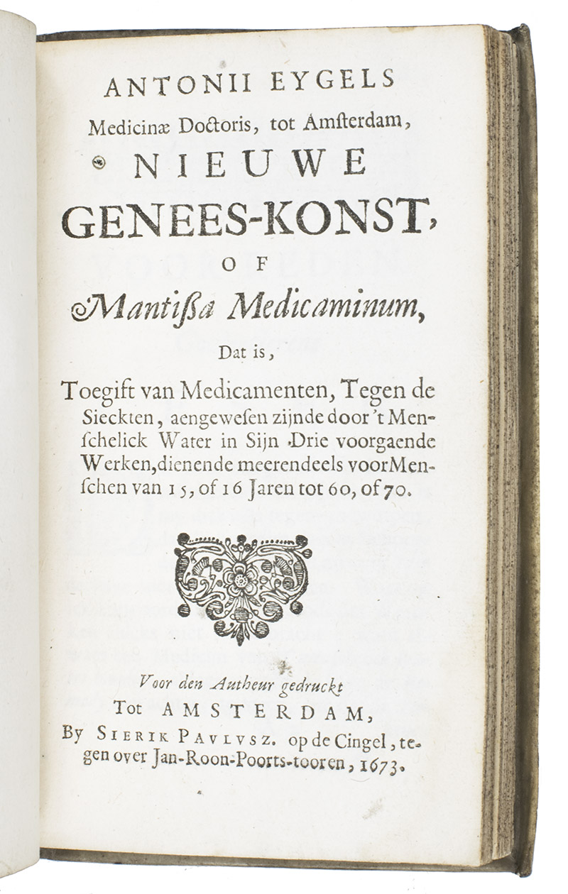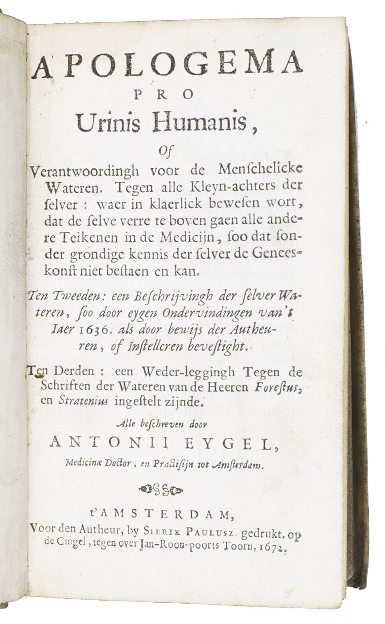 First editions of two very rare works on the observation of the human urine ("piskijken") which is the author describes as very profitable and necessary to diagnose many illnesses. The second work adds medications for the illnesses diagnosed. Both were written by the Amsterdam physician Antonius Eygel (1621-1674), who took his doctors degree in 1644 in Harderwijk. A second edition of the first work appeared in 1677. Eygel opposes in the third part of the first book the works of Petrus Forestus (De incerto, fallacy, urinarum iudicio (1589)) and Guilielmus Statenus.