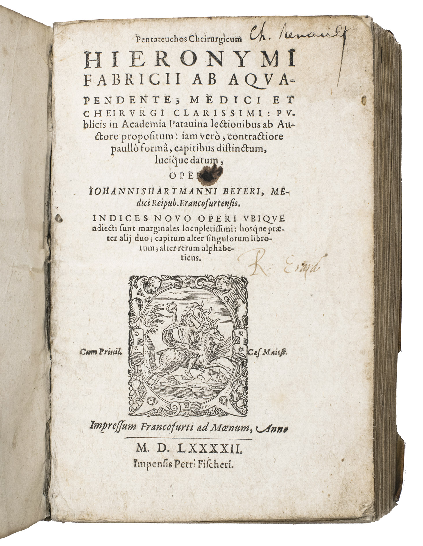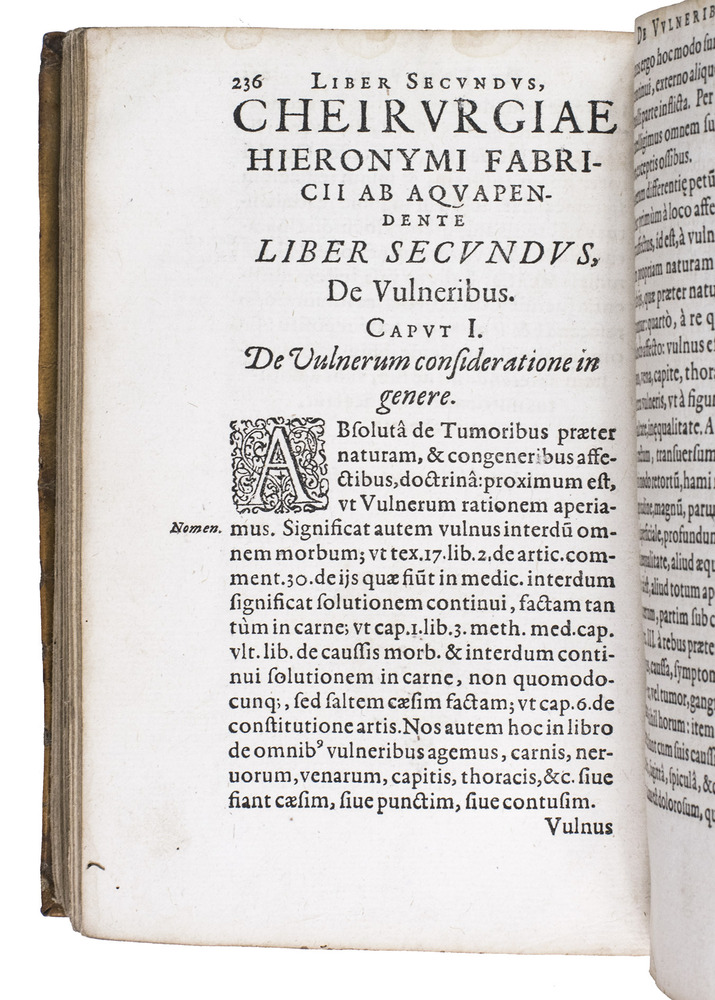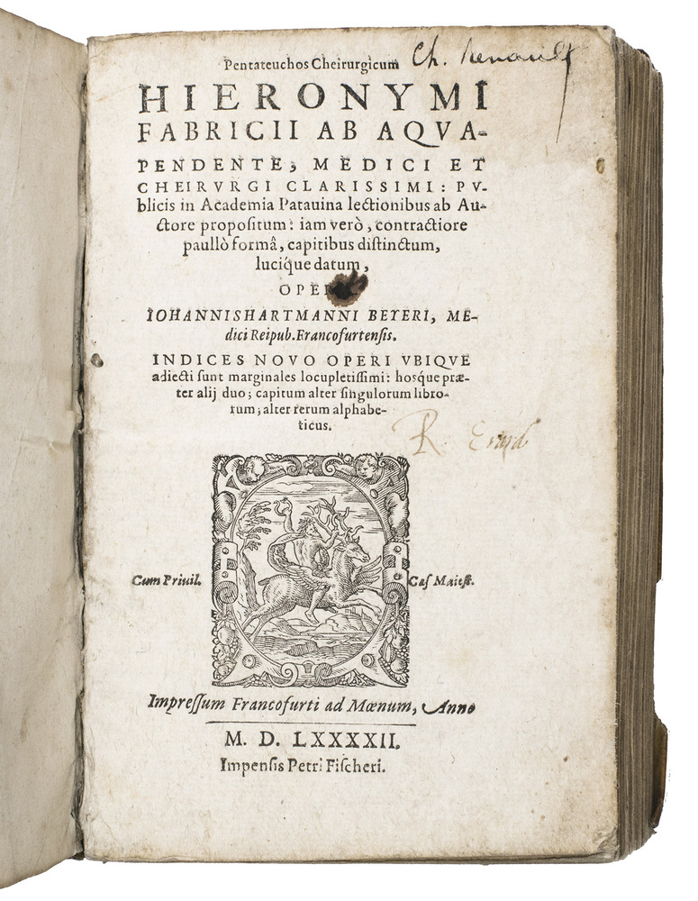 Rare Fischer issue of the first edition of the surgical works of the surgeon, physician and professor of anatomy at the University of Padua, Girolamo Fabrici (1537-1619), his first published work, edited by his student Johann Hartman Beyer, who also contributed a seven-page preface. The book is divided into five numbered "libri" covering tumors, wounds, ulcers and fistulas, fractures and dislocations respectively, still influenced by the classic works of Hippocrates and Galen. Beyer apparently published these surgical works based on his notes of Fabrici's lectures and without his permission, and Fabrici was not pleased, but he tacitly acknowledged them with the publication of an addendum in 1619, the year of his death.