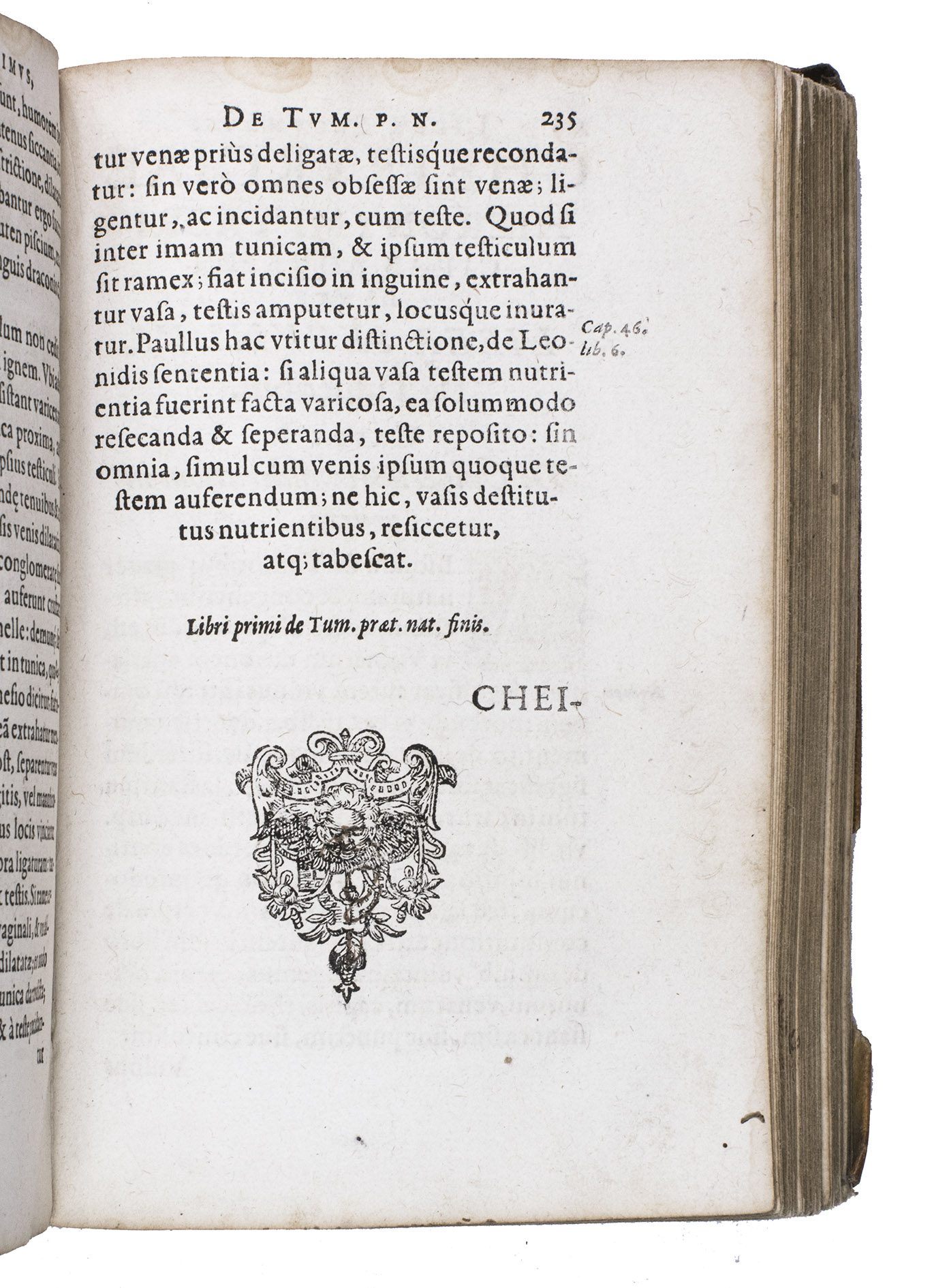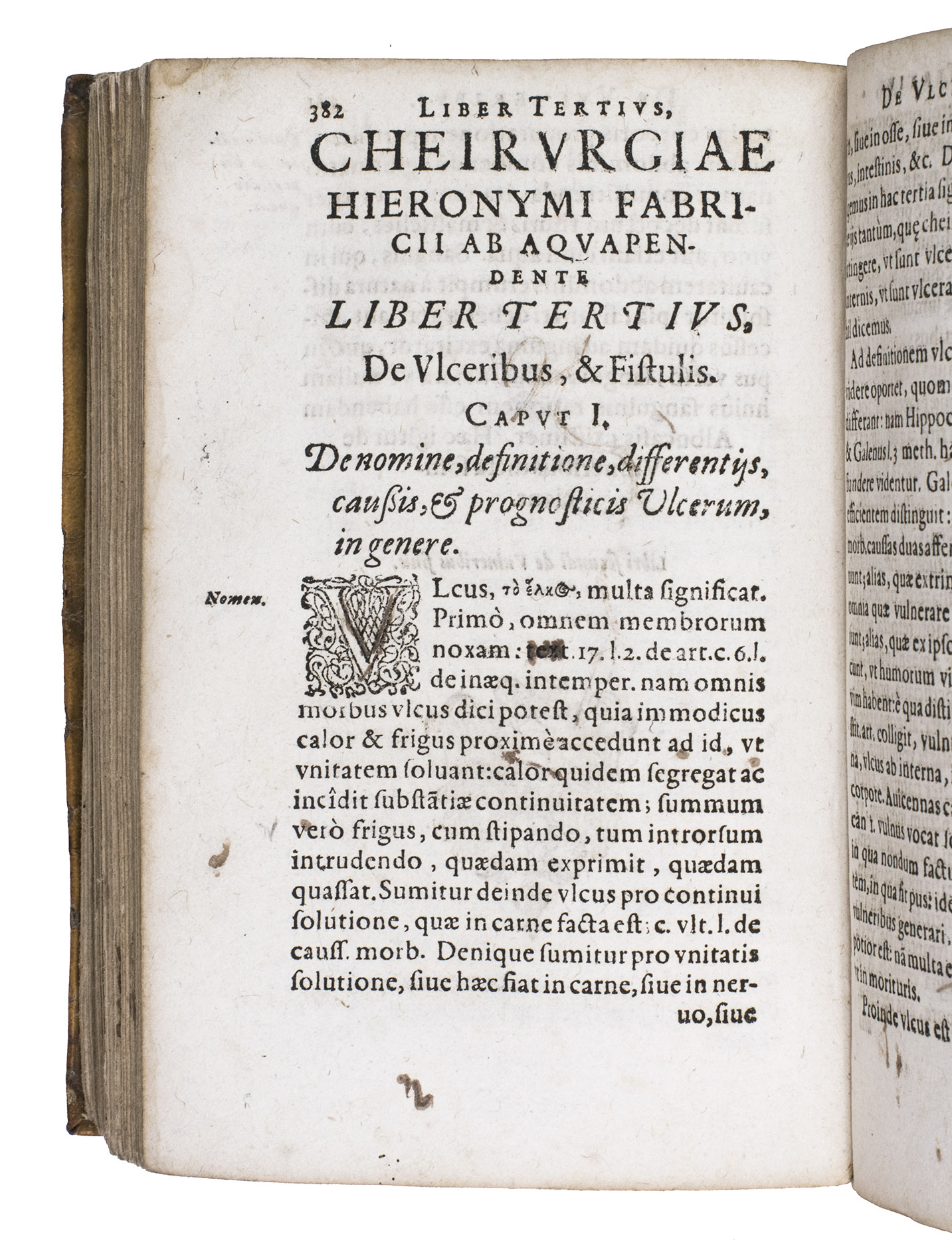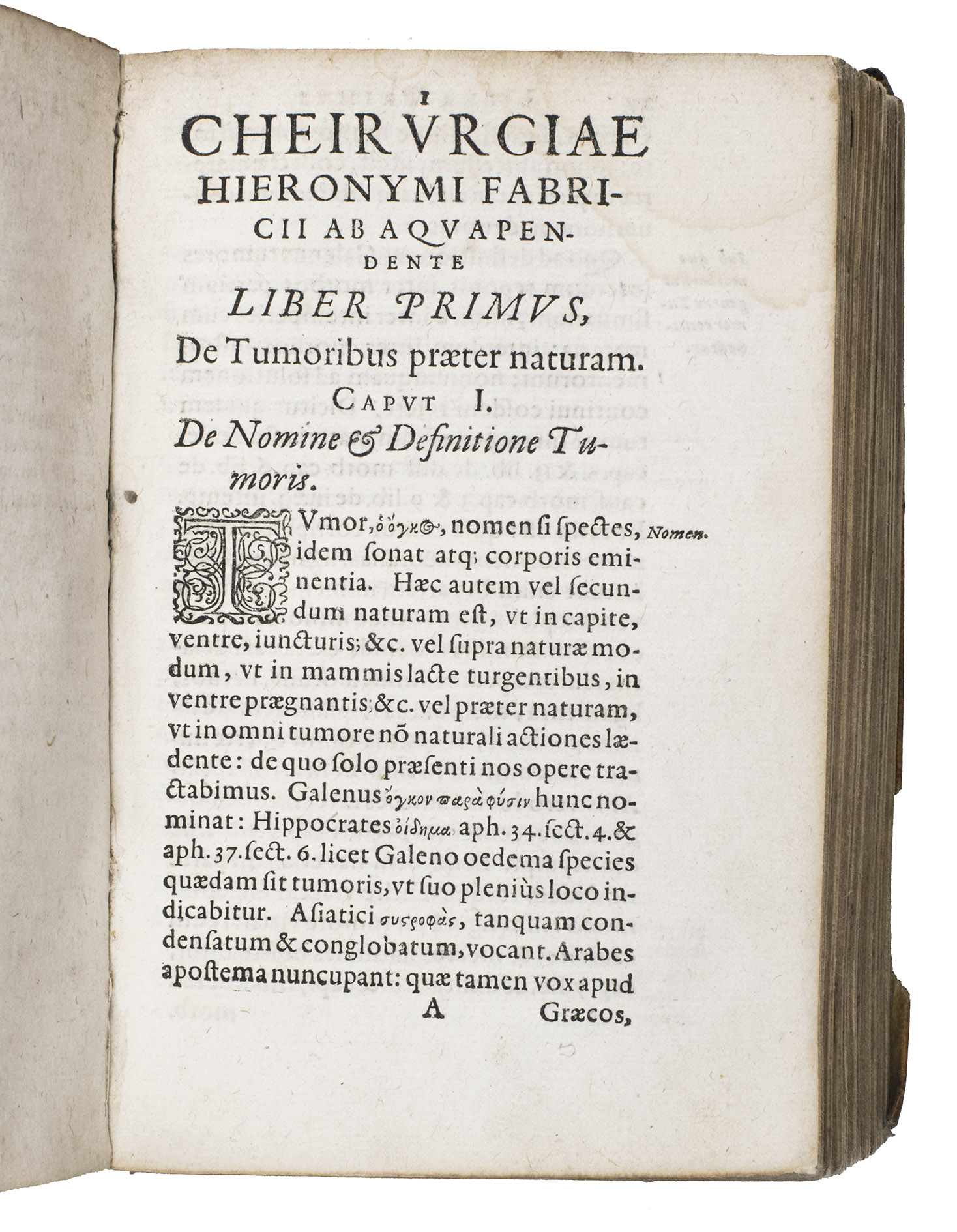 Rare Fischer issue of the first edition of the surgical works of the surgeon, physician and professor of anatomy at the University of Padua, Girolamo Fabrici (1537-1619), his first published work, edited by his student Johann Hartman Beyer, who also contributed a seven-page preface. The book is divided into five numbered "libri" covering tumors, wounds, ulcers and fistulas, fractures and dislocations respectively, still influenced by the classic works of Hippocrates and Galen. Beyer apparently published these surgical works based on his notes of Fabrici's lectures and without his permission, and Fabrici was not pleased, but he tacitly acknowledged them with the publication of an addendum in 1619, the year of his death.