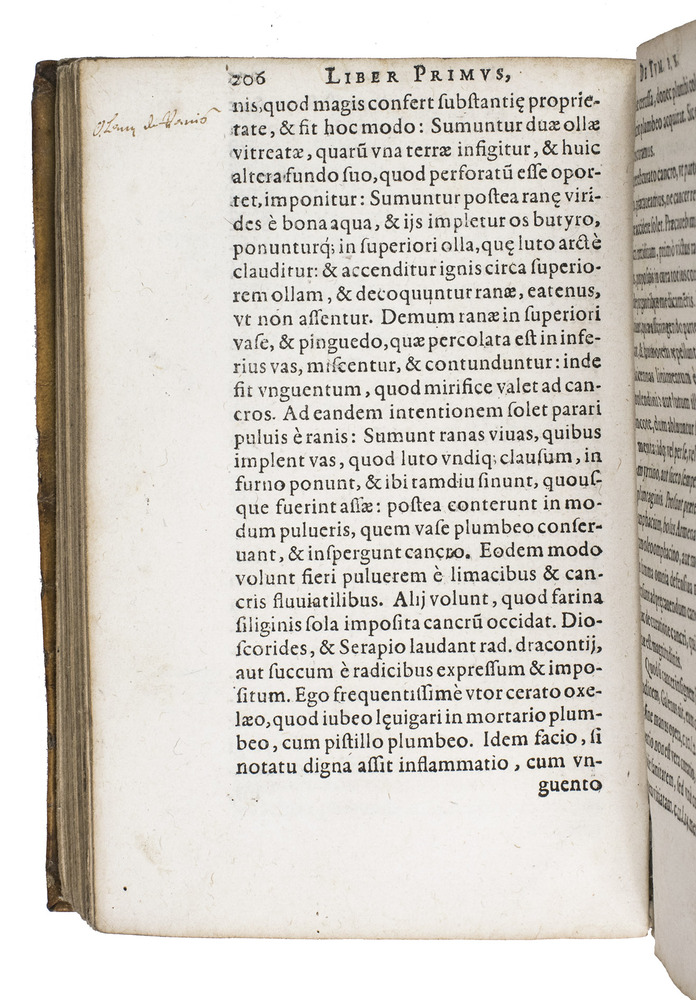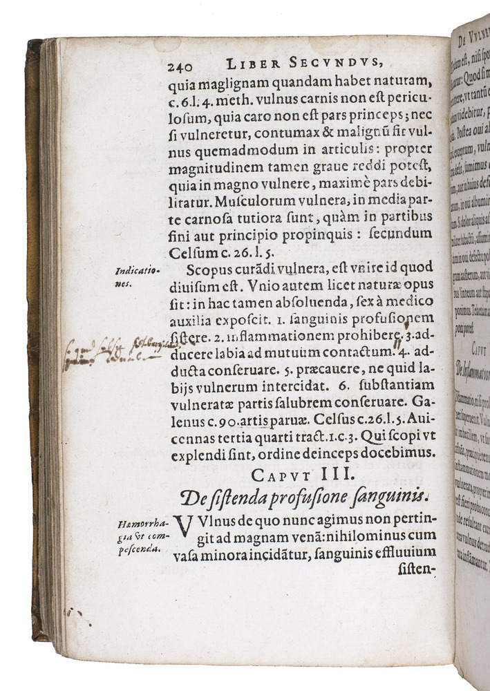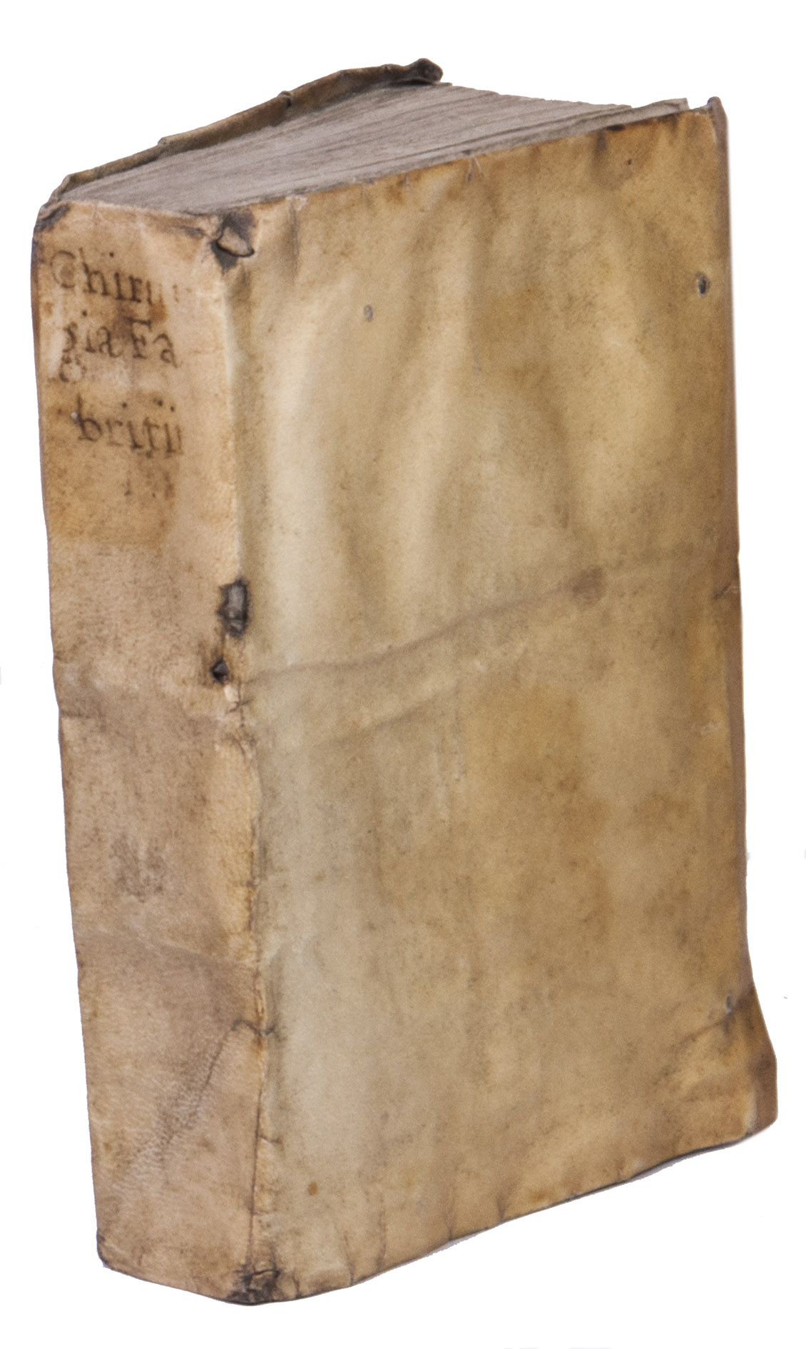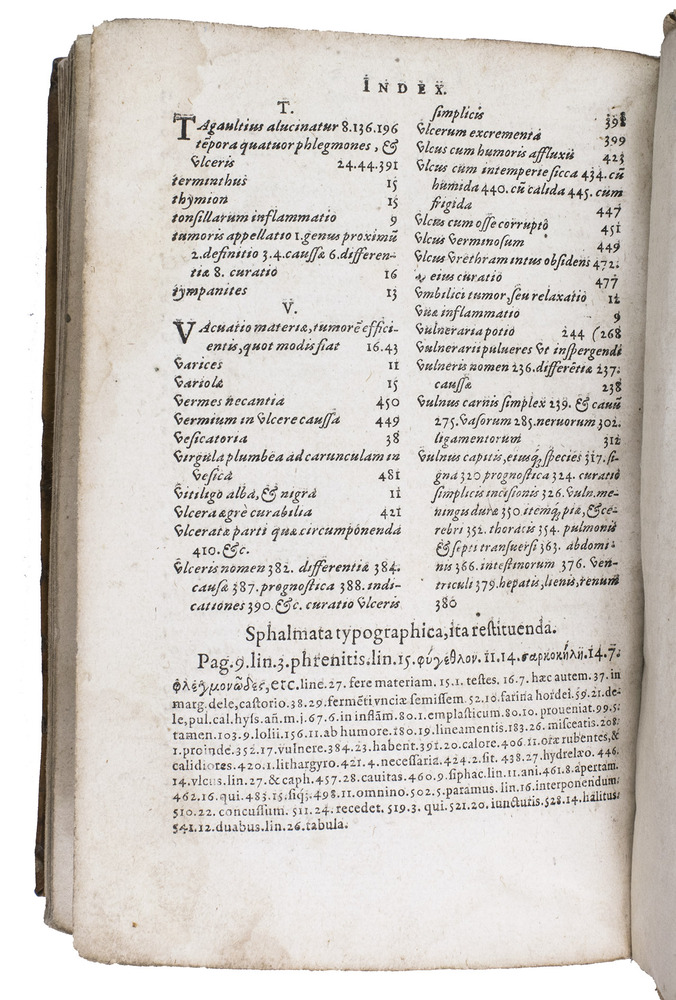 With an early owner's name R. Erard on the title-page and a later owner's name at the head. With some marginal wormholes in the first third, but even where they are most severe (in the gutter margin of quires F and G) they rarely touch the text and never remove a letter, occasional water stains in the last few leaves, a small ink splotch on the title-page (affecting 2 letters) and an occasional smaller one. Still in good condition. The vellum of the binding shows some small chips, holes and tears, and the ties are lost. Durling 1416; Norman Library 748; USTC 683385; VD16 F498; cf. Heirs of Hippocrates 366; Wellcome I, 2120; not in Garrison & Morton; Osler; for Fabrici: DSB IV, pp. 507-512 (noting this ed. p. 511).