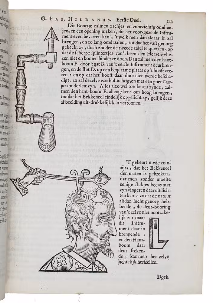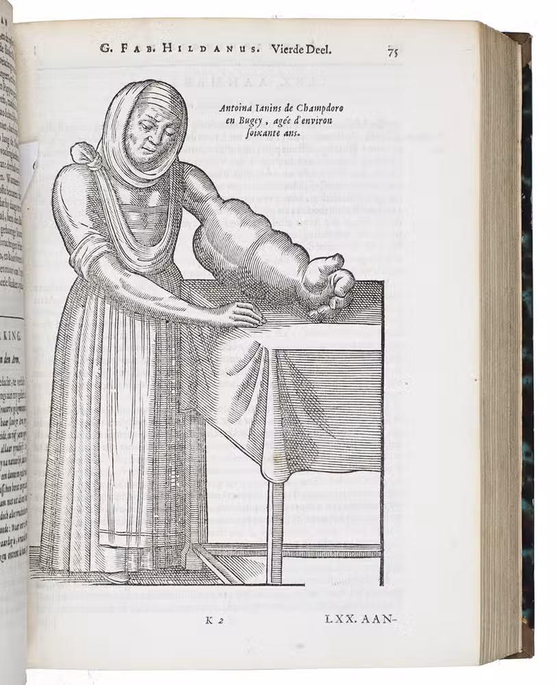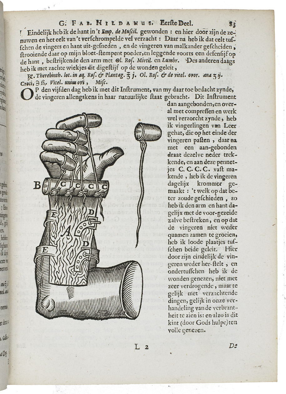 The case histories were originally printed in Latin and published in Basle, Frankfurt & Lyon form 1606 to1627 in five illustrated volumes of 100 reports each (centuriae); a sixth posthumous volume appeared in 1641. Fabry's reports "cover the entire field of surgery, and reveal him to be a bold and skilful surgeon ingenious in meeting unfamiliar problems, and inventive in designing effective instruments for special needs"(Zimmerman & Veith). BMN I, p. 72; STCN (7 copies, including 1 incomplete); cf. Norman Library 754 (Latin edition); Zimmerman & Veith, pp. 239-48.