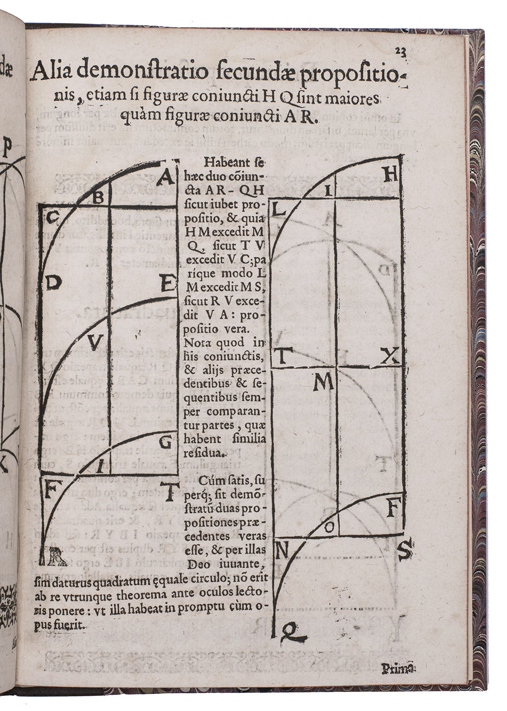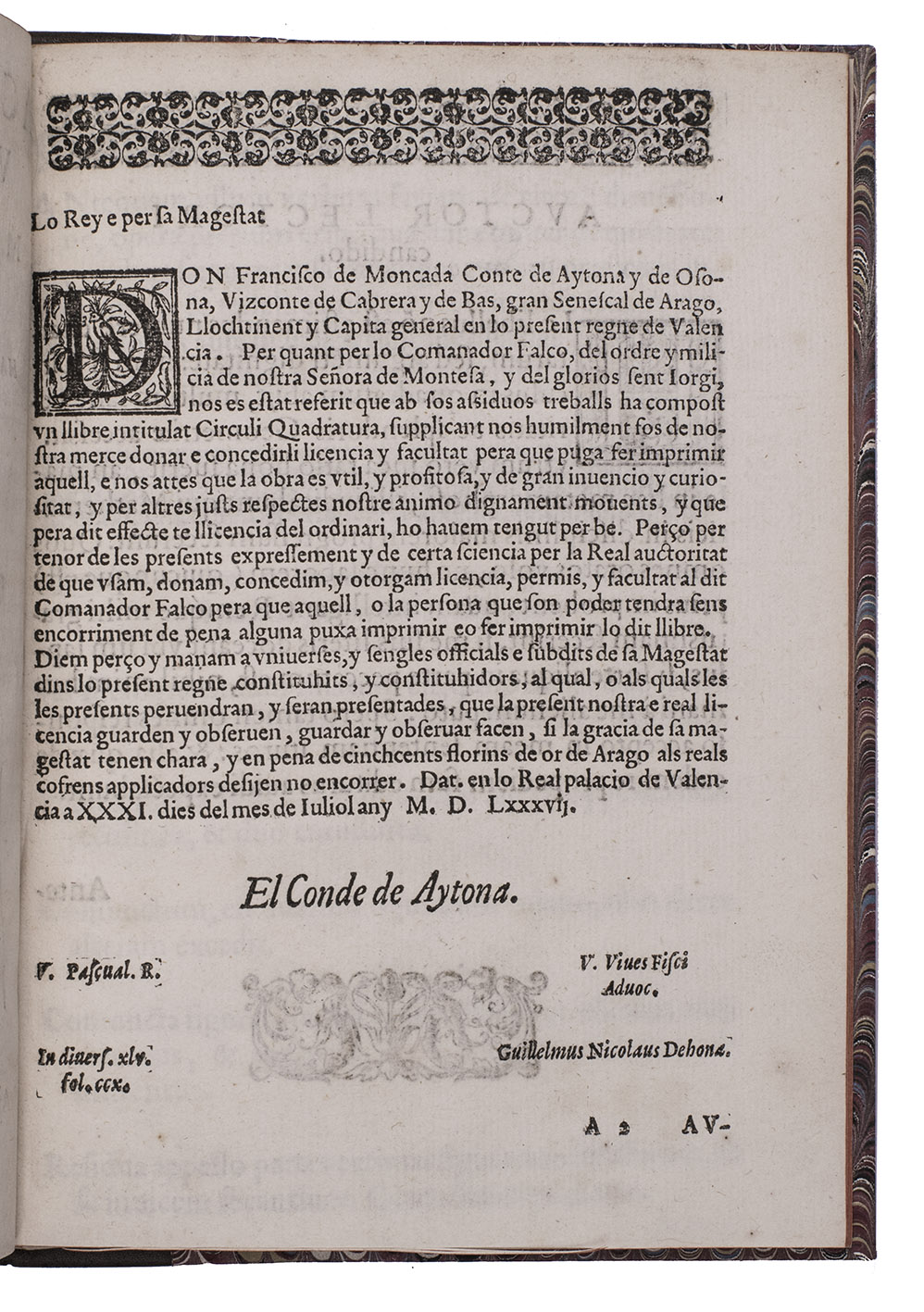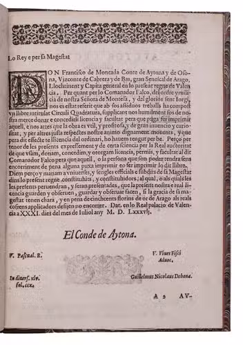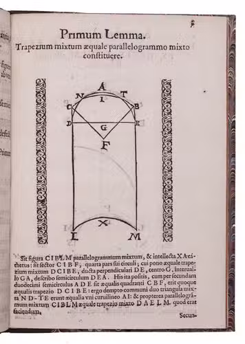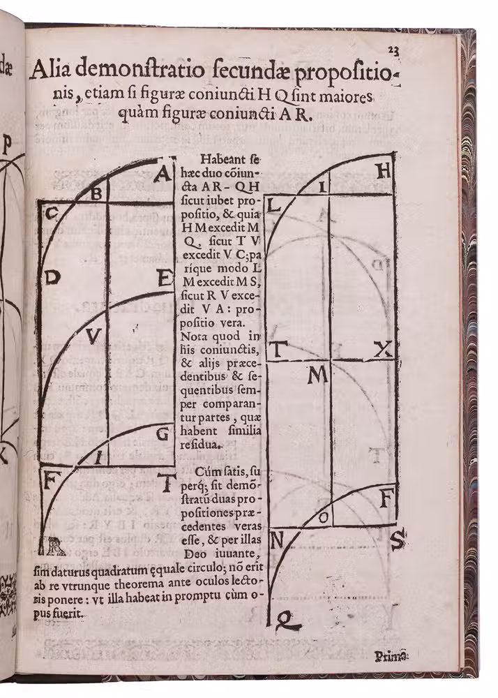 Second edition of an early treatise claiming to have squared the circle (geometrically constructed a square matching the surface area of a given circle, shown to be impossible in 1882). Falco (Valencia 1522-Madrid 1594), a humanistic poet and mathematician, and a Knight of the Order of Montesa, seems to have been a better poet than mathematician. His treatise has been called "more than commonly worthless" (De Morgan, A budget of paradoxes, 1872, p. 36), but it ends with a charming poem. In the first verse, the disappointed squared circle wonders who robbed it of its former noble form, and in the second Falco replies.