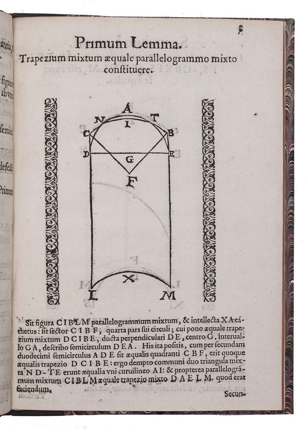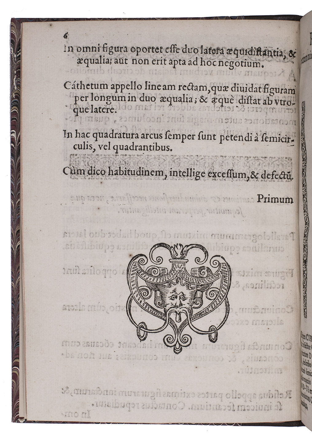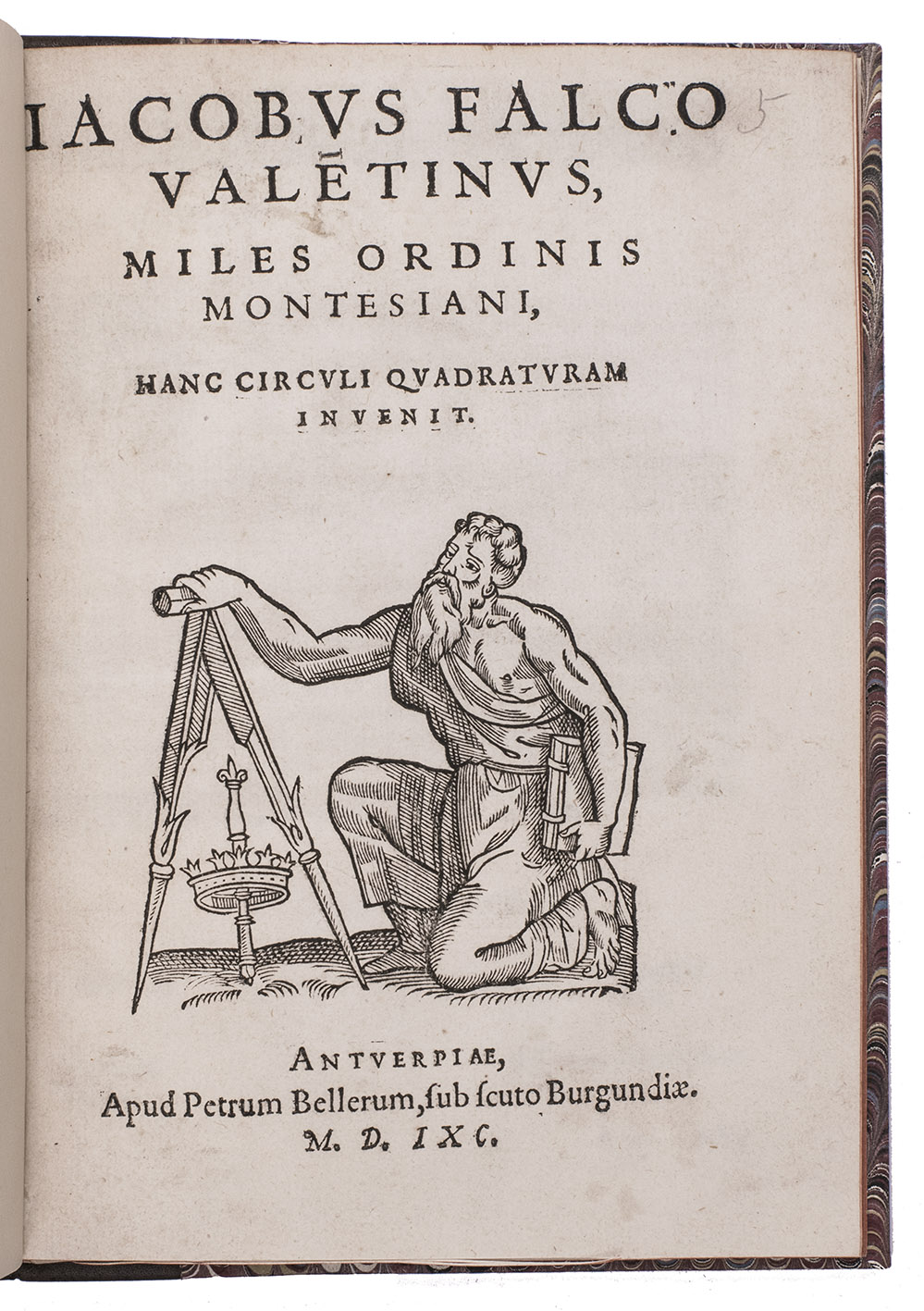 Antwerp, Petrus Bellerus (Peter Belaert), 1591. Small 4to (19.5 x 14 cm). With a woodcut of Euclid (or possibly Archimedes) with an enormous pair of dividers in his right hand and a book in his left, and between the two legs of the dividers a sceptre passing through a crown, and 29 woodcut diagrams. 20th-century half calf. 29, [1] pp.