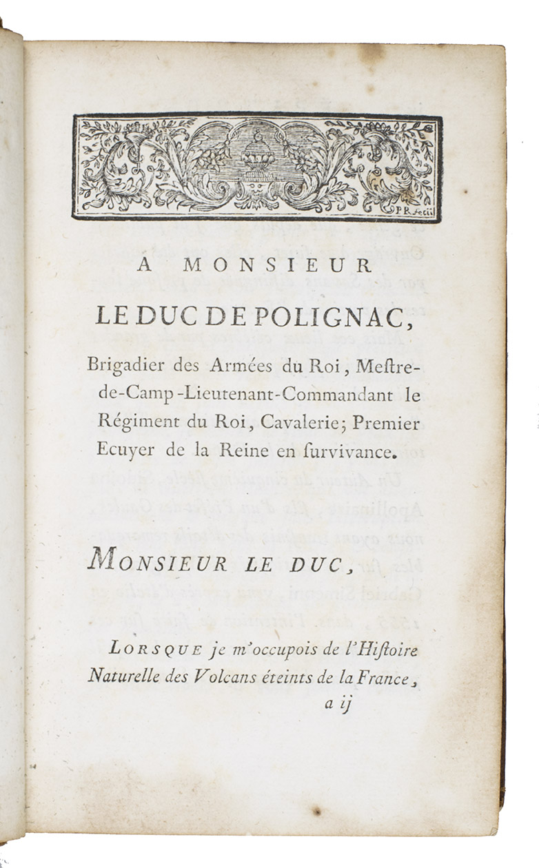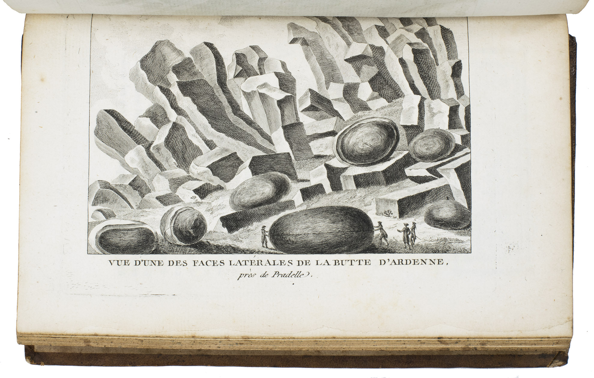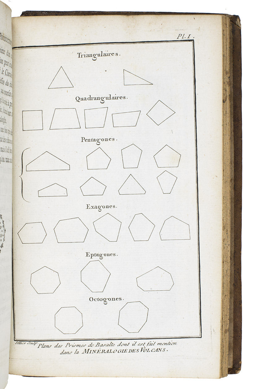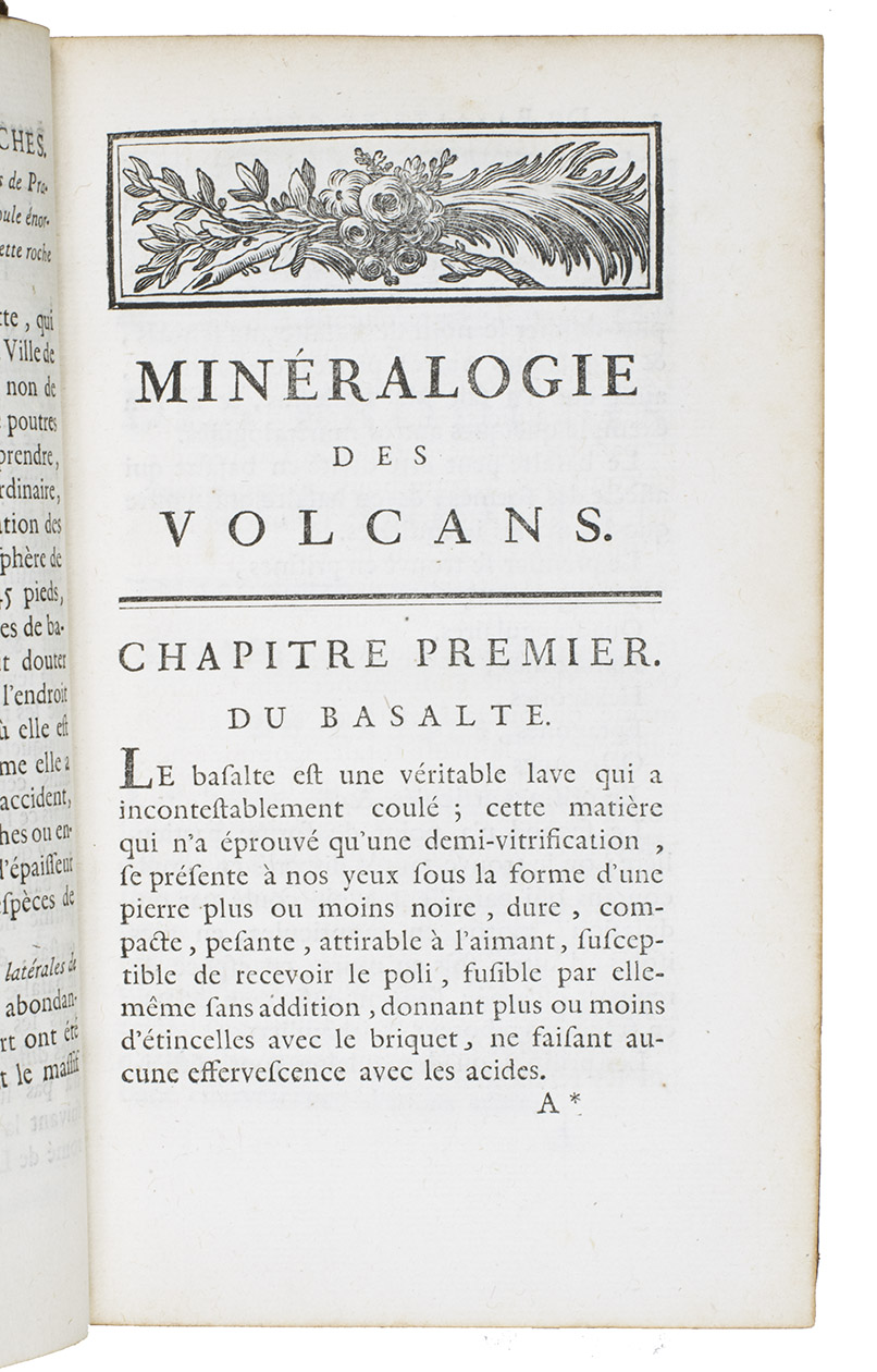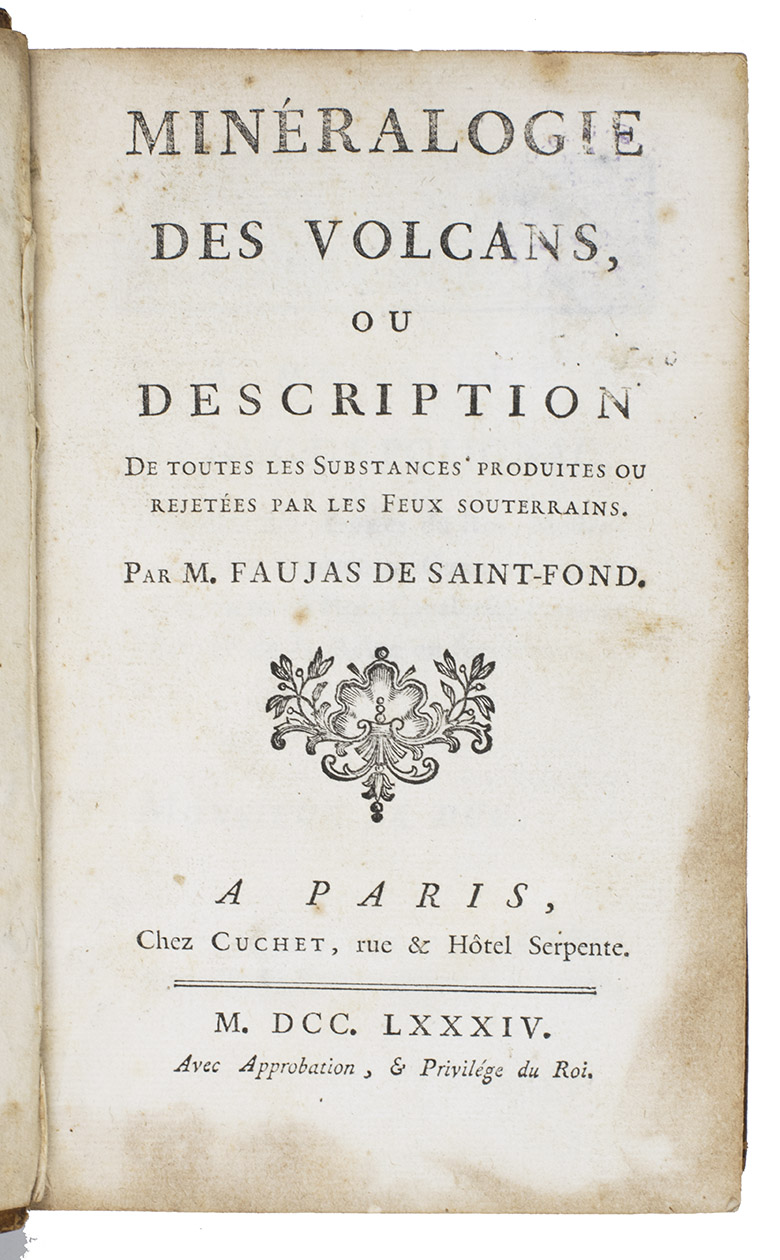 First edition of a treatise on the mineralogy of volcanoes and a description of all kinds of gravel produced by underground fires, written by Barthélemy Faujas de Saint-Fond (1741-1819). Faujas de Saint-Fond was a former lawyer who decided to devote himself completely to geology, mineralogy and natural history. He worked as assistant in the Museum d'Histoire Naturelle in Paris, and later, in 1793, became a professor there.