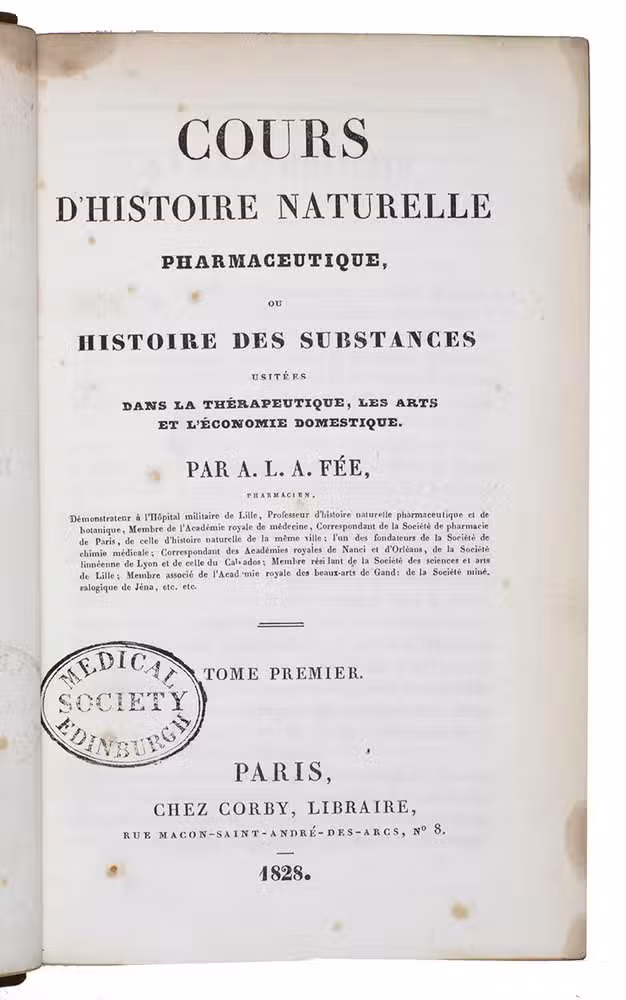 Antoine Laurent Apollinaire Fée (1789-1874) is a French botanist and author of works on botany and mycology, Darwinism and practical and historical pharmacology - his Code pharmaceutique, ou pharmacopée française (Paris, 1826) among them. He served as a medical orderly during Napoleon's campaign in Spain, then established a pharmacy in Paris. He was schooled in the profession in Strasbourg, receiving his degree in 1815. He met the botanist Christiaan Hendrik Persoon in 1823, and came to be strongly influenced by him. Fée later became an instructor at teaching hospitals, firstly in Lille in 1825 then Strasbourg in 1832, when he was promoted to M.D. and professor of botany. In 1874 he was elected as the president of the Société botanique de France.