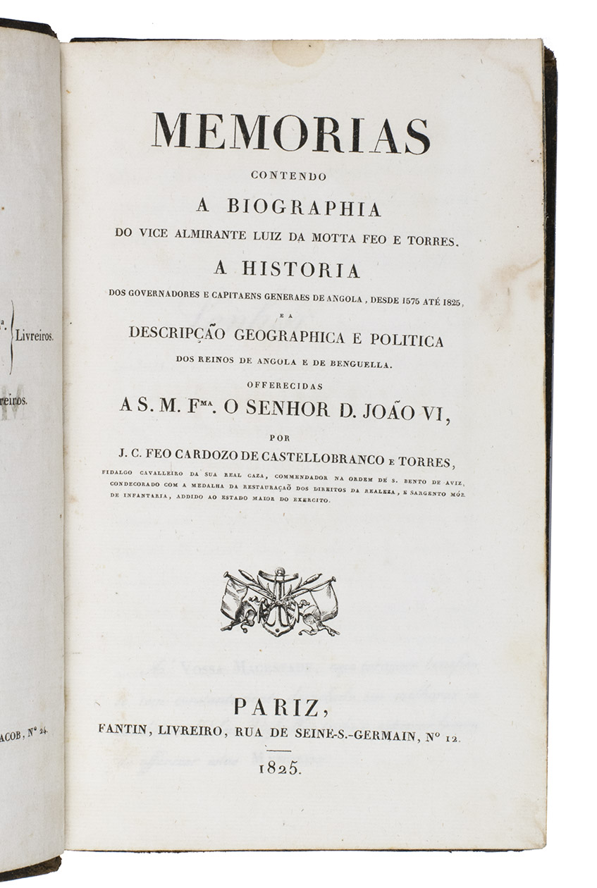 Memorias contendo a biographia do vice almirante Luiz da Motta Feo e Torres. A historia dos governadores e capitaens generaes de Angola, desde 1575 até 1825, e a descripção geographica e politica dos reinos de Angola e de Benguella.