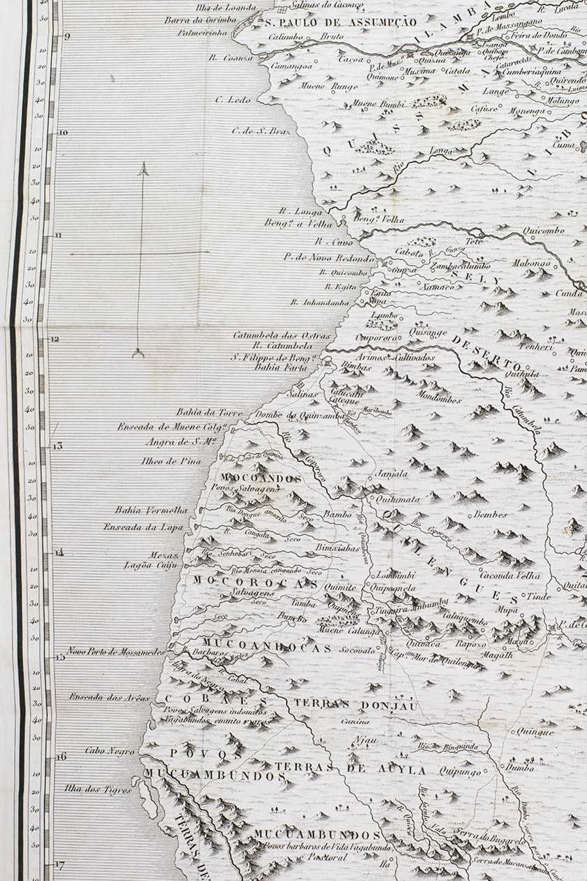 Angola was a part of the Portuguese Empire almost continuously from 1655-1975. The current capital, Luanda, was originally a Portuguese settlement founded in 1576. Since the Portuguese were primarily in Angola for the slave trade, the colony was initially not expanded beyond Luanda and a fort in the bay of Benguela in the south. The region was therefore hardly explored. As foreign interest for Angola grew, and Luanda was even in Dutch hands from 1640-1648, the Portuguese realised they needed to expand to be able to defend it. Different governors enlisted the help of cartographers to explore the region. Governor José de Almeida e Vasconcellos de Soveral e Carvalho, who held this position from 1784-1790, employed the help of Lieutenant Colonel Luís Cândido Cordeiro Pinheiro Furtado (1749-1822), a military engineer and cartographer, and Joaquim José da Silva (1755-1810), a naturalist who had travelled through Angola extensively for his research. The two men joined two missions in 1785, with the goal to explore Angola further and secure more territory. During the journey, Pinheiro Furtado charted the whole coast and made a map of the country based on verbal information of soldiers and explorers. This map, finished in 1790, is included in Memorias contendo a biographia.