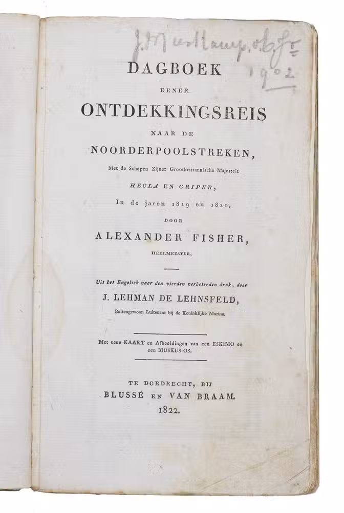 The rare first edition of Johannes Lehman de Lehnsfelds Dutch translation of the fourth enlarged edition of Fishers English travel journal: A journal of a voyage of discovery to the Arctic regions, in His Majesty's ships Hecla and Griper, in the Years 1819 & 1820, by the ships surgeon Alexander Fisher. This is an account of the first voyage commanded by the famous explorer of the Arctic Sir William Edward Parry (1790-1855) to search for the non-existent North West Passage. On his 1819 expedition, from May 1819 to late October 1820, he penetrated through the Parry Channel and Barrow's Strait as far as Melville Island (75° 30 N, 111° 30 W). Parry's voyage, which had taken him through the Parry Channel three quarters of the way across the Canadian Arctic Archipelago was probably the single most productive voyage in the quest for the Northwest Passage.