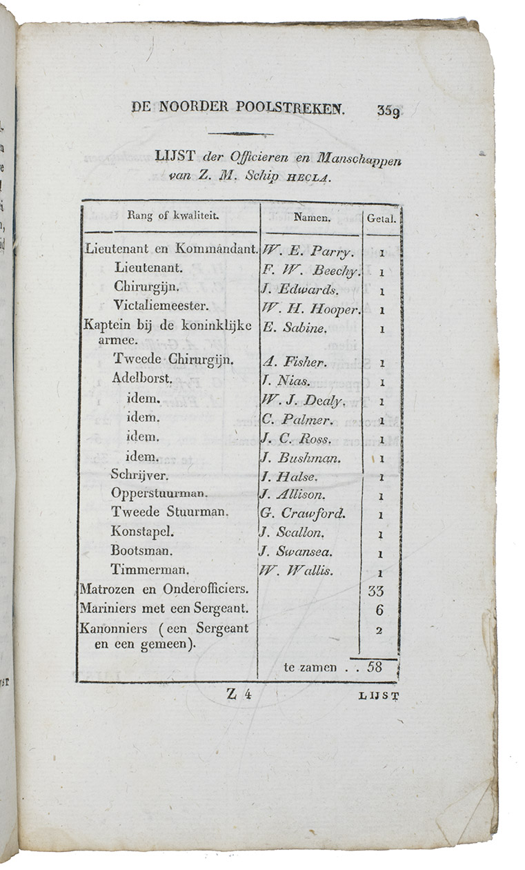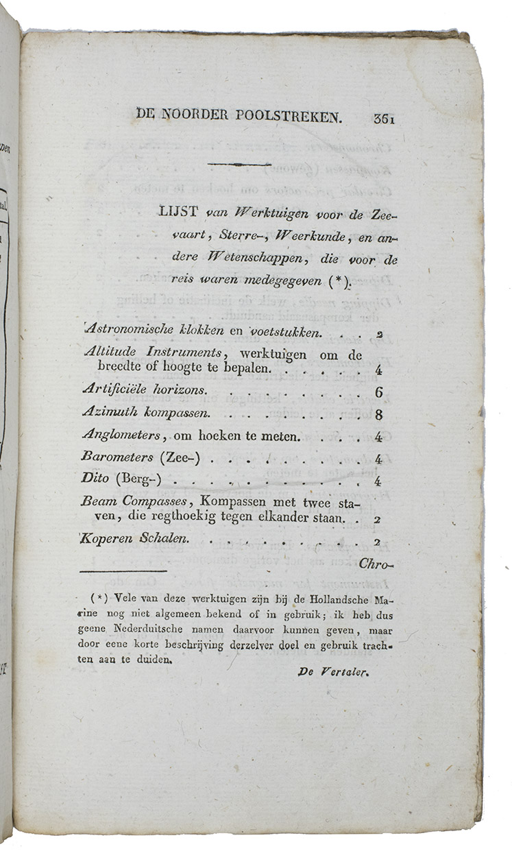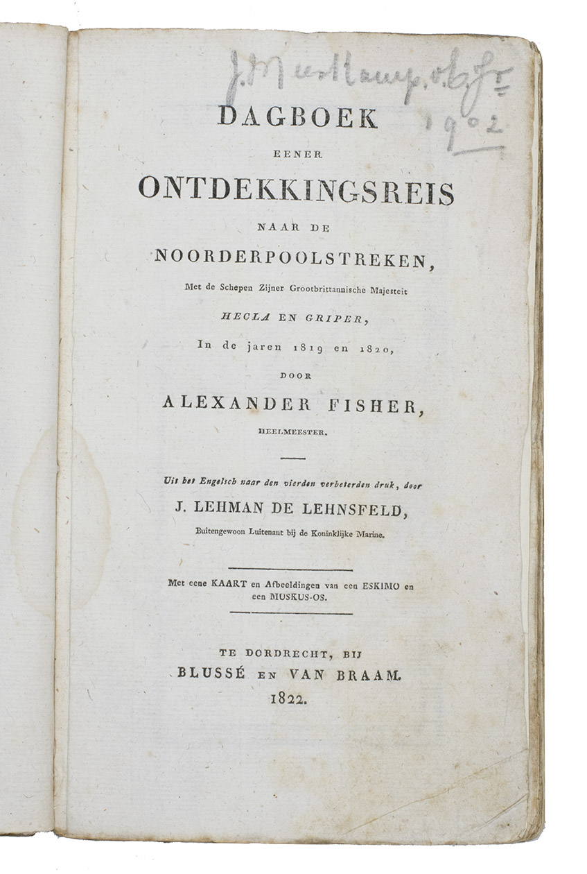 Untrimmed copy with the owner's inscription of J. Meerlkamp in pencil on the title-page, dated 1902. Binding a little worn, title-page and the first leaves somewhat soiled and stained, otherwise in good condition. Letterk. Magaz. van wetensch., kunst en smaak voor 1823, pp. 358-363; cf. Arctic bibliogr. 5022; Hill 605; Howgego 1800-1850, pp. 464-465, P9; Cat. Nat. Martit. Mus. I, 826; Sabin 24453; Staton & Tremaine, 1193 (English editions); not in Cat. N.H.S.M.