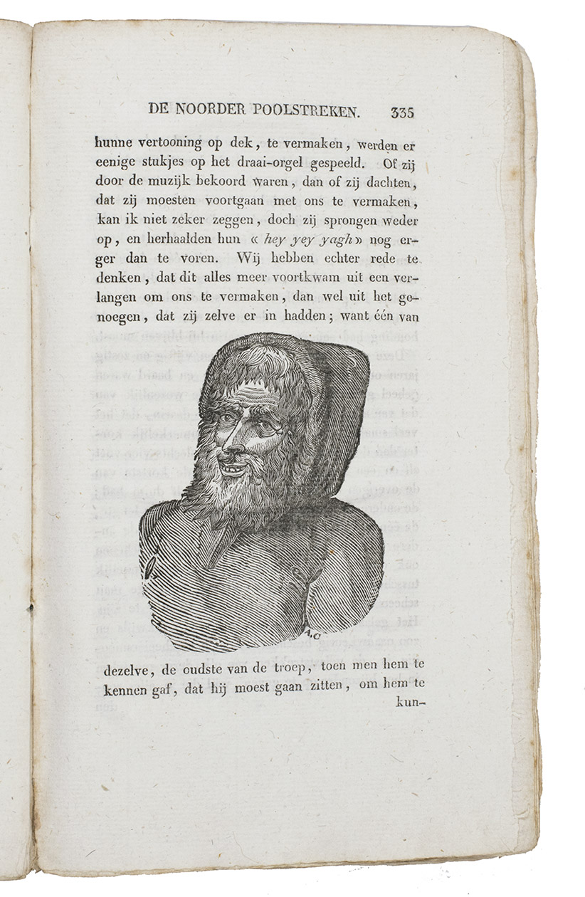 Dordrecht, Blussé and Van Braam, 1822. 8vo. With a folding map of the Northwest Territories or Nonavut (Canada), including the Melville Island, and 2 engravings in the text of a musk ox and an Eskimo. Modern sprinkled orange paper over thin boards with a modern spine label with printed title. [4], 364 pp.