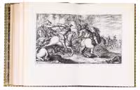 Five series of finely executed and well-printed etchings by Albert Flamen, mostly in their first states and all in early states, the five series showing: 1) cavalry fighting viewed from the thick of the battle; 2) wild and domestic animals on or around a farm; 3) views of Château de Longuetoise and its surroundings in Chalo-Saint-Mars, southwest of Paris; 4) views of several areas near Paris; and 5) pastoral views in an unidentified location. Flamen (ca. 1620?-1693 or soon after), a painter, draughtsman and etcher born in Bruges, worked in Paris from 1648 to 1692. He belonged to the French school of Callot and worked mostly after his own designs.