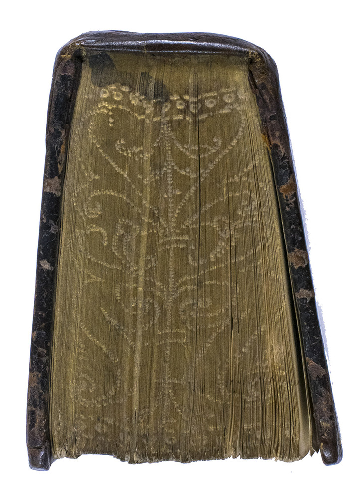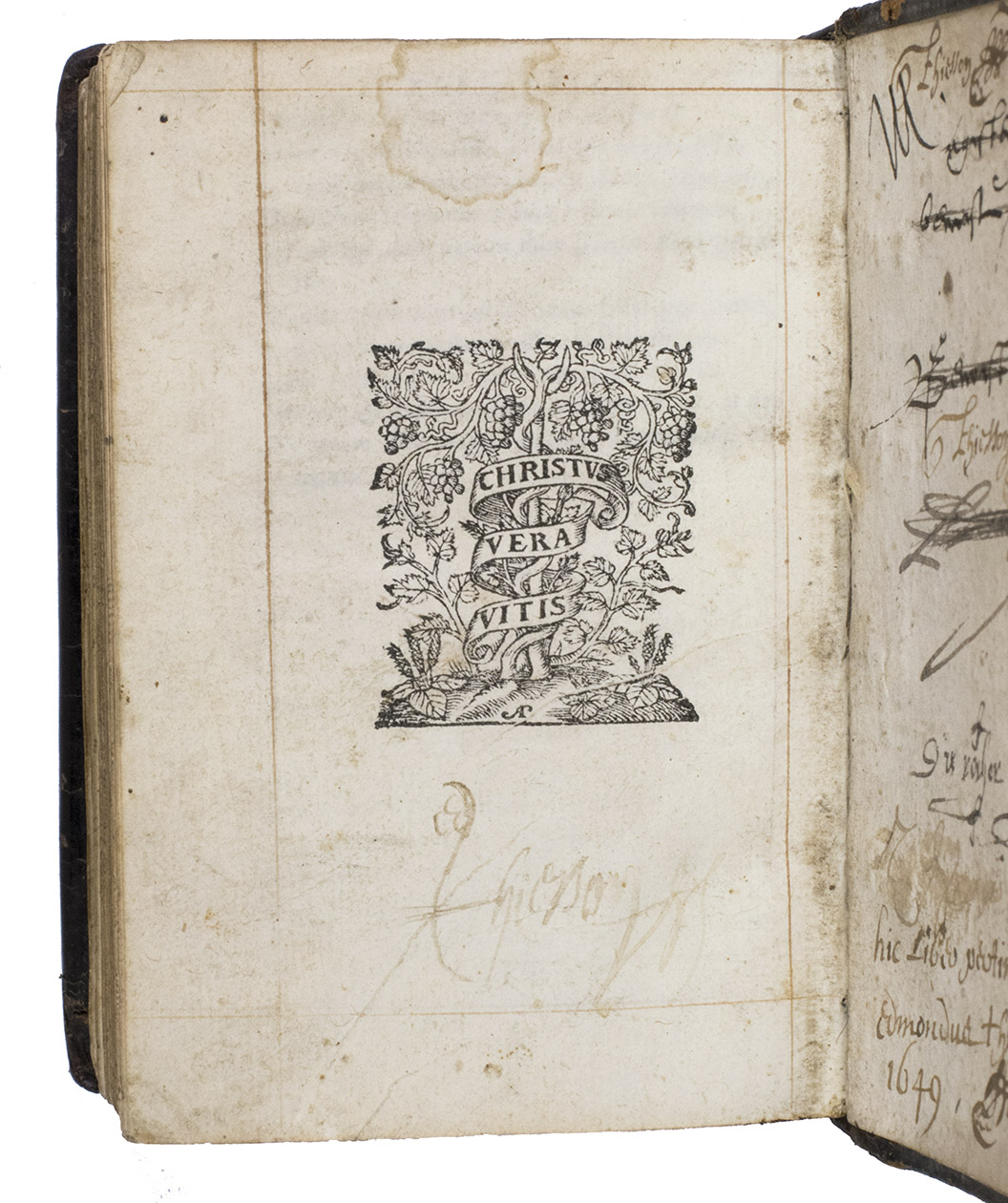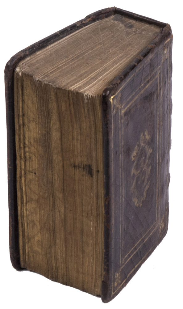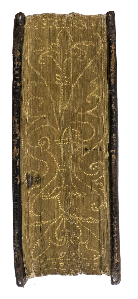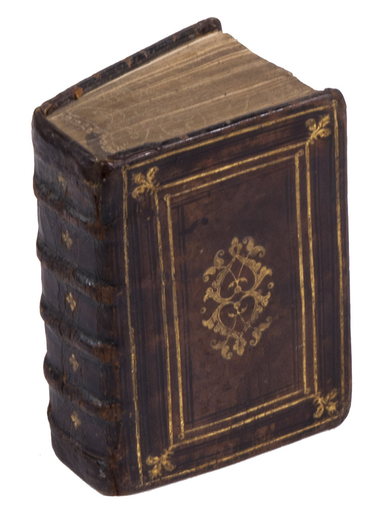 2 works in 1 vol. 16mo (11.4 x 7.7 cm). With woodcut printer's device on both title-pages: "Labore et constantia" and a different one on the verso of the final blank page of the second work: "Christus vera vitis". Ruled in brown/red throughout, 2 decorated initials at the beginning of the first work and 3 in the second work. Contemporary brown leather, gold-stamped frame and ornamental centrepieces on both covers, gold-tooling on spine, gold edges with blind-tooled arabesques. 365, [3]; [24] ll.