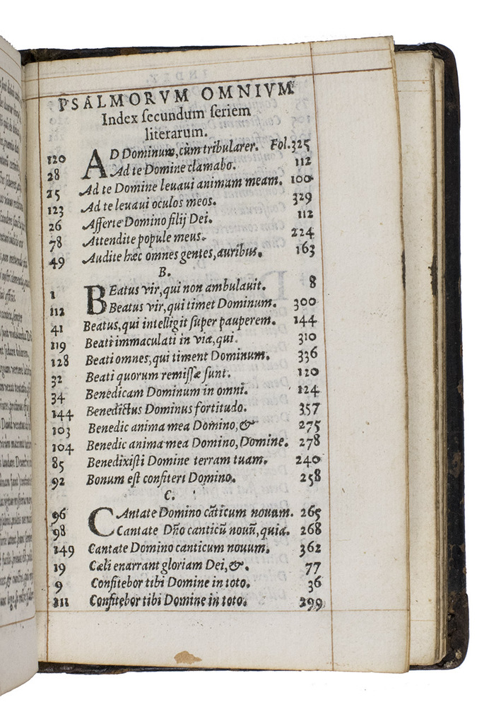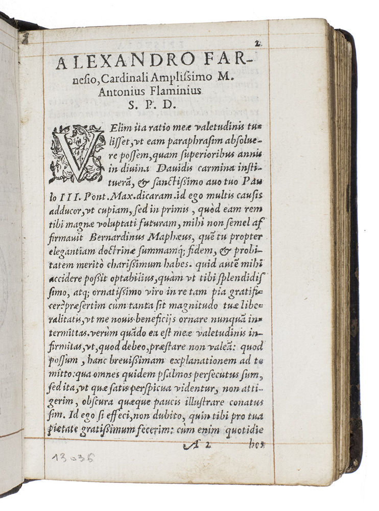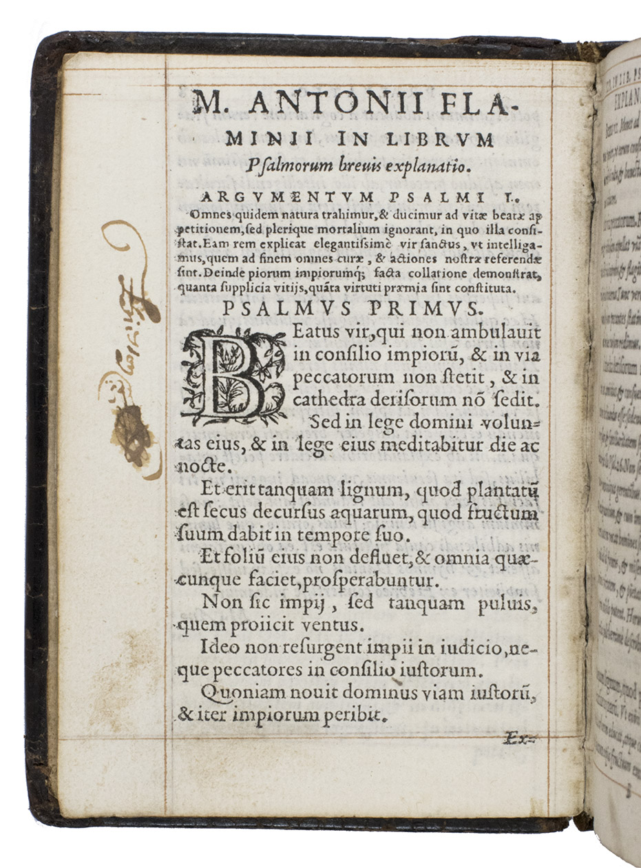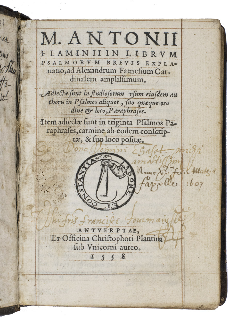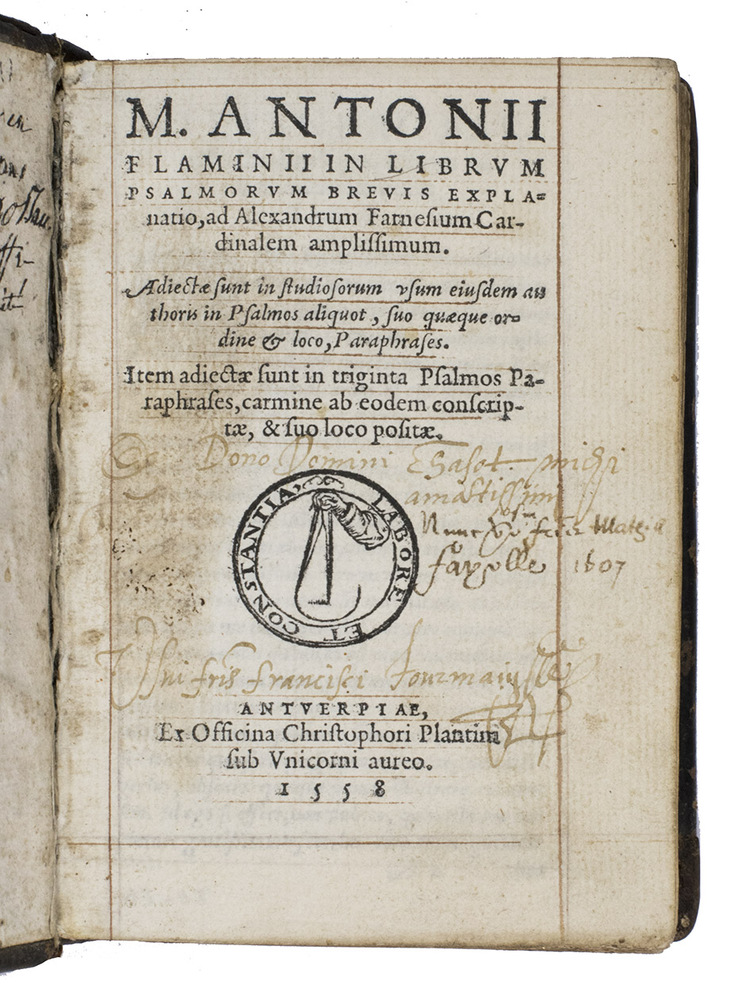 Commentary on the Book of Psalms with religious poetry in an attractive, contemporary binding. The Italian humanist Marcus Antonius Flaminius (Seravalla 1498 - Rome 1550) first published his commentary in 1545. He gives a short summary of each psalm (argumentum), followed by the Latin text of the psalm, its commentary (explanatio) and a paraphrase. He also wrote an additional paraphrase in poetry of 30 psalms. The work is dedicated to Cardinal Alexander Farnese, one of Flaminius's protectors. It was popular and Adams lists editions for 1547, 1551, 1557, 1558 (present copy), 1561 and 1567. The second work contains a series of neo-Latin poems on biblical and religious subjects, dedicated to Margaretha of Valois, the sister of Henry II of France, who knew Latin and Greek and whose praises were sung by many poets. De Rebus Divinis Carmina was first published in Paris in 1550 (BMC STC French, p. 167), and was normally sold together with Flaminius's commentary on the Book of Psalms.