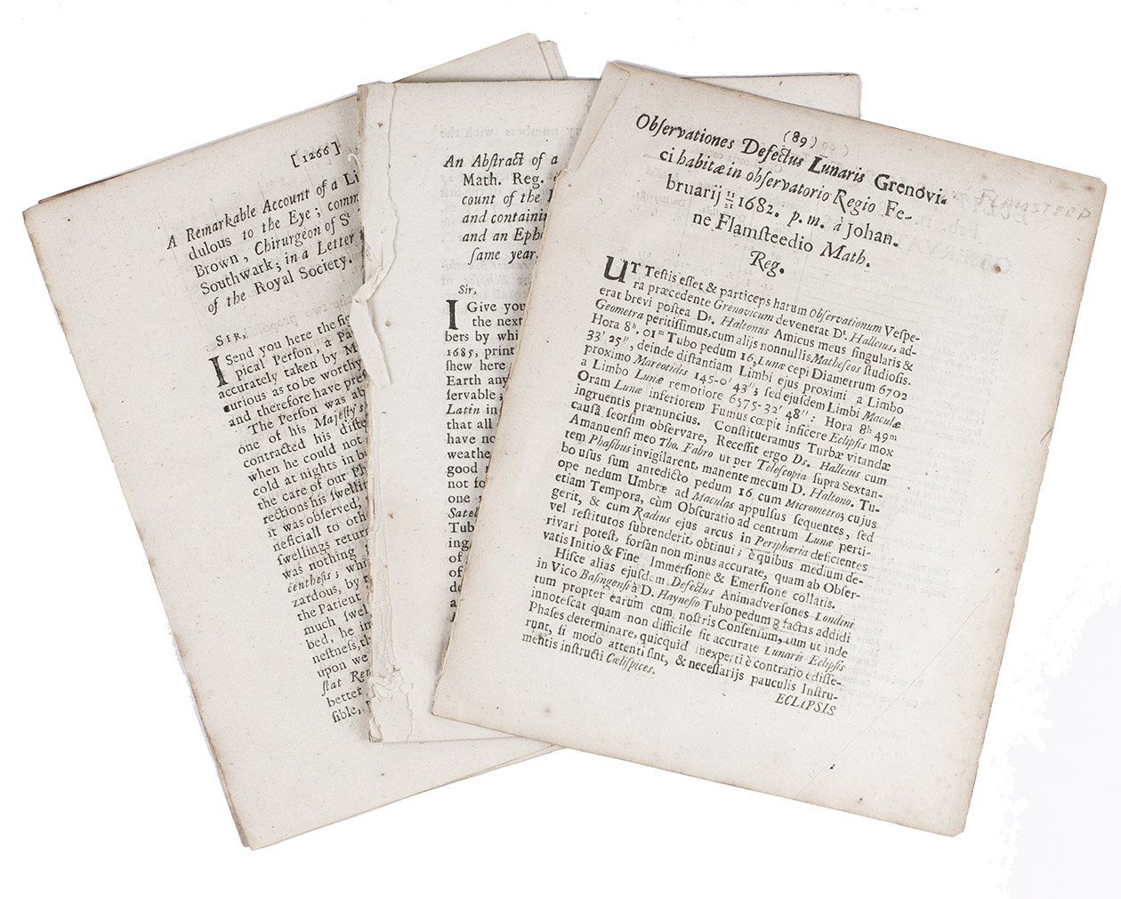 Three astronomical articles (2 in the form of letters) by England's first Royal Astronomer, John Flamsteed (1646-1719) at the Greenwich Observatory from its establishment in 1675, published in the Philosophical Transactions of the British Royal Society in the years 1683 and 1685. The first article gives observations of a 1682 lunar eclipse by Flamsteed himself, Edmund Halley and a certain Haynes. The second gives Flamsteed's calculations of the eclipses of Jupiter's four moons for the coming year 1686, intended in part as an aid to the determination of longitude. The third gives an engraved dial with four scales around its perimeter, with Flamsteed's description of its use to calculate the positions of Jupiter's moons..