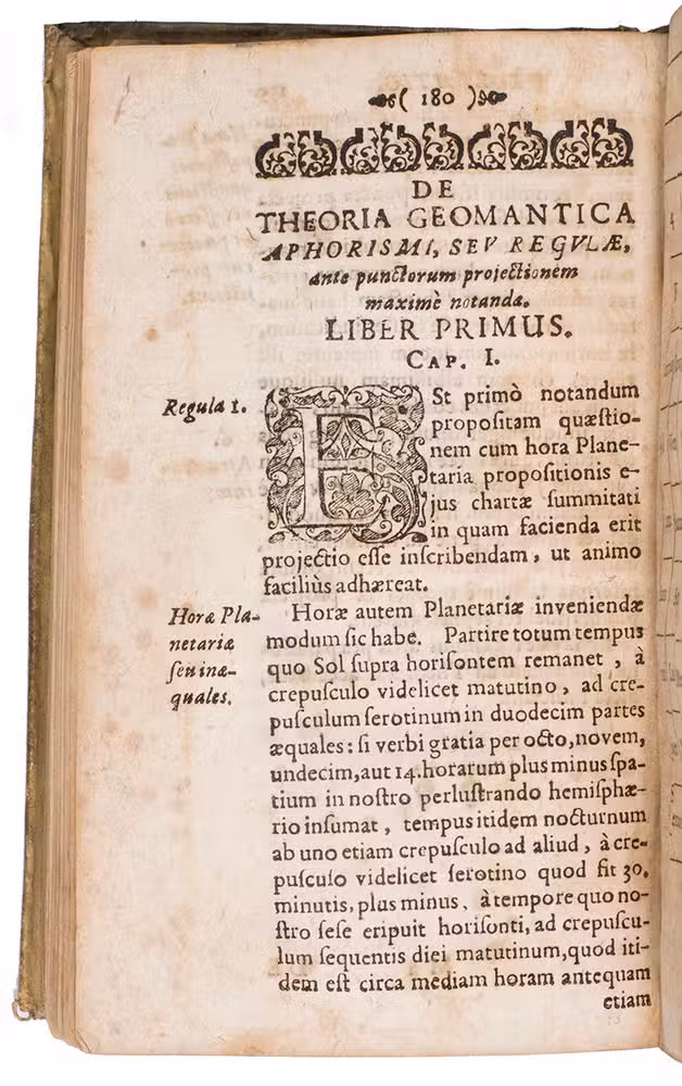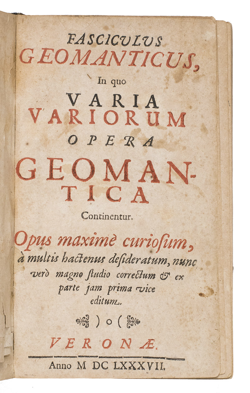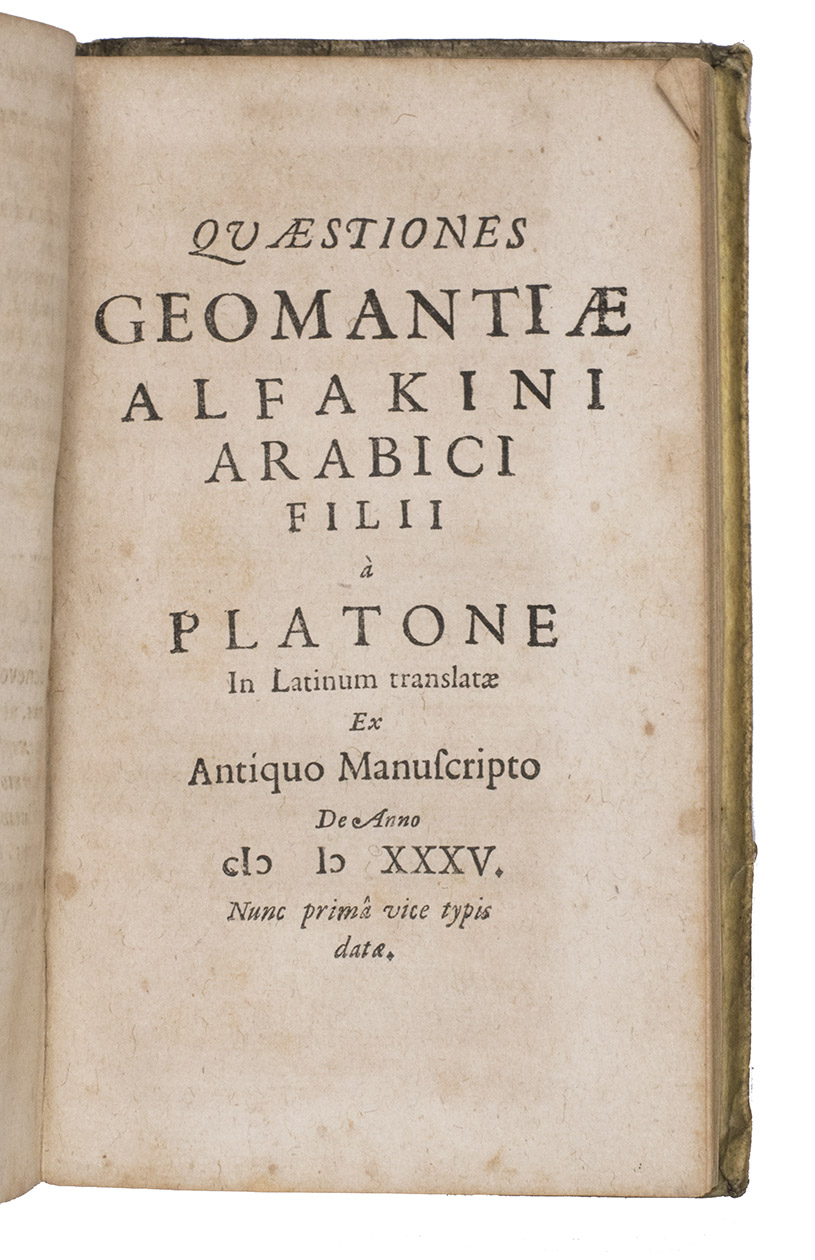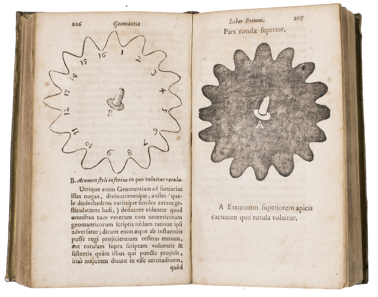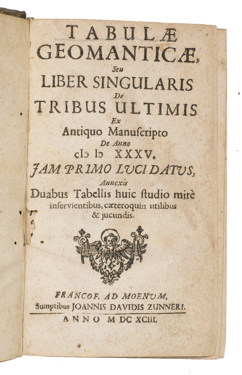 2 works in 1 volume (with ad 1 bound after ad 2). 8vo. Ad 1 with title page printed in red and black, 5 (of 6) large folding letterpress tables, 1 double-page engraved folding plate with 2 engraved illustrations, and some woodcut illustrations and numerous letterpress geomantic figures in text. Ad 2 with 2 letterpress folding tables following text, and nearly 200 pages of letterpress tables with geomantic figures. Contemporary overlapping vellum, with the manuscript title on the spine. 647, [1 blank]; 197, [1 blank] pp.