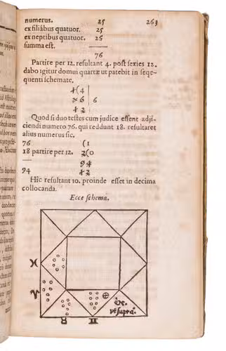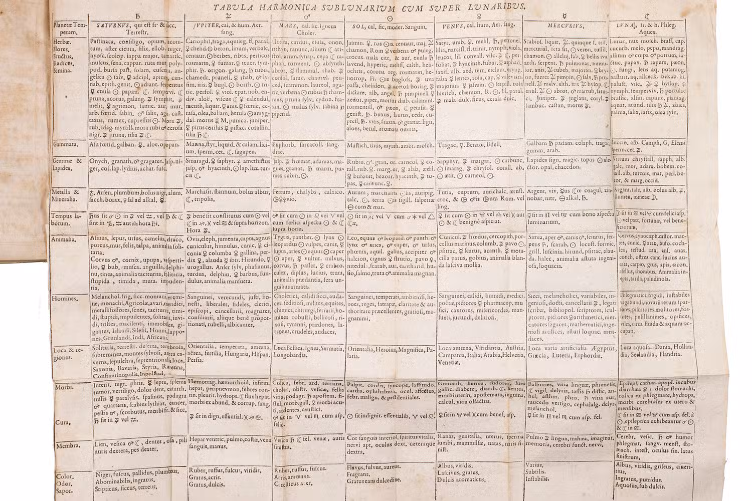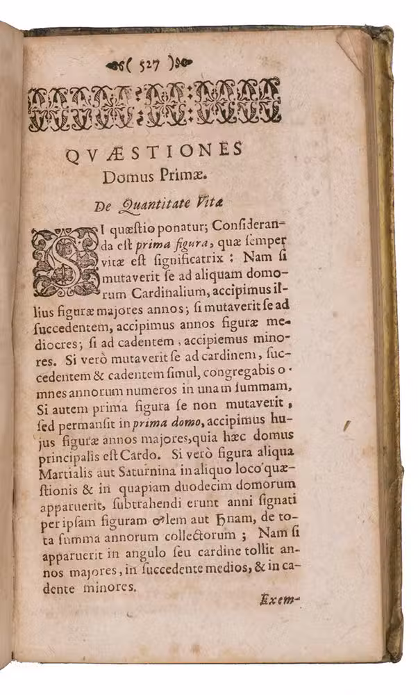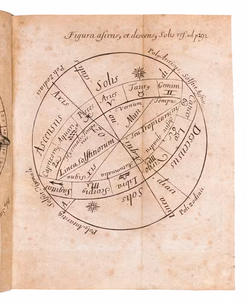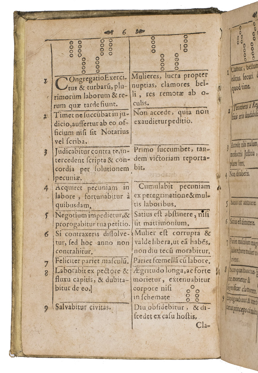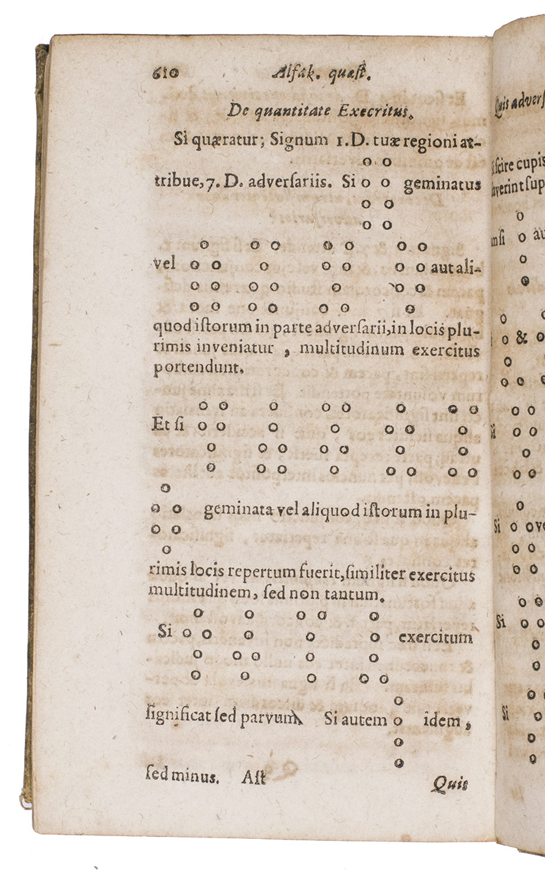 2 works in 1 volume (with ad 1 bound after ad 2). 8vo. Ad 1 with title page printed in red and black, 5 (of 6) large folding letterpress tables, 1 double-page engraved folding plate with 2 engraved illustrations, and some woodcut illustrations and numerous letterpress geomantic figures in text. Ad 2 with 2 letterpress folding tables following text, and nearly 200 pages of letterpress tables with geomantic figures. Contemporary overlapping vellum, with the manuscript title on the spine. 647, [1 blank]; 197, [1 blank] pp.