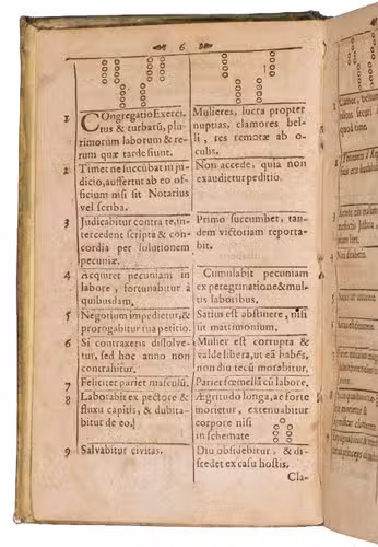 Lacking one letterpress folding table in the main work. Browned throughout, as usual, some occasional smudges, a few tears along the folds of the folding tables, and some wormholes in the first two leaves, resulting in a small hole in the gutter of the title page, otherwise internally still good. Binding soiled and with crudely restored spine. Caillet 4035; Skinner, Terrestrial astrology: divination by geomancy (1980); Thorndike VIII, p. 481-482; VD17, 7692678X & 39120436C.