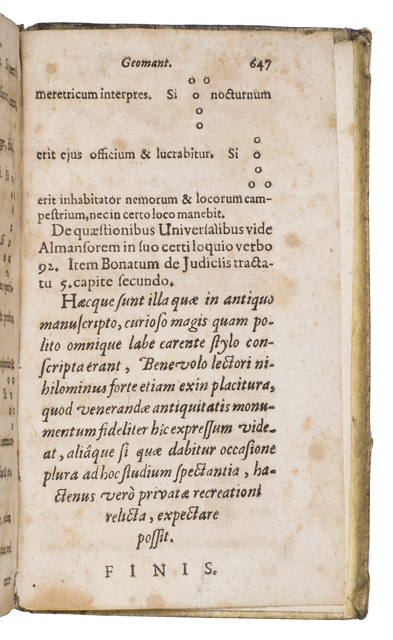 With: (2) Tabulae geomanticae, seu liber singularis de tribus ultimis ex antiquo manuscripto de anno MDXXXV. Iam primo luci datus, annexis duabus tabellis huic studio mirè inservientibus, caeteroquin utilibus & jucundis.