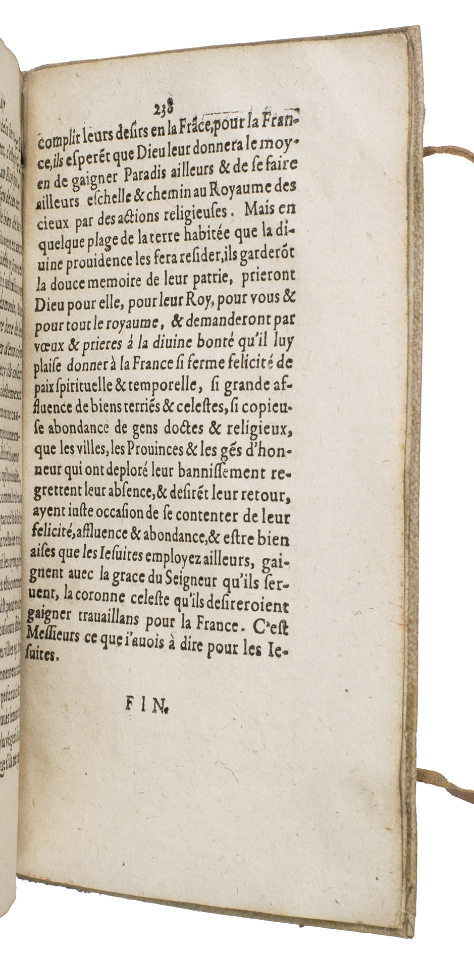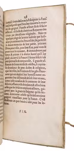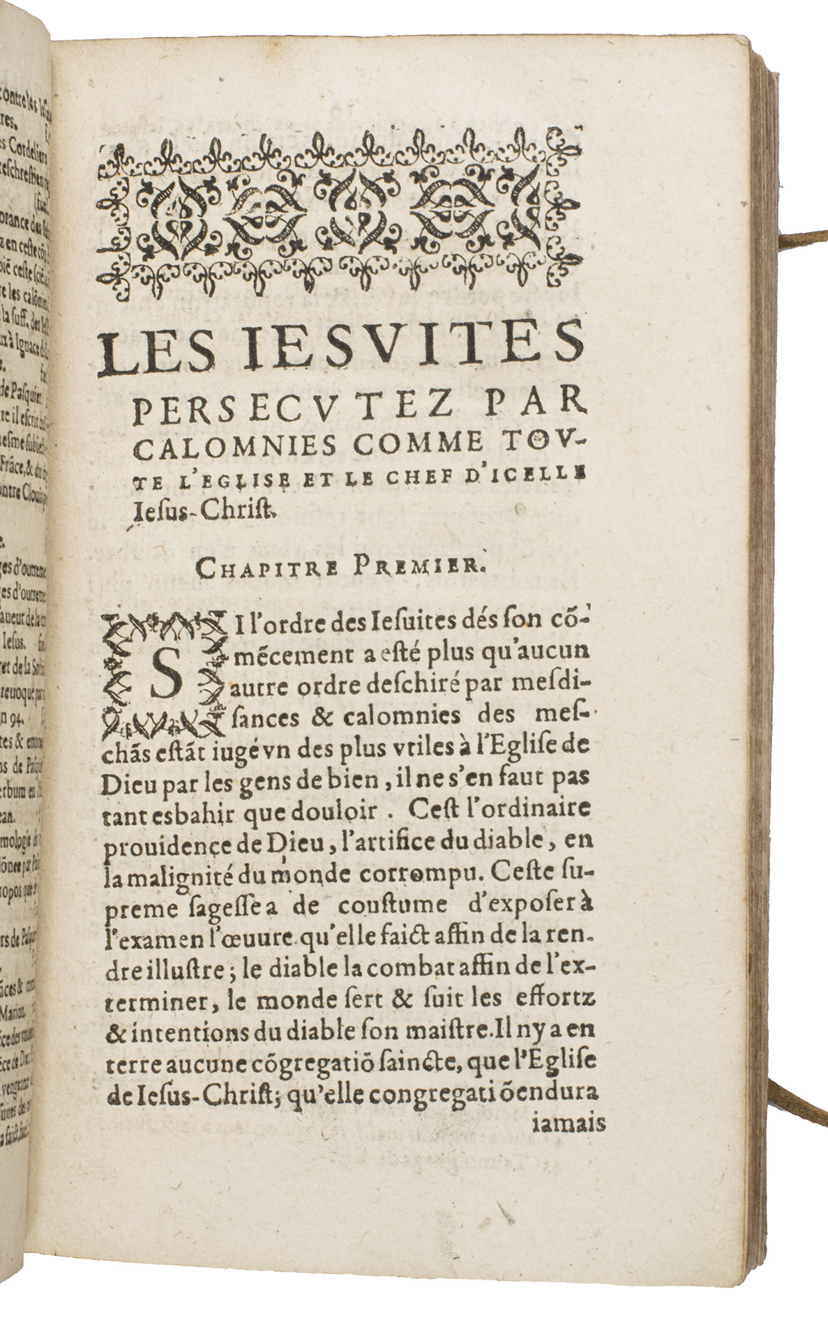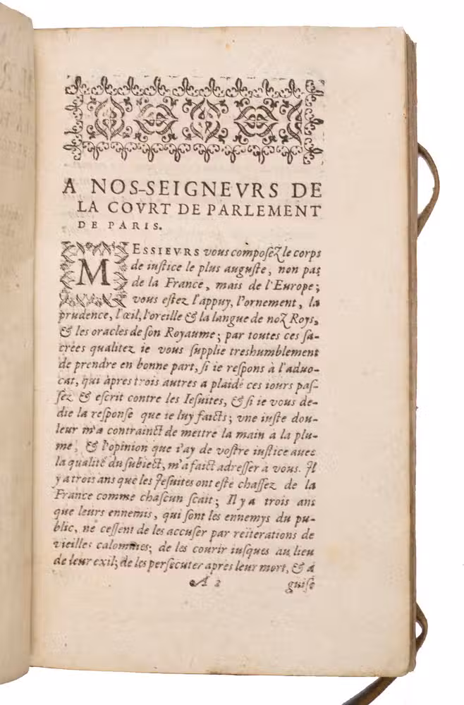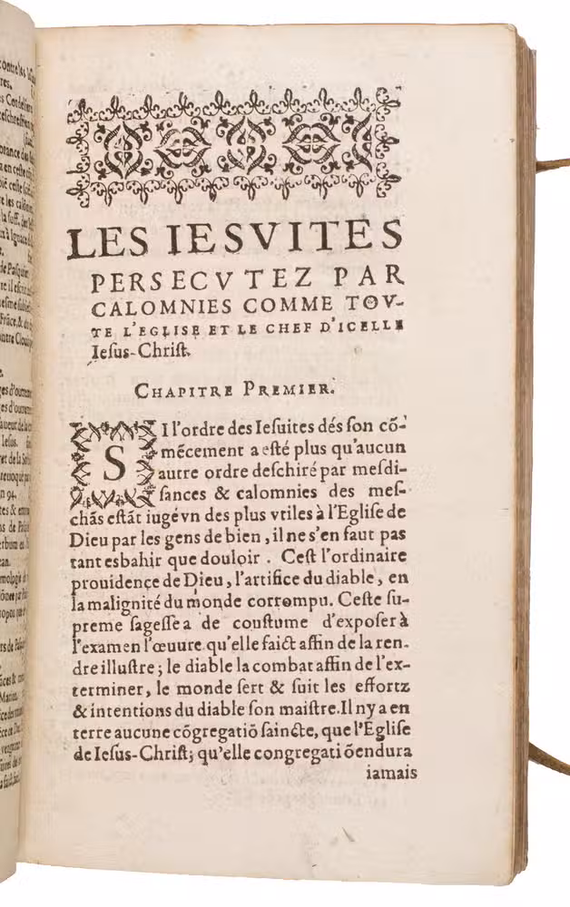 First edition of a work written in defence of the Jesuits, after they were temporarily banished from France in 1594, a few years before. Addressed to the members of the court of the parliament in Paris, it attempts to refute slander against the Jesuits. This first edition is very rare on the market, as we have been unable to find it in any sales records of the past hundred years.