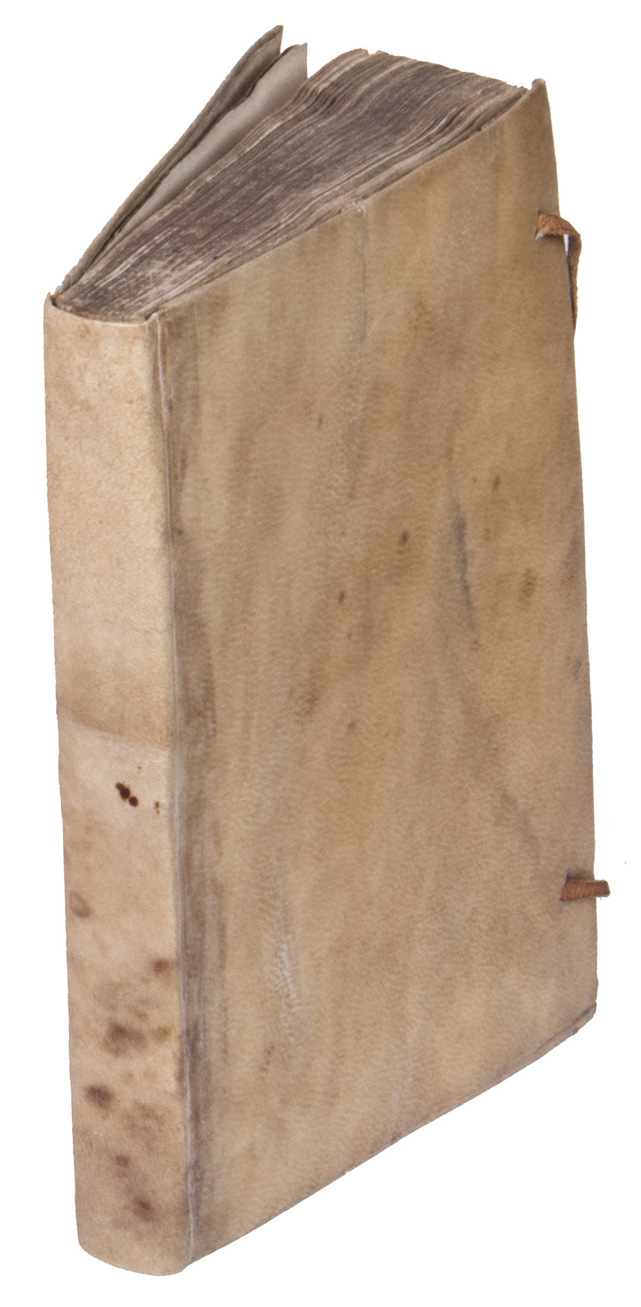 Villefranche, Guillaume Grenier, 1599. 8vo. With a small vignette on the title page built up from typographical ornaments and 2 headpieces built up from typographical ornaments. Later vellum with leather ties. "238" [= 239], [1 blank] pp.