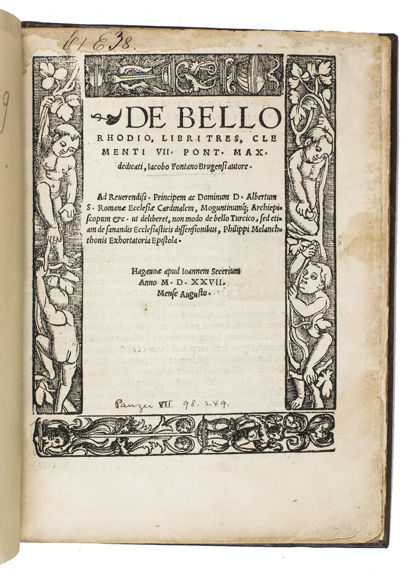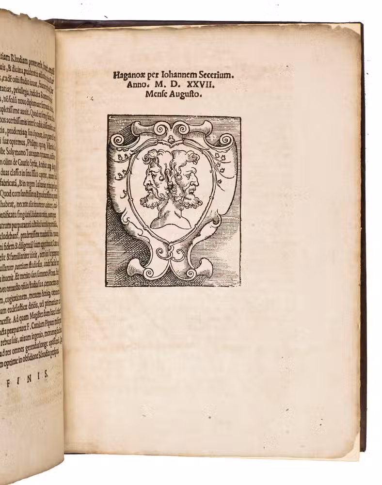 Second edition of the account of the siege and conquest by the Ottomans of the island Rhodos in 1522, written by the lawyer Jacobus Fontanus (also Jacobo Fontano or Jacob Fonteyn; d. after 1538) from Bruges. The work is dedicated to Pope Clement VII.