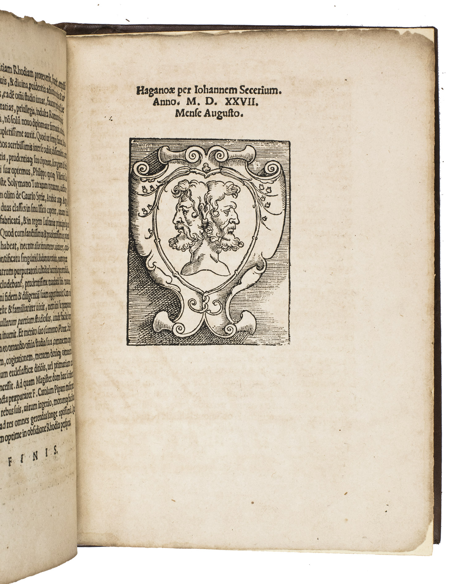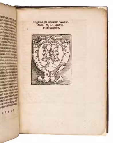 Hagenau, Johann Setzer, 1527. 4to (ca. 21 x 16 cm). The title is set within a woodcut border, the woodcut printer's device can be found beneath the colophon on the recto of the last leaf, and with some woodcut decorated initials. Modern gold- and blind-tooled calf, with the author and title lettered in gold on the front board. [56] ll.