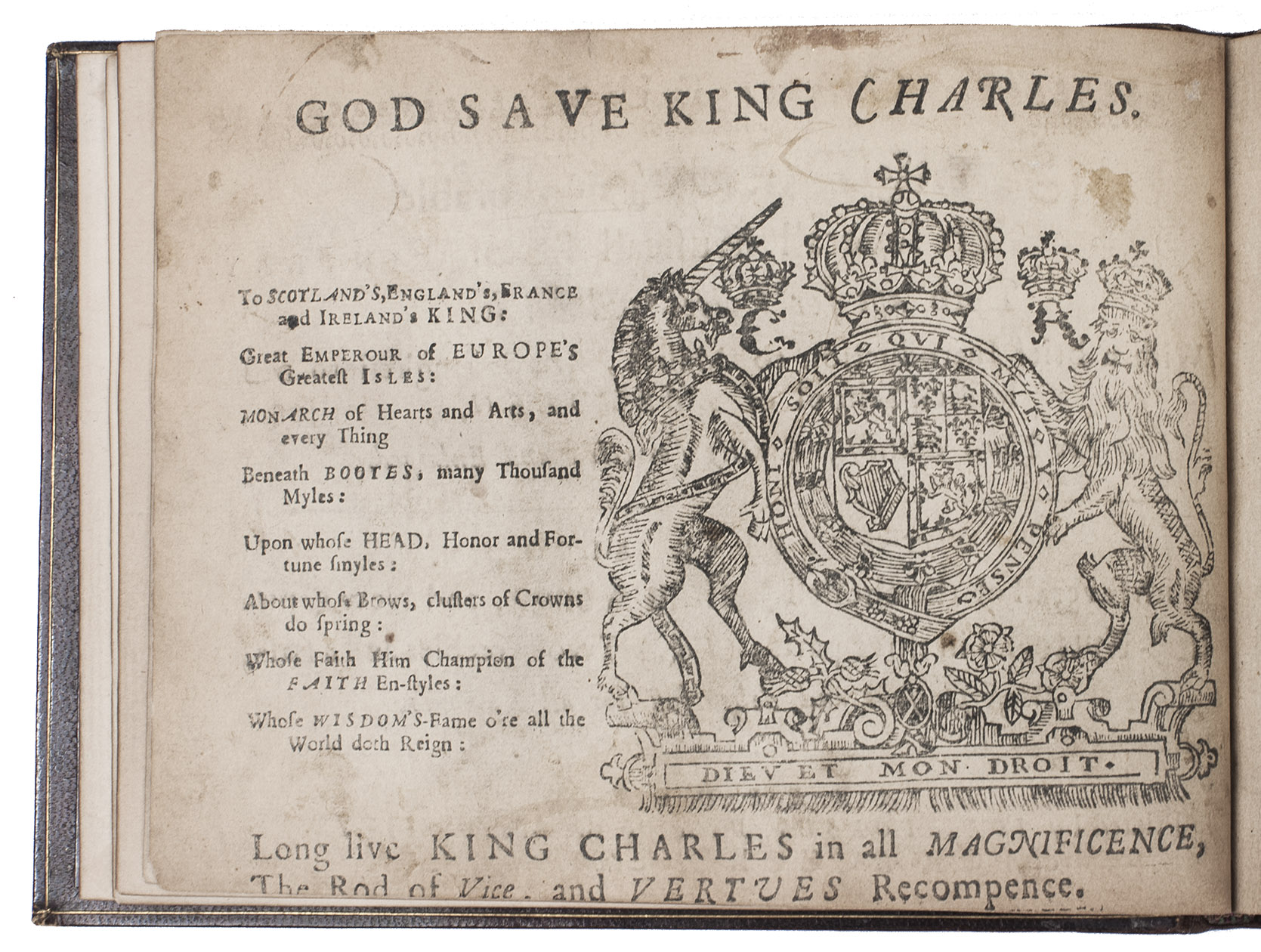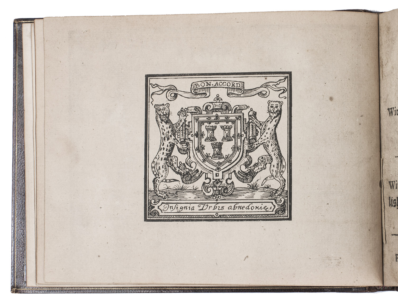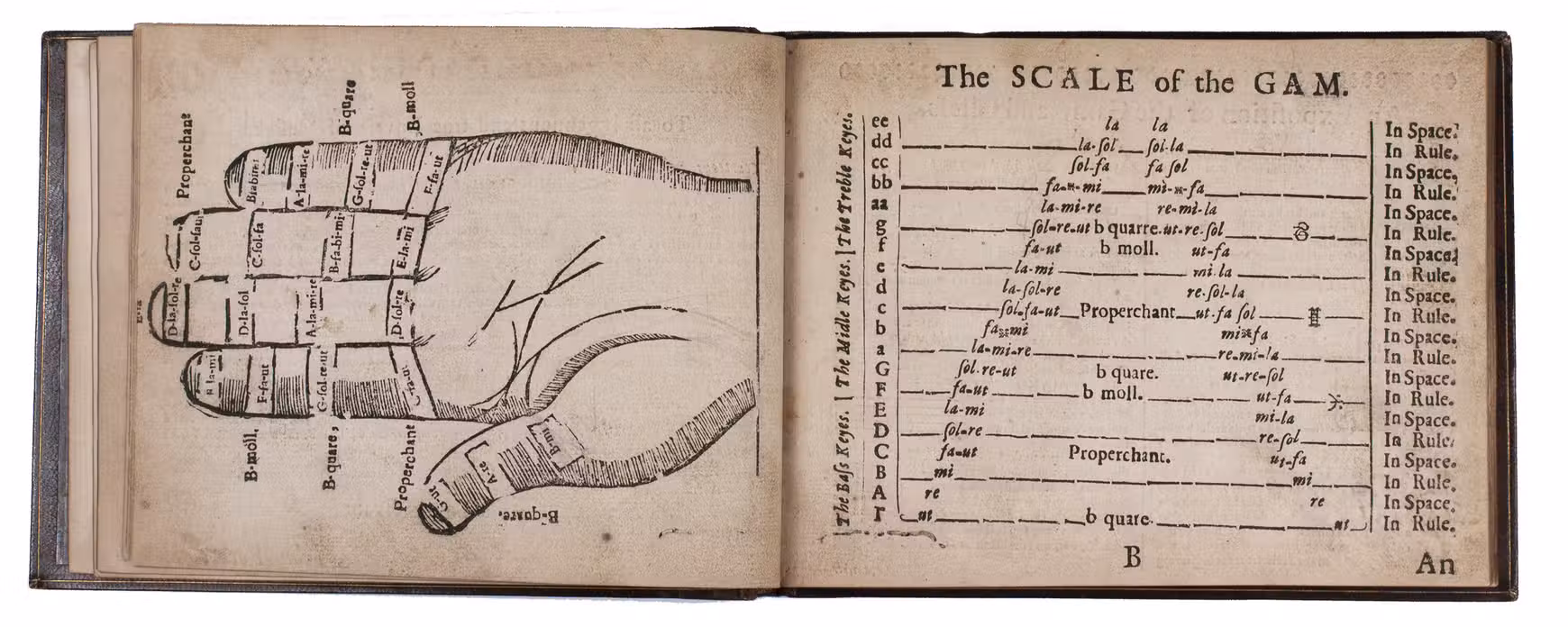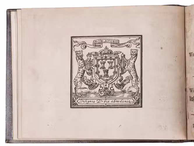 Aberdeen, John Forbes, 1682. Small oblong 4to (12.5 x 16 cm). With a facsimile woodcut title page (with woodcut arms on the back), a general letterpress title page (with the woodcut arms of King Charles Stuart on the back), a full-page woodcut of a human hand, and musical scores throughout. 19th-century brown morocco. [57] ll.