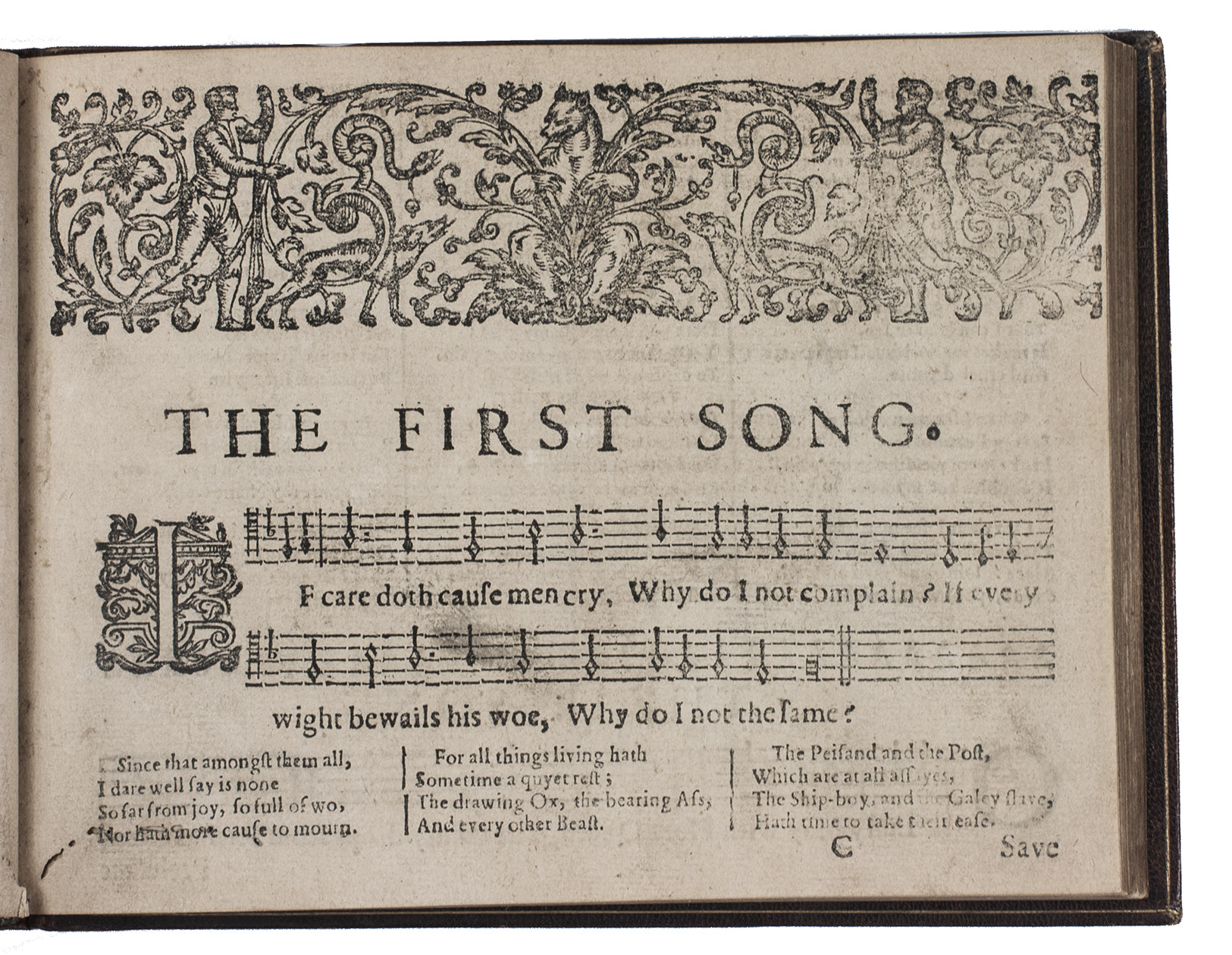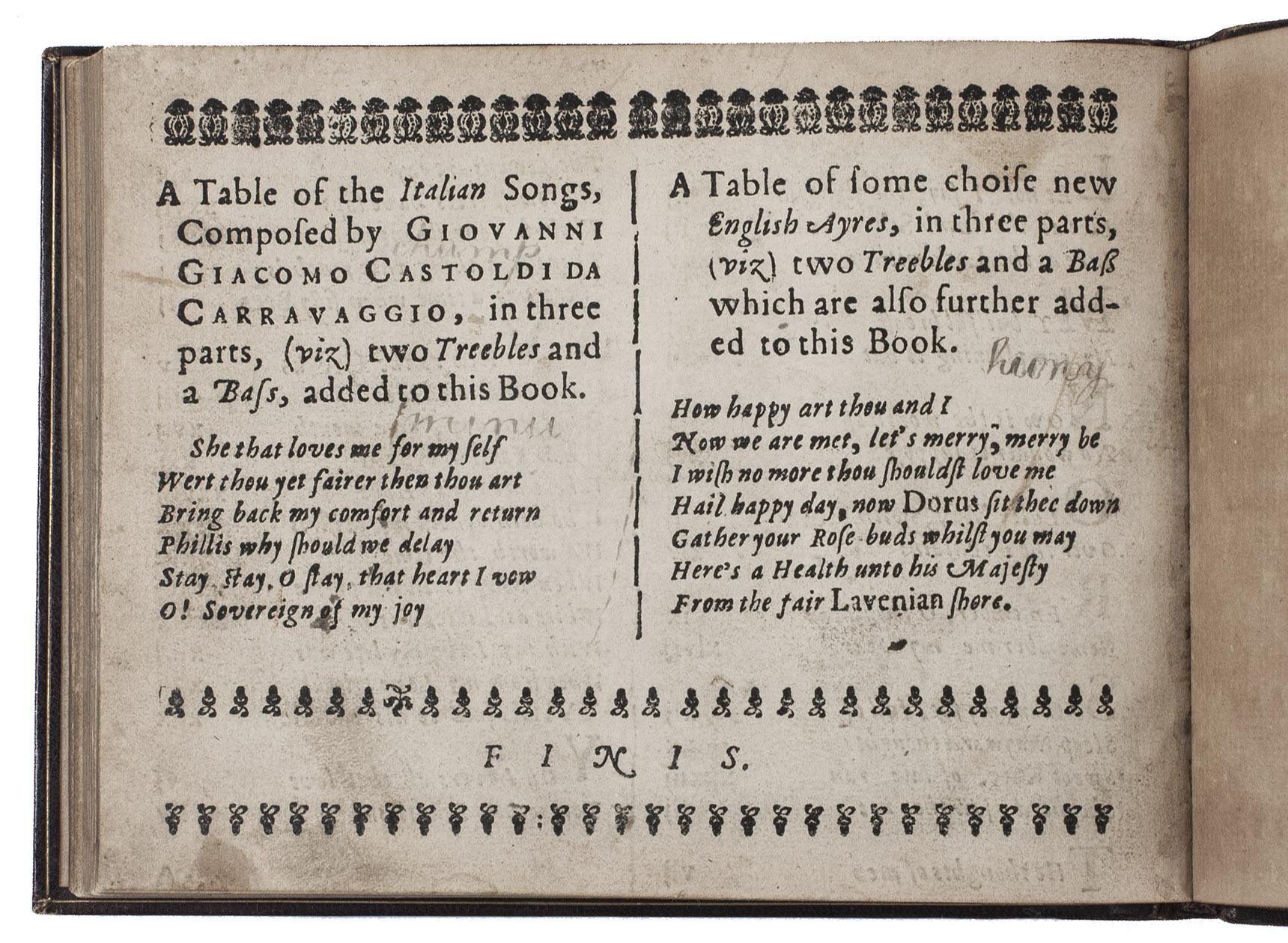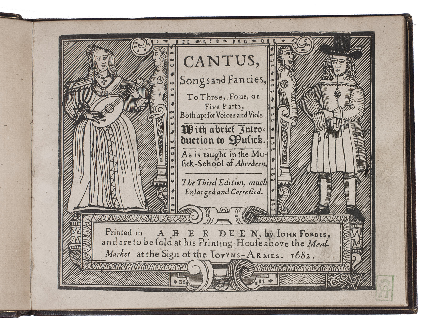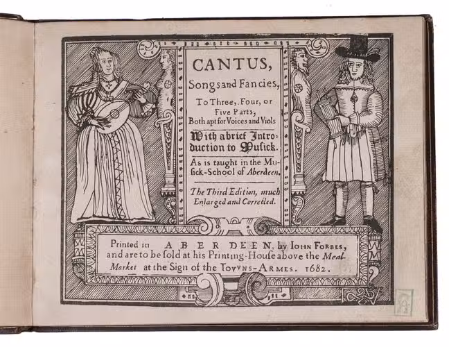 Enlarged and corrected third edition, one of two issues, of the earliest printed secular Scottish songbook, published by John Forbes, book and music printer at Aberdeen. "As the sole publication of secular music in Scotland during the entire sixteenth and seventeenth centuries, the three editions (1662, 1666 and 1682) of Cantus, songs and fancies by the Aberdeen printers John Forbes and son are of historical significance. ... the three editions present the 'cantus' voice of sixty-four songs, about a third of them unique to Scotland and nine found so far only in Songs and Fancies" (McLucas). Added to the present third edition are six "balletti" after Giovanni Giacomo Gastoldi (b.1555), and some popular English songs by Henry Lewis and Dr. Wilson.