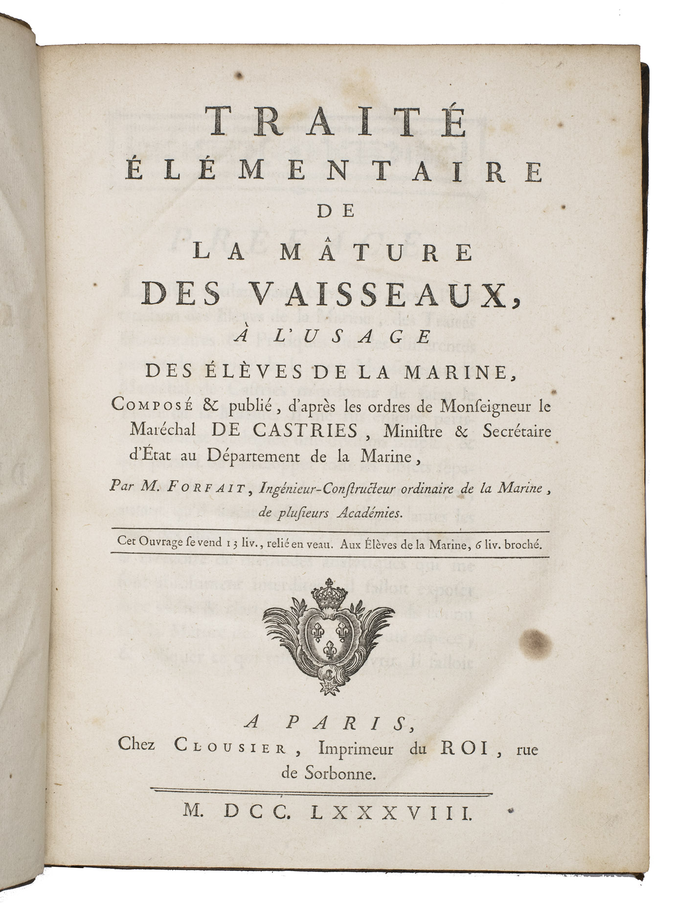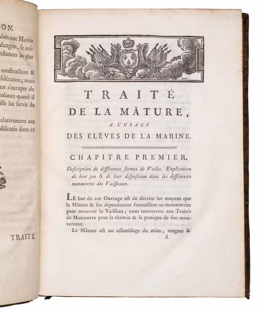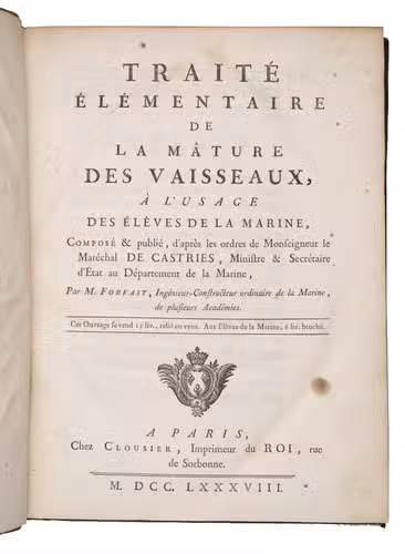 Traité élémentaire de la mâture des vaisseaux, à l'usage des élèves de la marine, composé & publié, d'après les ordres de monsigneur le Maréchal De Castries, ministre et secrétaire d'Etat au Département de la Marine.