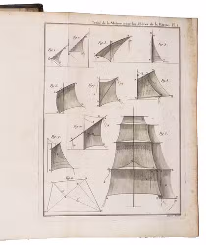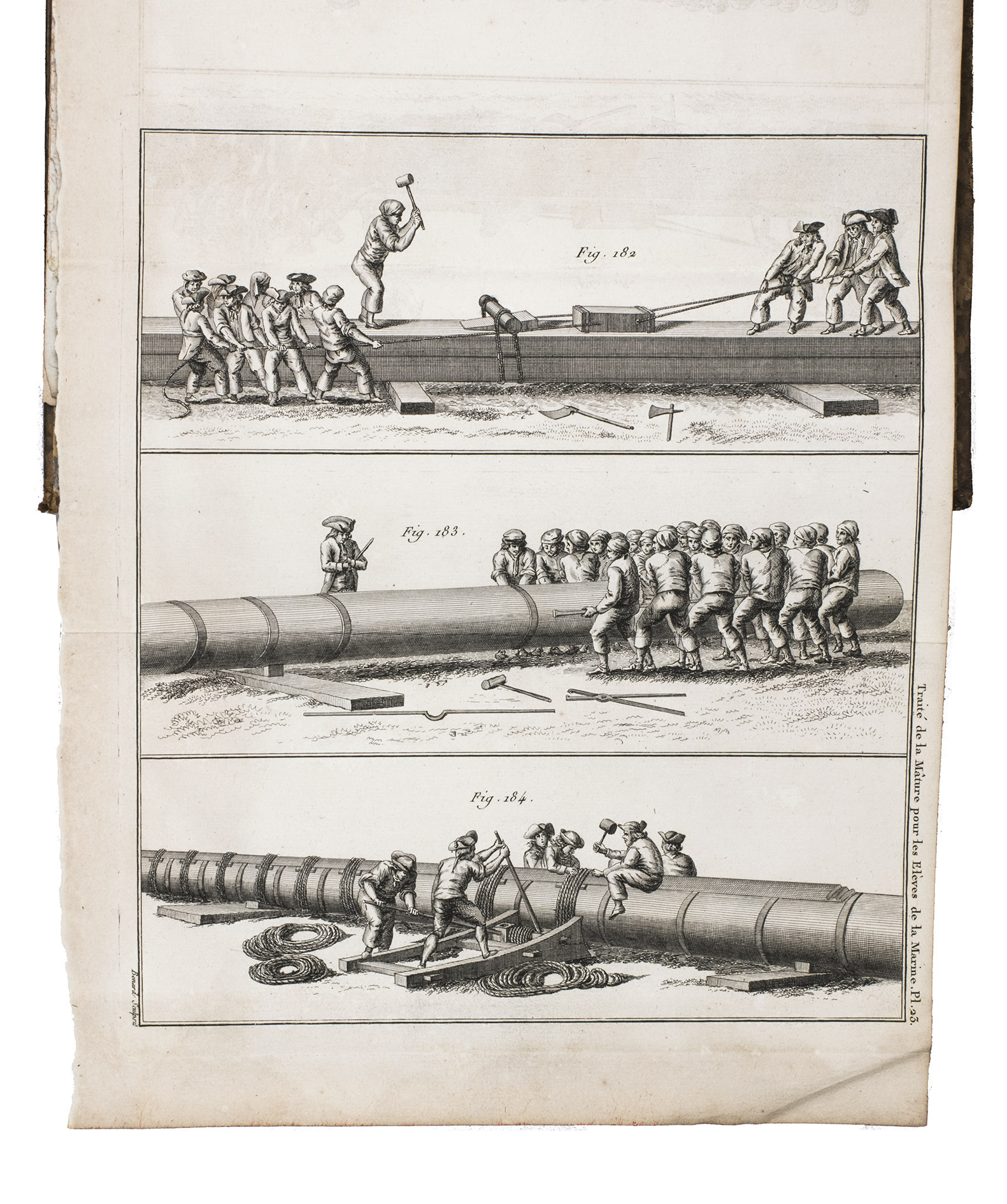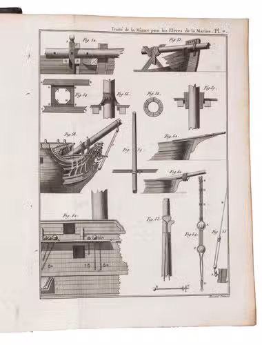 Original edition of an extensive manual on all aspects of ship building, with a focus on ships for the French navy. The section on masting begins with two chapters on different rigs, and includes a great deal of technical and practical information, including on sails and the rigging of a ship, not only for the large sea-fearing ships, but also for the smaller vessels. The plates show typical rigging for various vessel types, the making of compound masts, and an attractive three-part plate of a crew constructing a large mast.