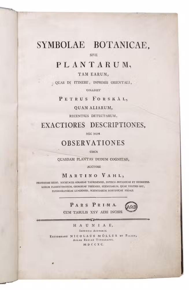 Symbolae botanicae, sive plantarum, tam earum, quas in itinere, inprimis orientali, collegit Petrus Forskål, quam aliarum, recentius detectarum, exactiores descriptiones, nec non observationes circa quasdam plantas dudum cognitas.