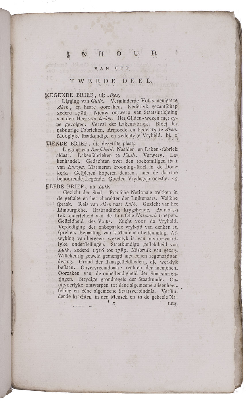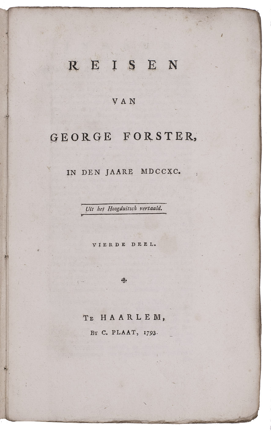 Very rare Dutch translation of the greater part of Forster's Ansichten vom Niederrhein, von Brabant, Flandern, Holland, England und Frankreich (1791-1794), an account of his travels through Germany, Belgium and the Netherlands, accompanied by the famous Alexander von Humboldt. The account is praised for its literary qualities. The translation was made before the final part of the original German edition appeared, so that it omits the parts dealing with France and England.