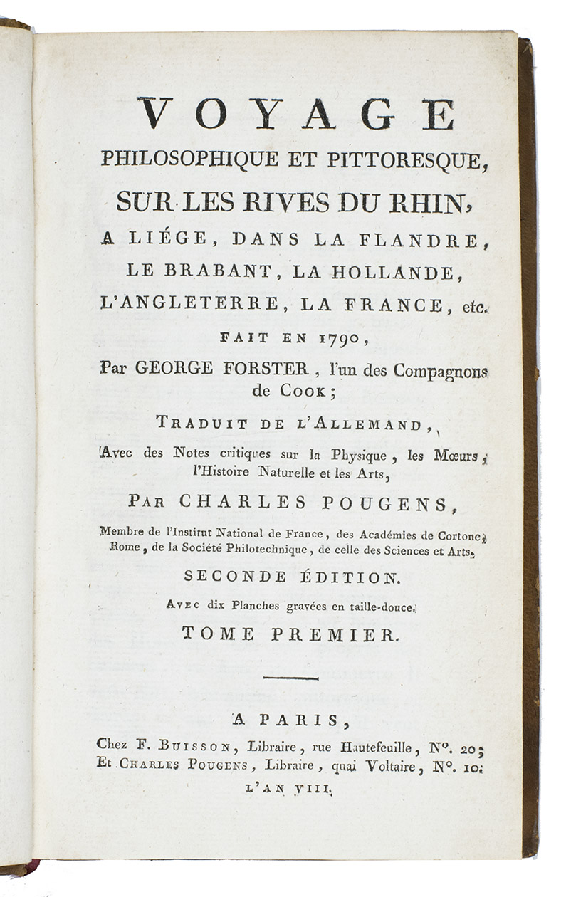 Second French edition of what is considered Forster's major work, Ansichten vom Niederrhein. Forster's fame was instantly established when he published an impressive account of James Cook's second voyage around the world in 1778-1780. The present work details Forster's travels with Alexander von Humboldt to France, Germany and the Netherlands, intertwined with observations on politics, history, nature, and the arts and sciences. Fusing Enlightenment with early Romanticism, it "consolidated Forster's reputation as the master of subjective 'artistic' observation and description, which had a profound impact on the travel writing and landscape painting of the era" (Reusch).