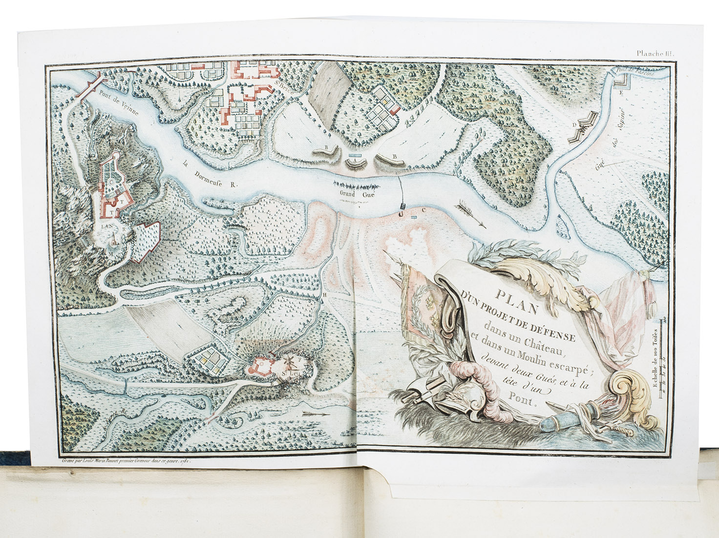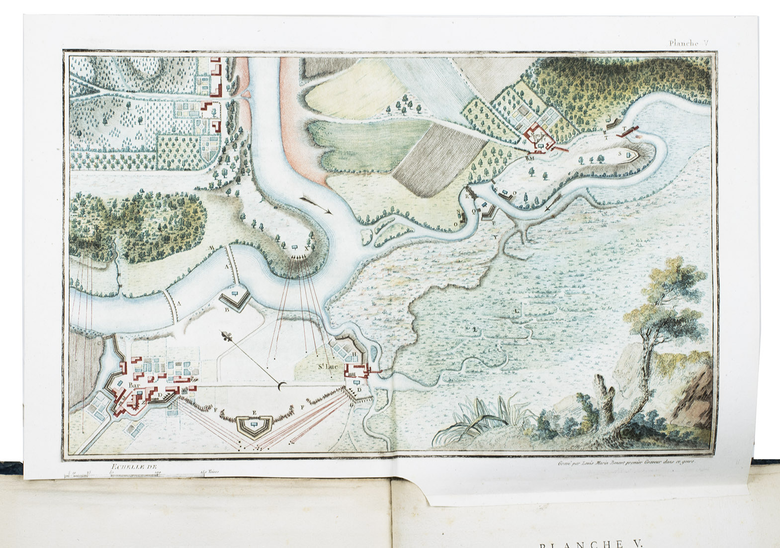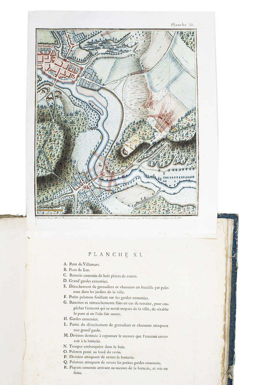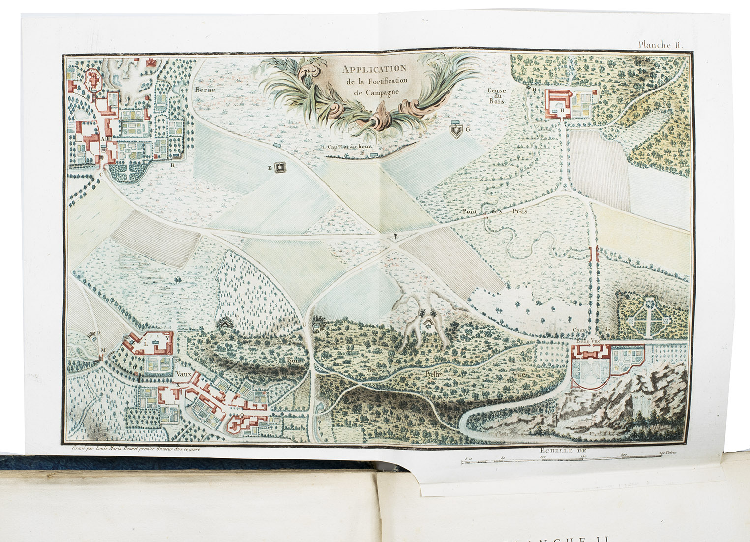 Rare first edition of a manual of military strategy and cartography with elegant illustrations colour-printed in crayon-manner by the inventor of this technique, Louis Marin Bonnet. Charles Louis François Fossé (1734-1812) was a military engineer who distinguished himself in active service during the Seven Years War and as a military cartographer. The present work is a manual for the defence of and attack on small military positions (like a farmhouse, small forest, bridge etc.). In the second part Fossé explains the rules for charting landscapes and buildings on military maps, including the meaning of the different colours, and how to indicate the shooting range of the positions. The 11 topographic maps follow the main text, each hinged to the head margin of a letterpress caption page (verso blank) with an extensive list of features in the plates, keyed to them by letters and/or numbers. The maps fold up (and the folding ones then open out to form a double page) so that the reader can view the map above the